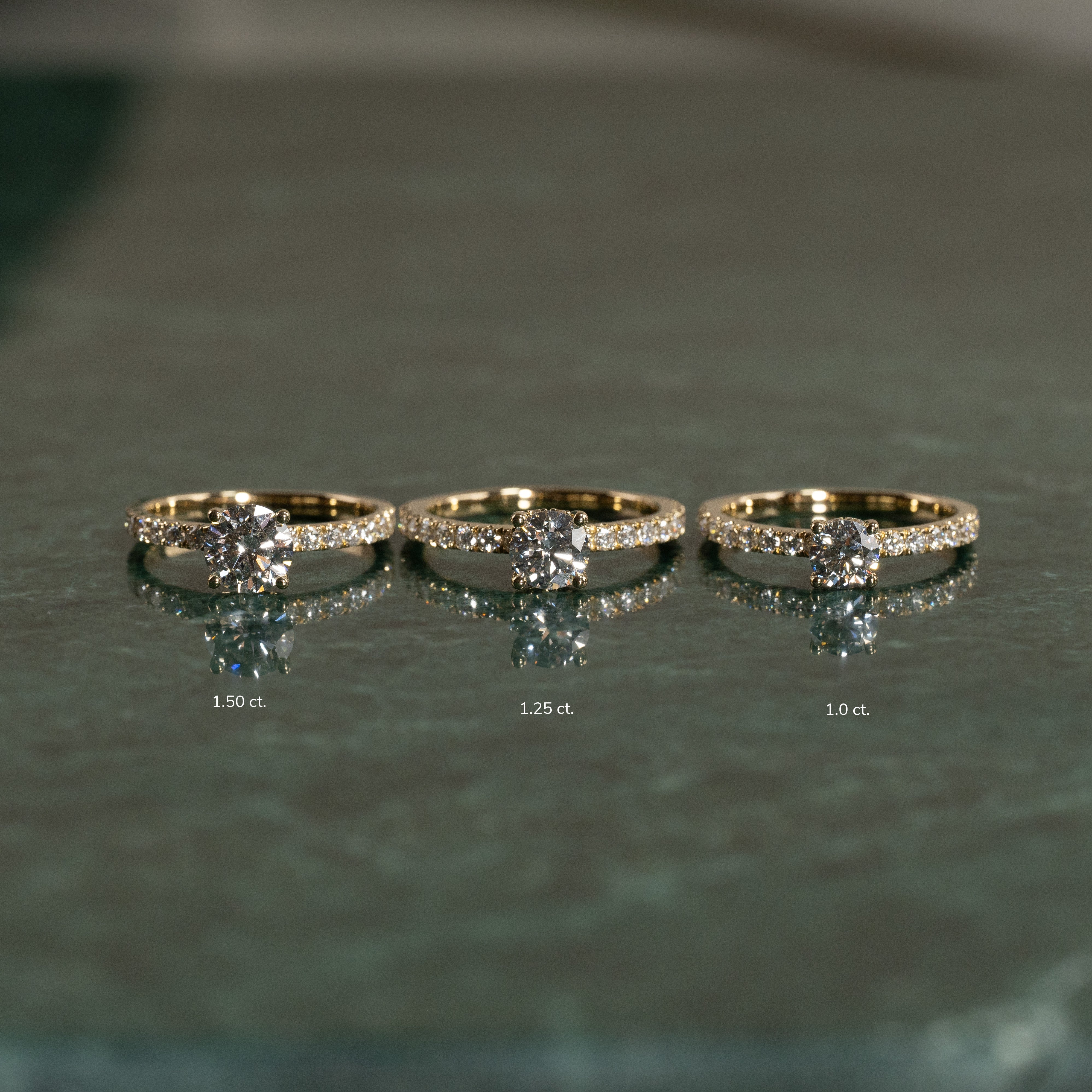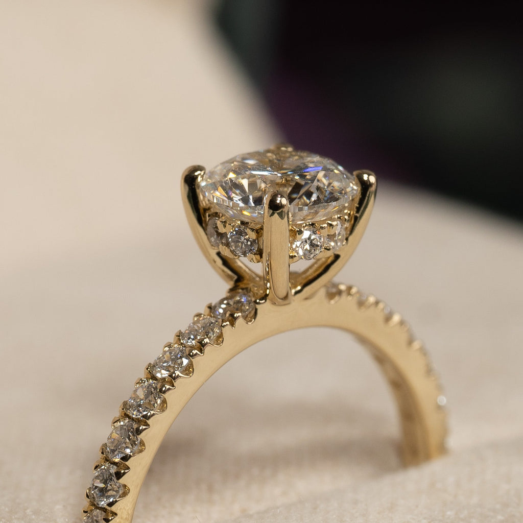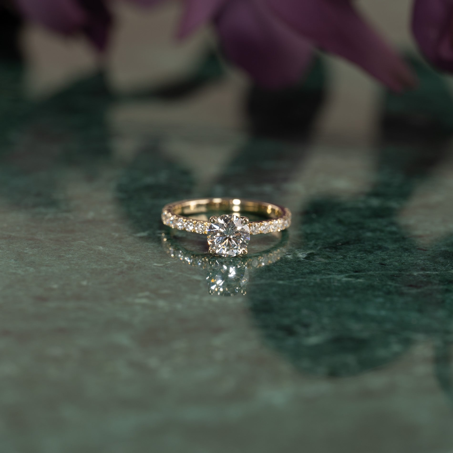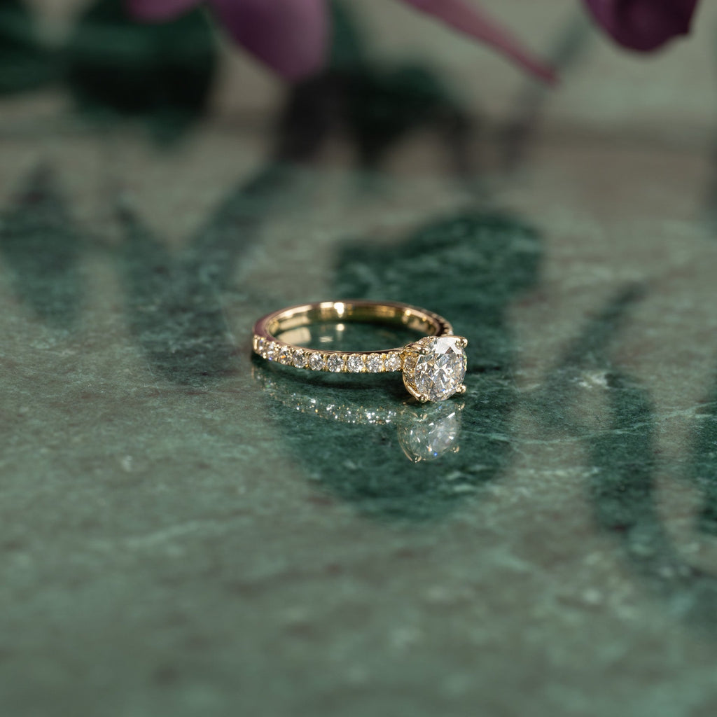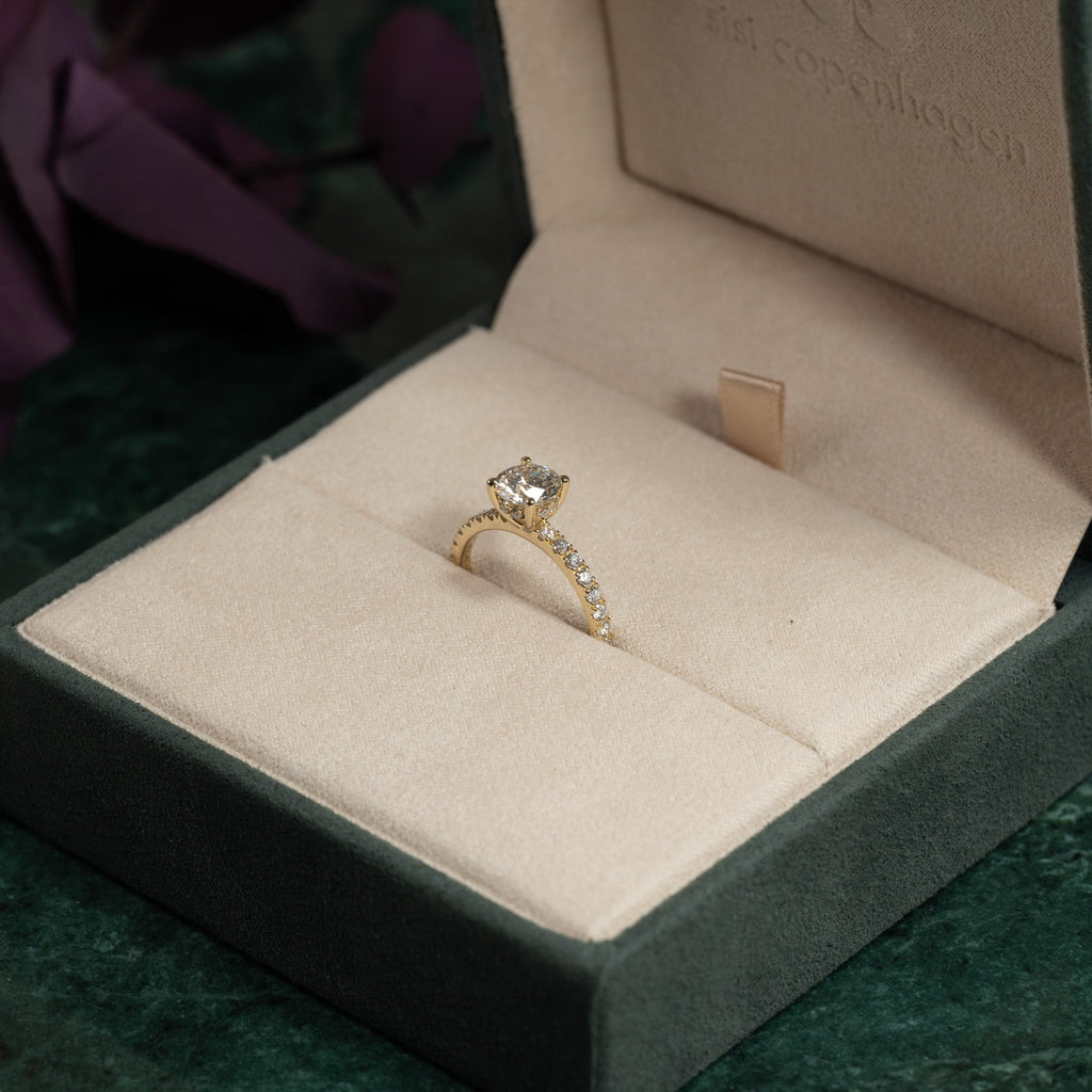 Nydelig ring i 14 karat gull med laboratoriedyrkede diamanter. Ringen består av 1,0 ct. briljant som en sentersten, klassisk satt med hidden-halo - en krans av små diamanter som sitter rundt senterstenen. Ringen er også satt med diamanter på øvre halvdel av ringskinnen - totalt 0,5 ct. diamanter som sidestener.