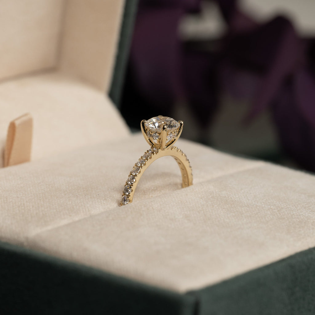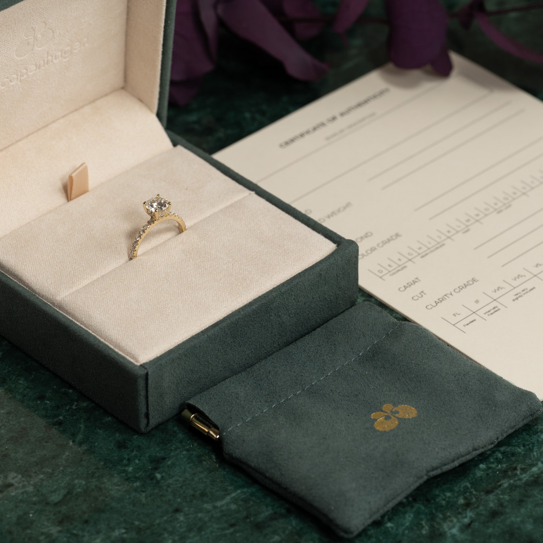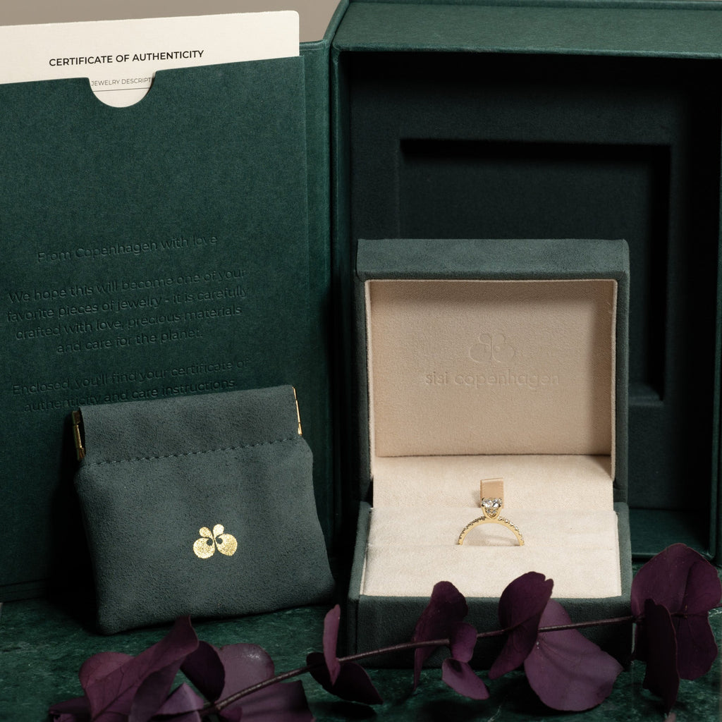 Smykkene kommer i vår Diamond Collection-gaveboks med smykkeske, pouch, ekthetsbevis og IGI-diamantsertifikat på senterstenen.