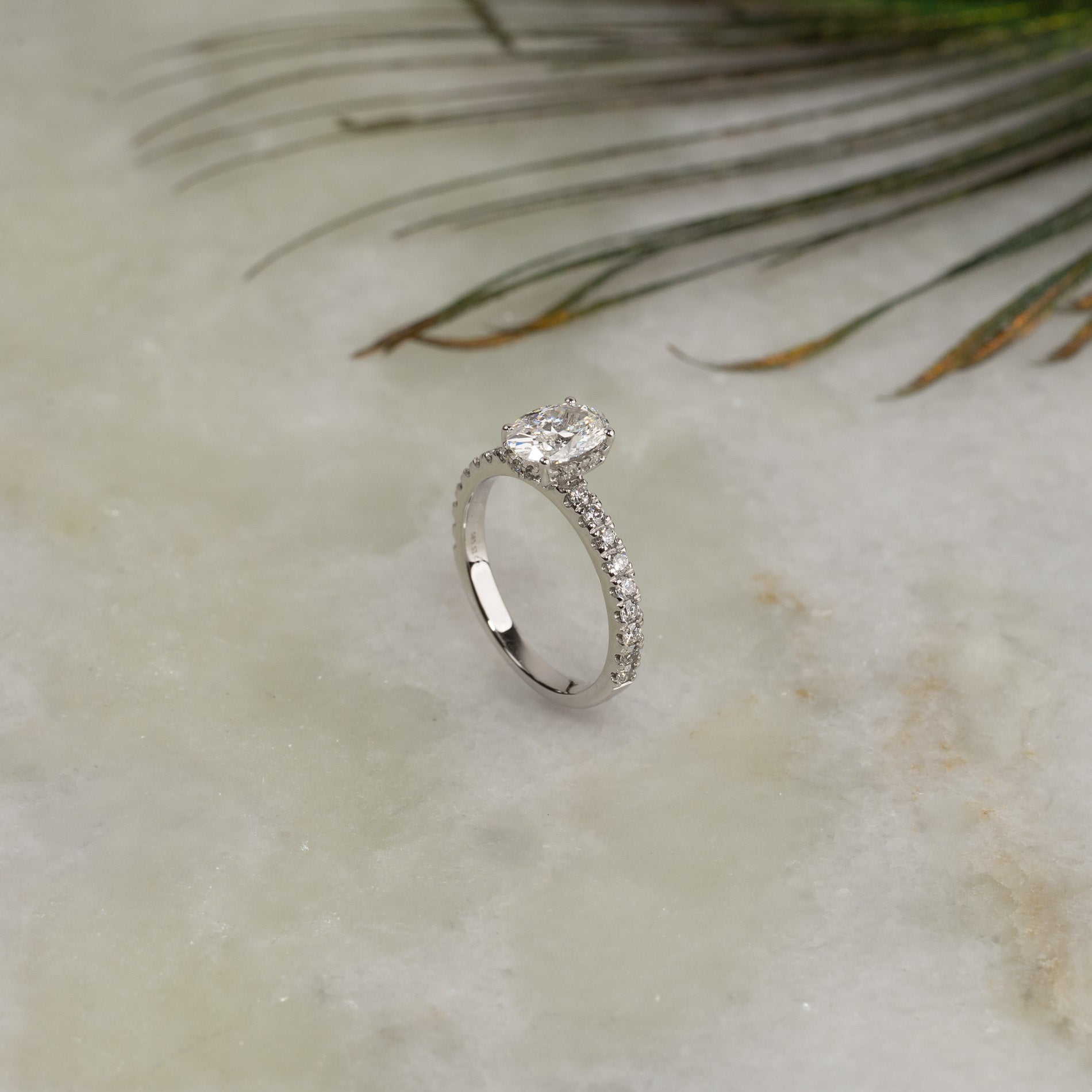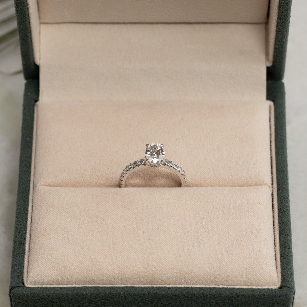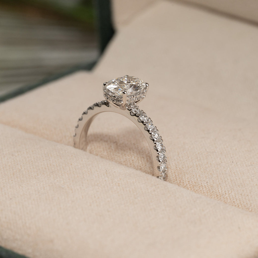Vakker ring i 14 karat hvitt gull med lab-grown diamanter. Ringen har en 1,0 ct. oval-slepen diamant som midtstein, elegant innfattet med en hidden halo, en krans av små diamanter som omkranser midtsteinen på selve innfatningen. I tillegg er ringen besatt med diamanter på den øvre halvdelen av ringskinnen, noe som fullfører designet og gir et harmonisk og strålende uttrykk.