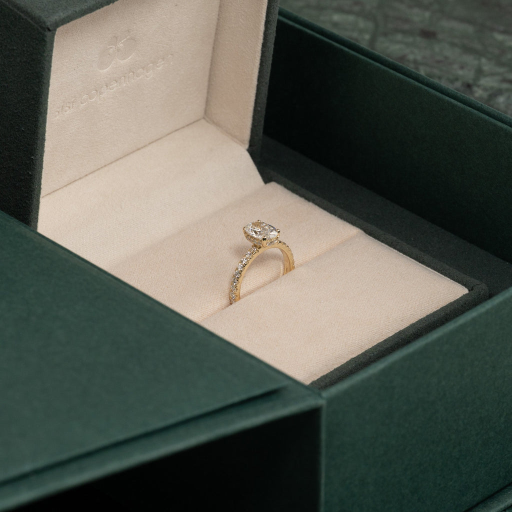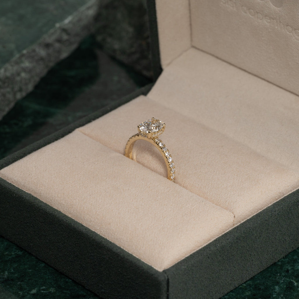 Vakker ring i 14 karat gull med lab-grown diamanter. Ringen har en 1,5 ct. oval-slepen diamant som midtstein, elegant innfattet med en hidden halo, en krans av små diamanter som omkranser midtsteinen på selve innfatningen. I tillegg er ringen besatt med diamanter på den øvre halvdelen av ringskinnen, noe som fullfører designet og gir et harmonisk og strålende uttrykk.