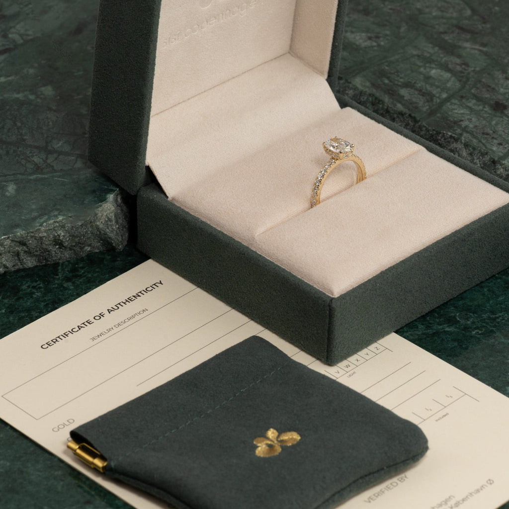 Når du mottar smykket, vil det være i vår gaveeske, bundet med et vakkert matchende silkebånd, klar til å gis som gave. Inne i esken finner du en smykkeboks, en pose og et ekthetsbevis.