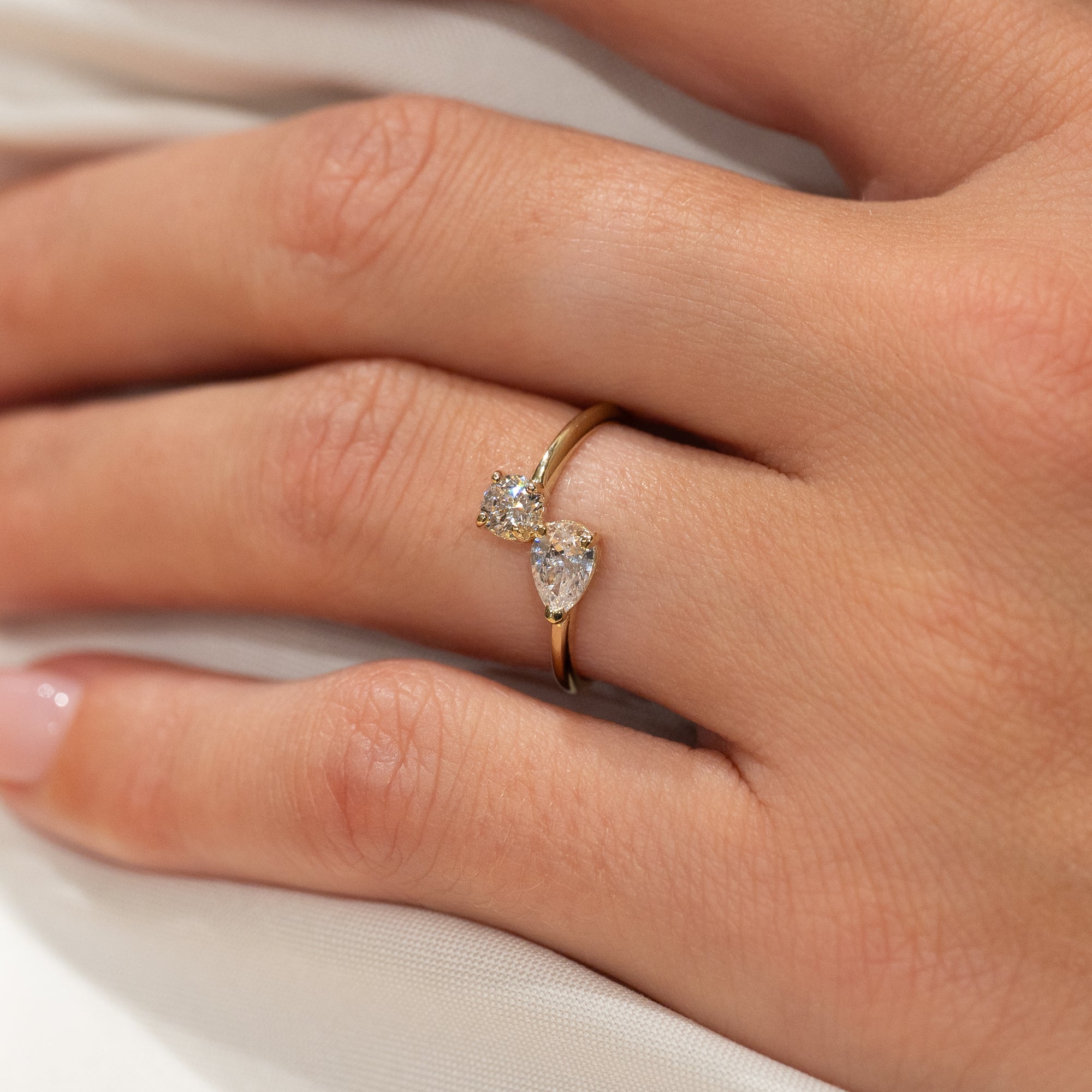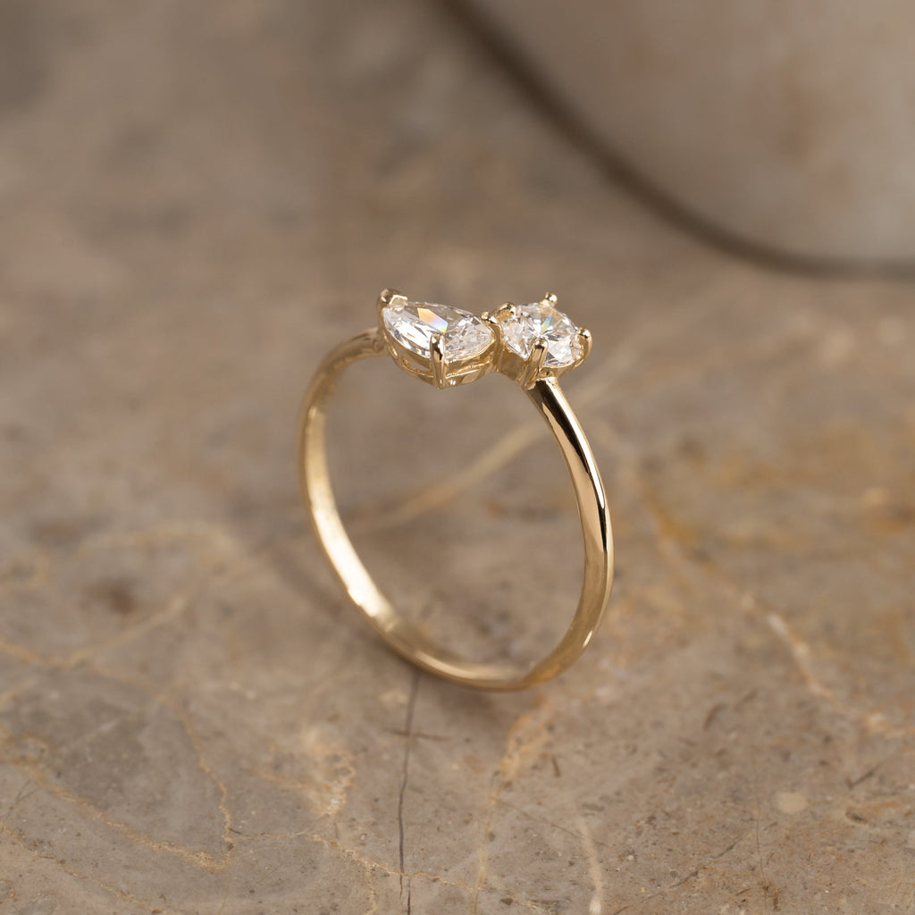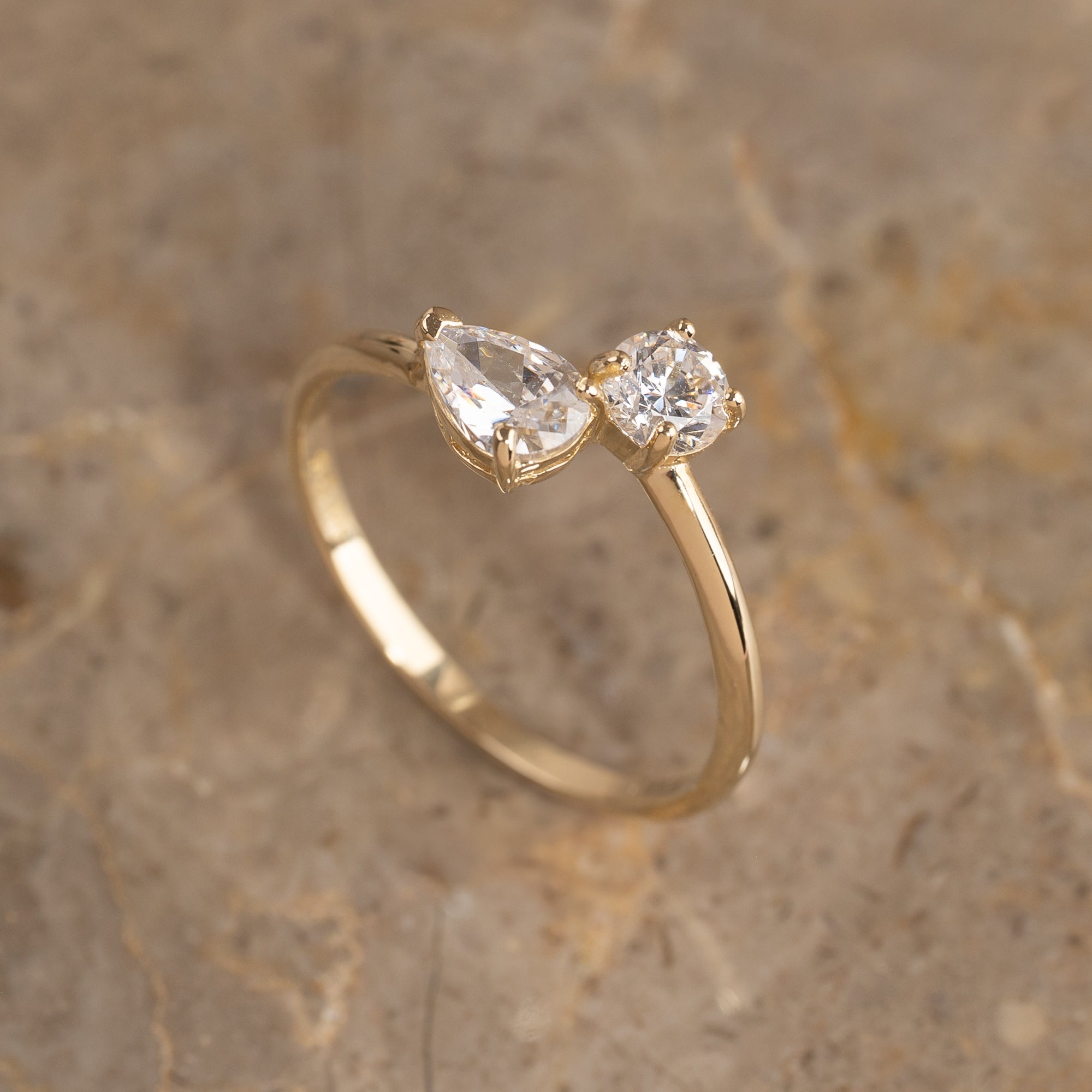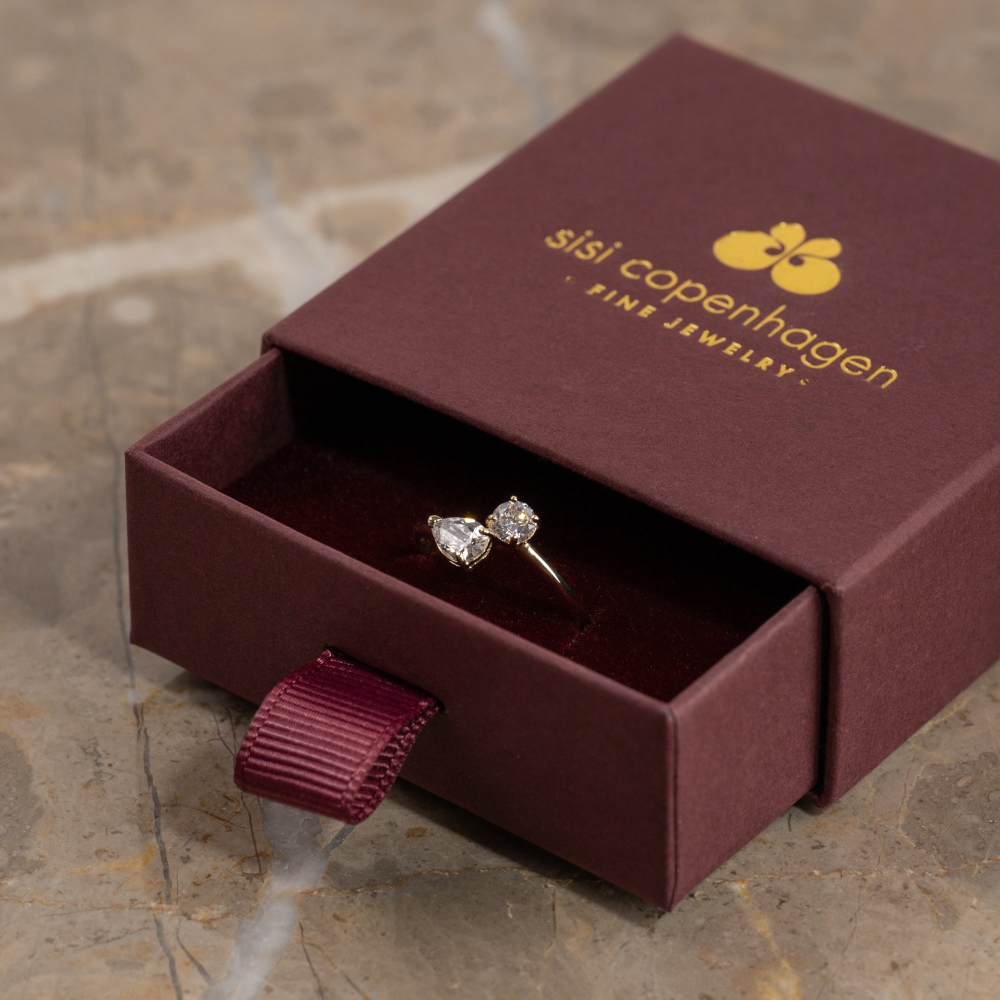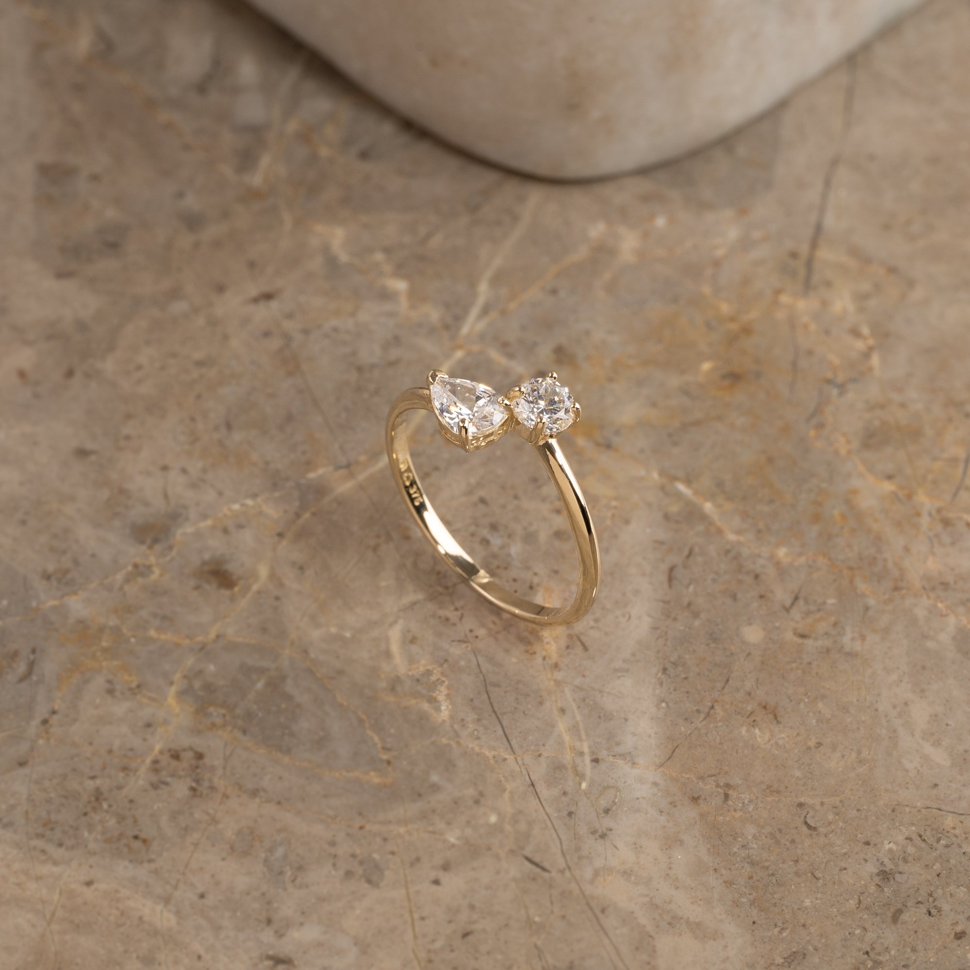 En fin og feminin ring med en rund og en pæreformet zirkon, plassert forskjøvet fra hverandre for et unikt og elegant uttrykk.
