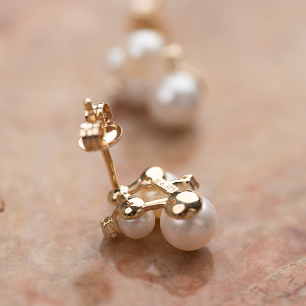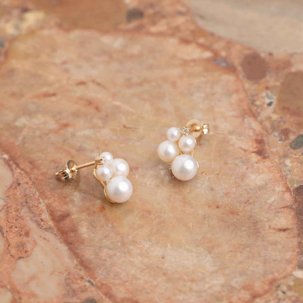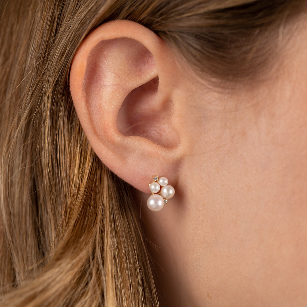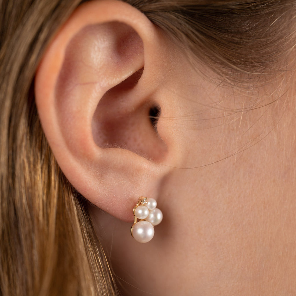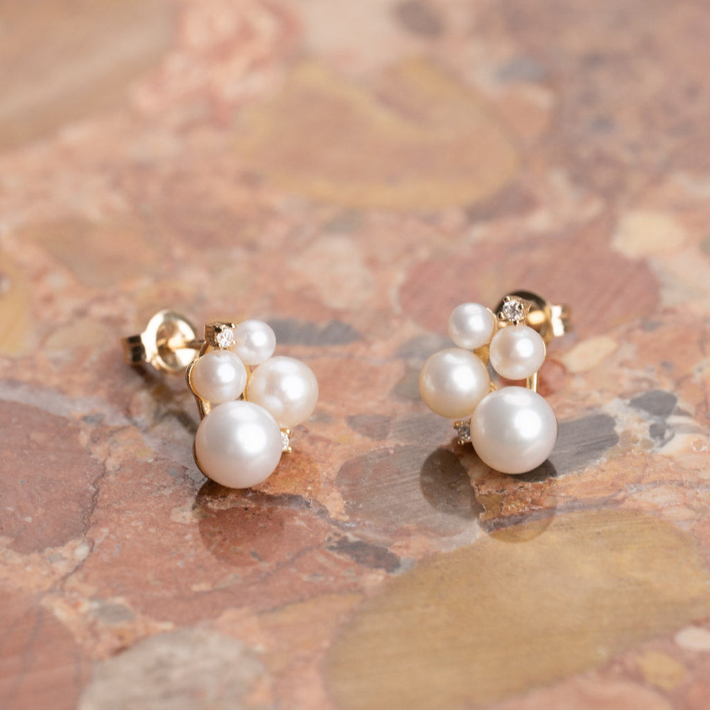 Øredobber i 9 karat massivt gull. Øredobben har fire runde ferskvannsperler med ulik størrelse mellom 3-6 mm. Videre har øredobbene to små, vakre og glitrende laboratoriefremstilte diamanter. Totalt sett er klyngen ca. 10x12mm.