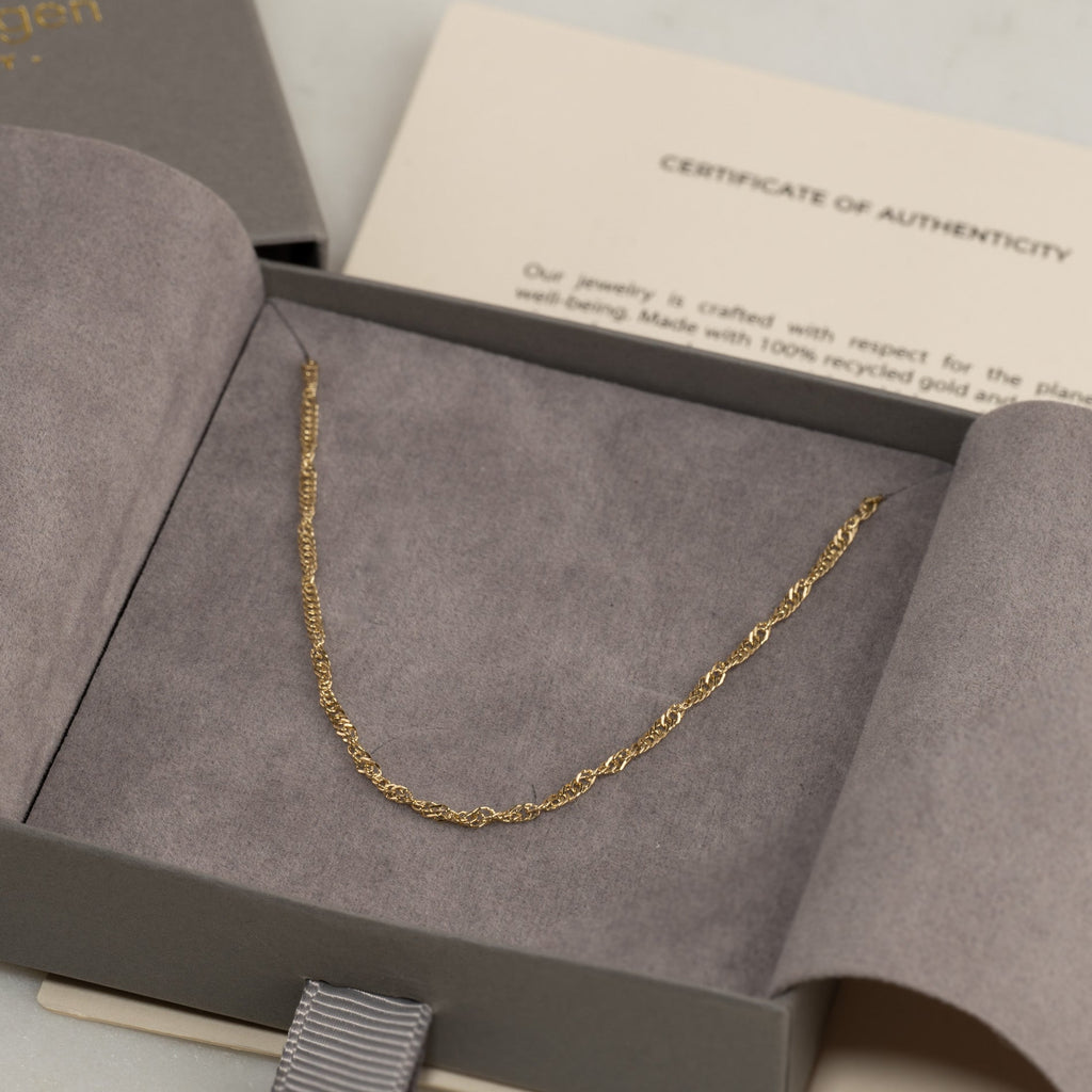 - Med 9 kt massivt gull får du et ytterst holdbart smykke som både er vanntett og beholder sin gullglans hele livet.