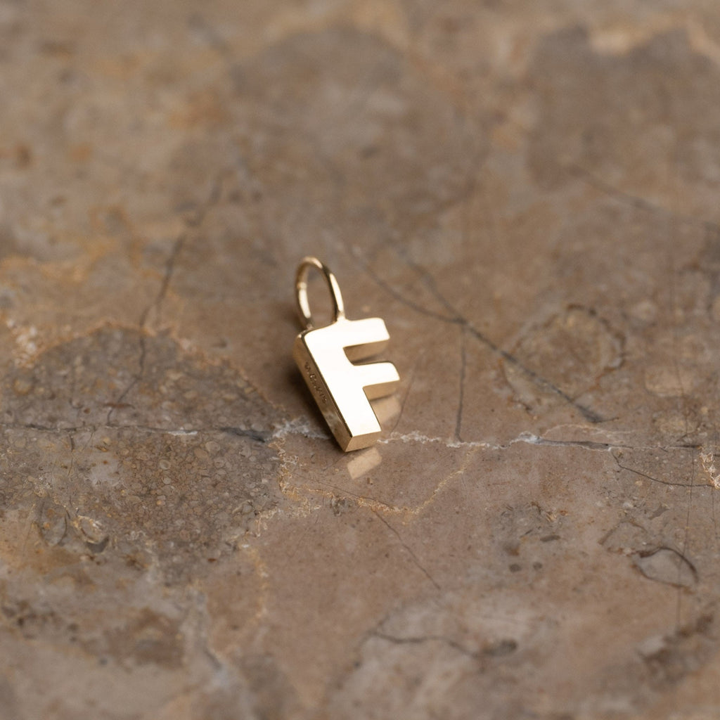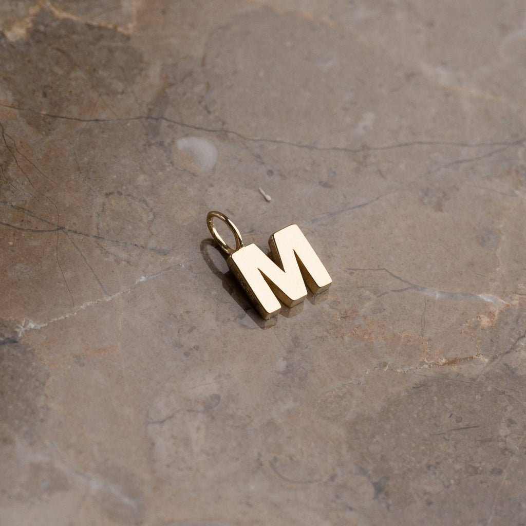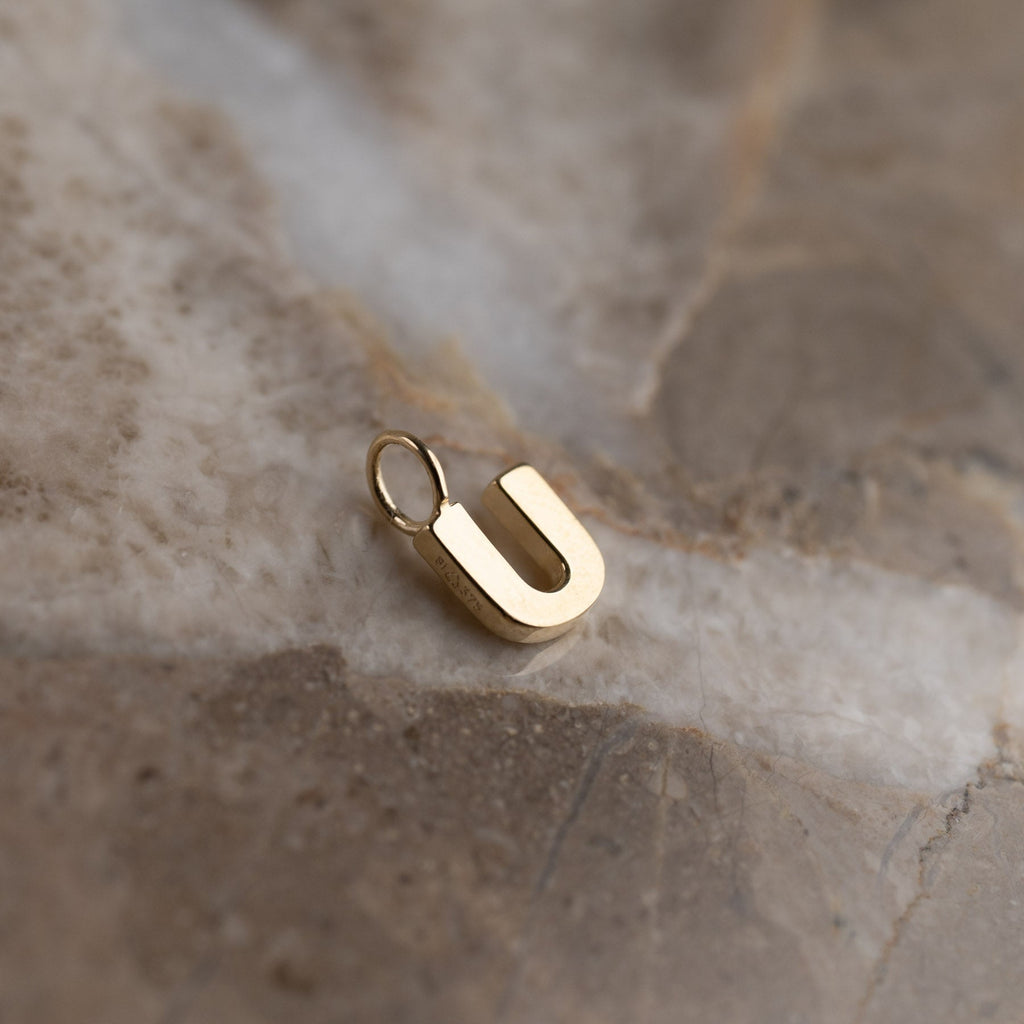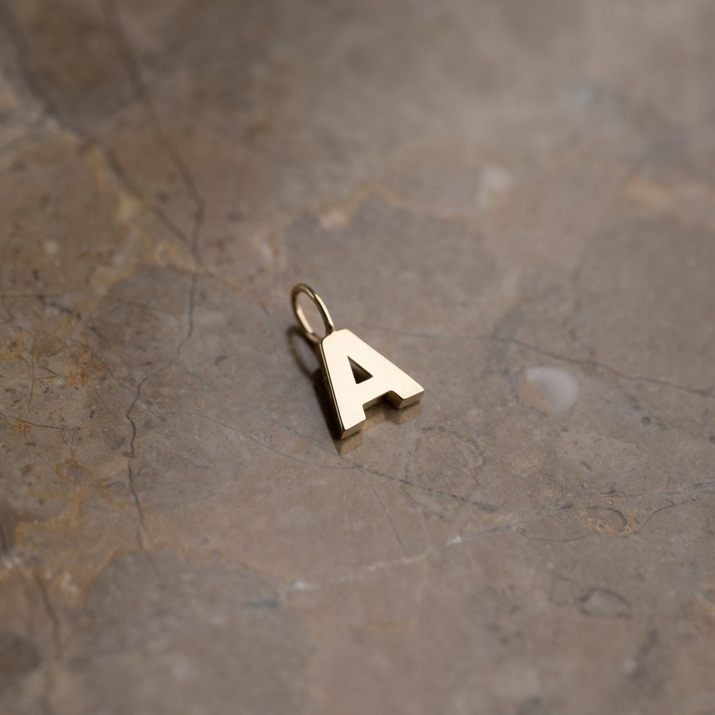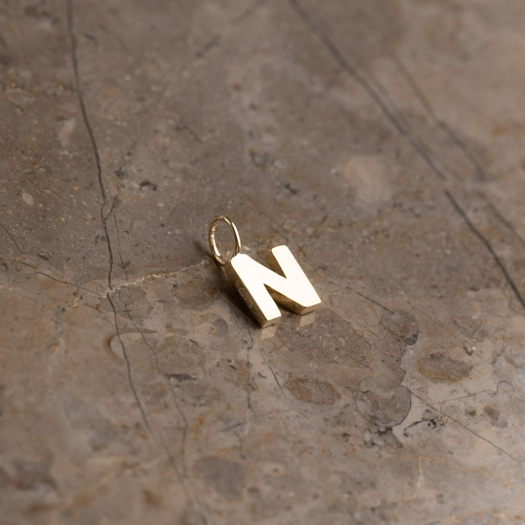 Vårt Letter Solid Gold anheng er laget av 100% resirkulert 9 karat massivt gull. Bokstavene måler 6 mm i høyden.