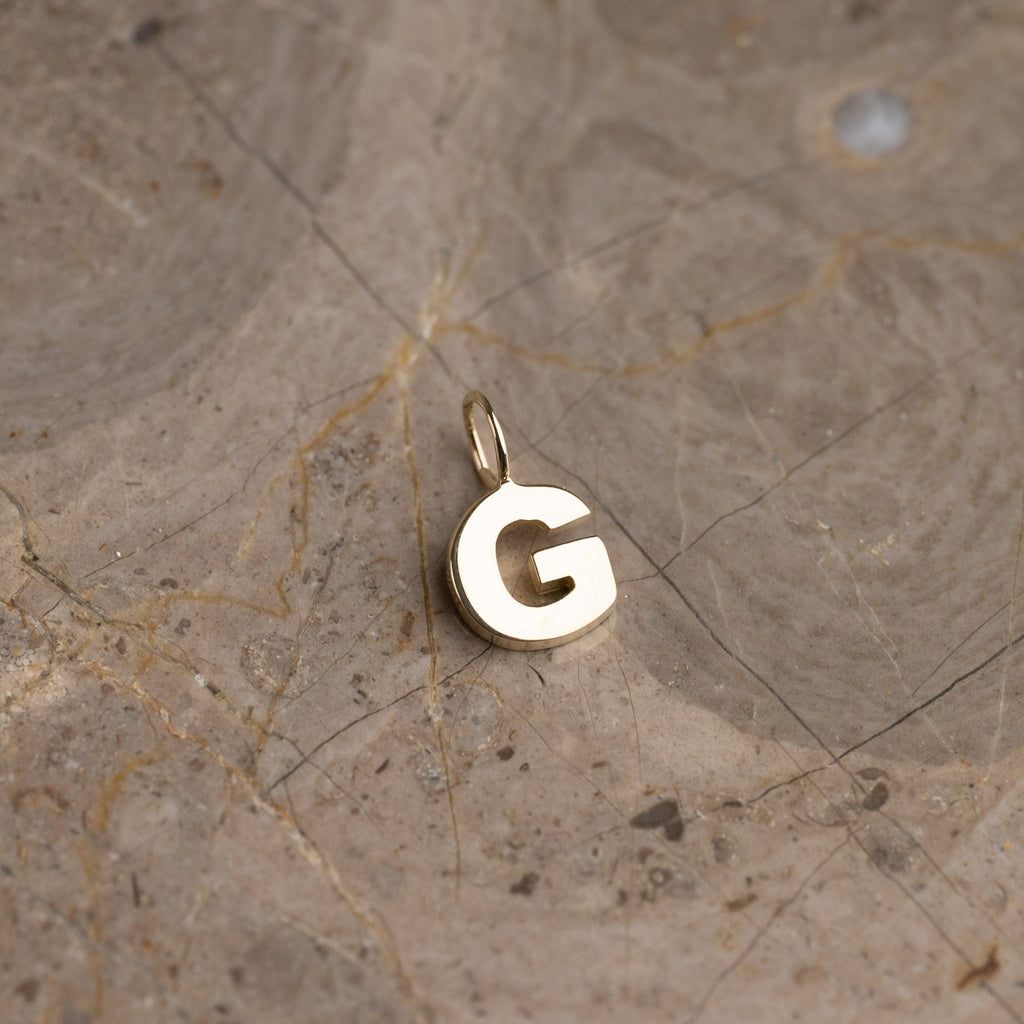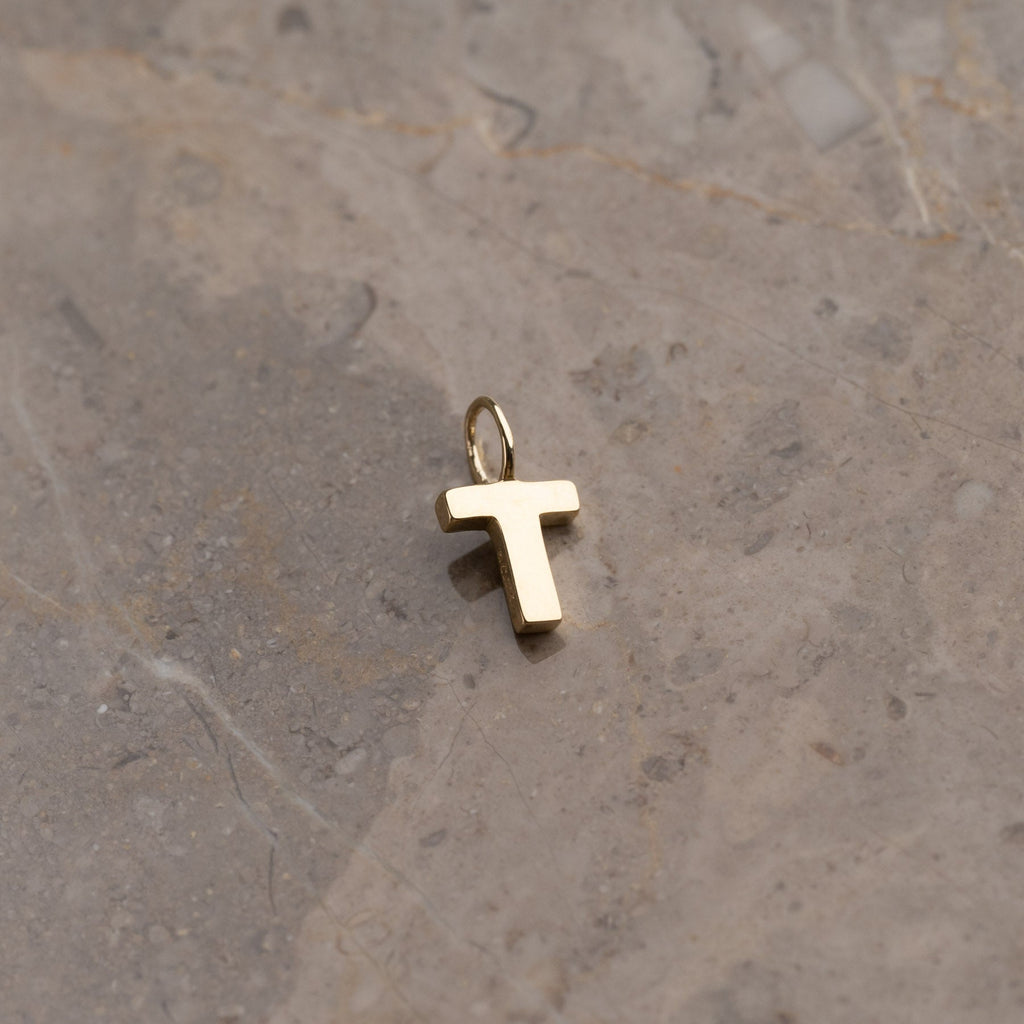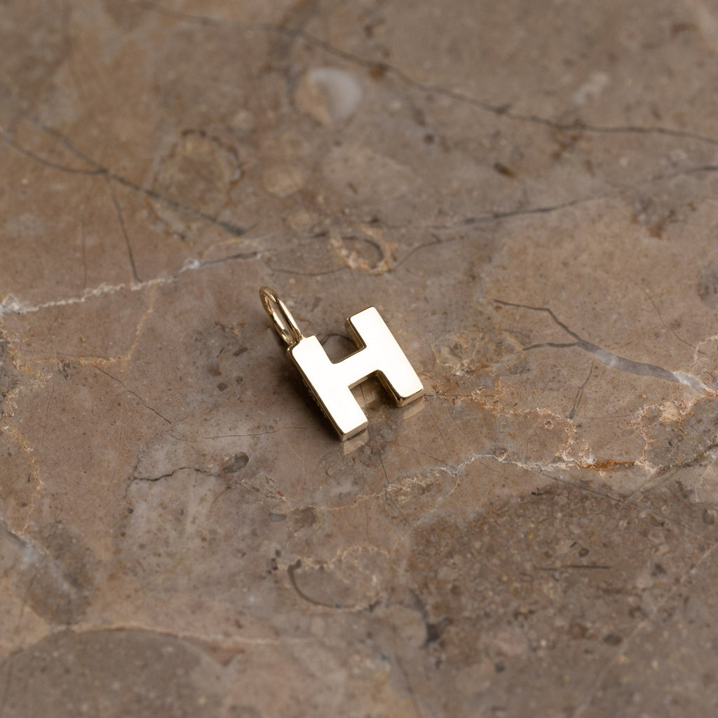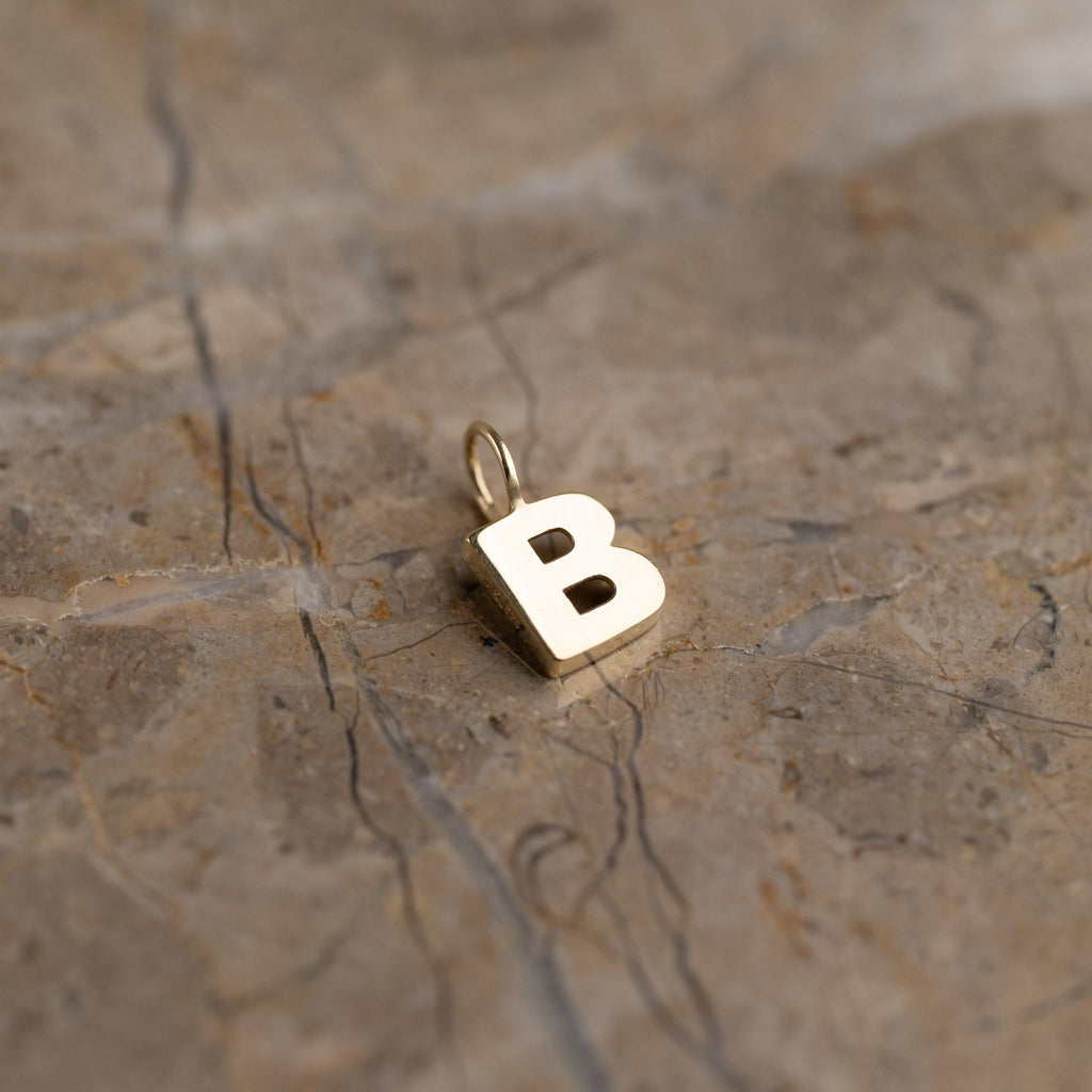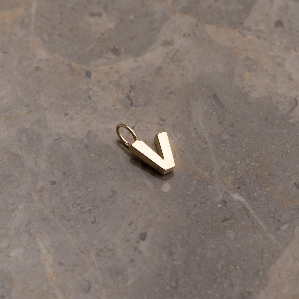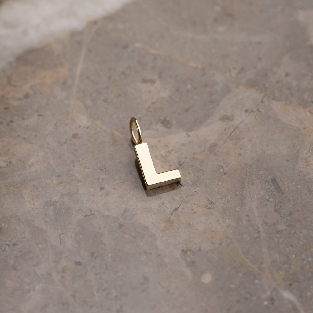 Vårt Letter Solid Gold anheng er laget av 100% resirkulert 9 karat massivt gull. Bokstavene måler 6 mm i høyden.