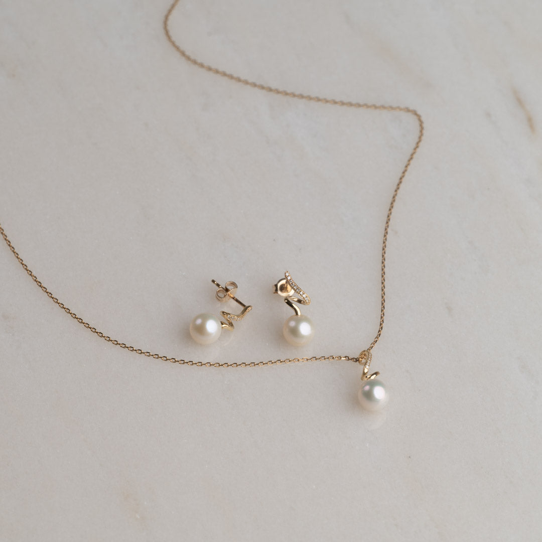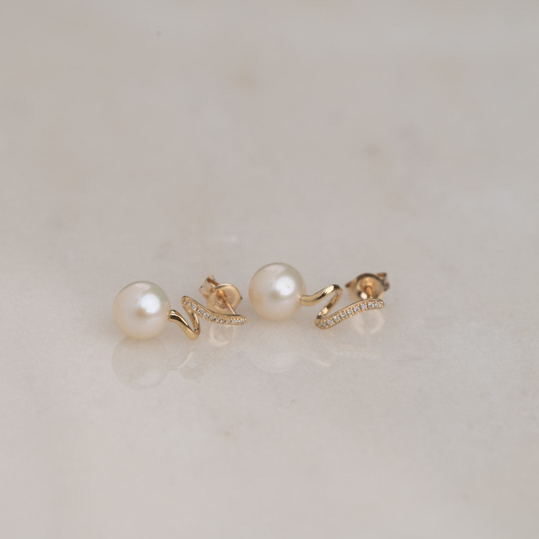 Øreringene er designet som diamantbesatte, vridde øreringer med runde 7,5 mm ferskvannsperler i enden. Det vridde designet skaper en lett og leken effekt, som sammen med de glitrende diamantene og de fine hvite perlene gir eleganse og raffinement.