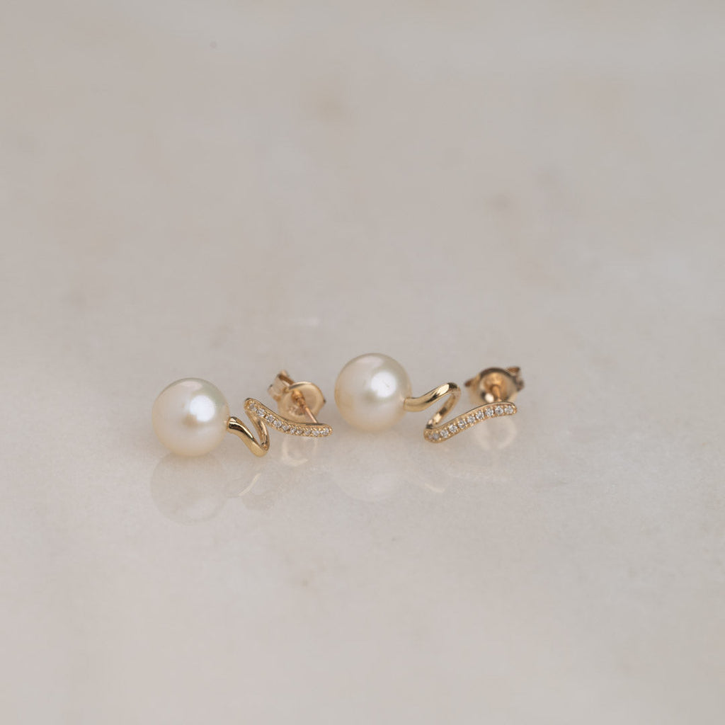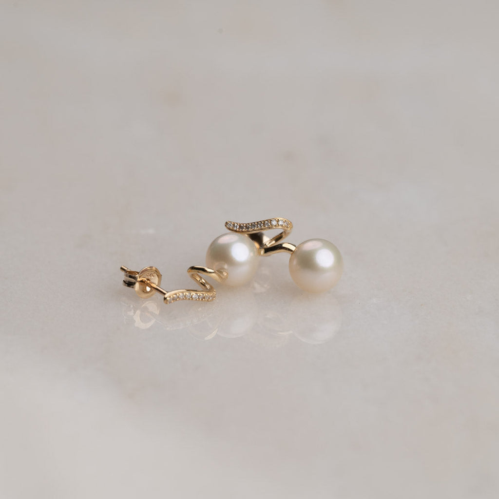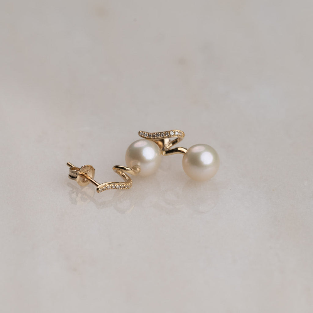 Våre øreringer Lora er laget i 100% resirkulert 9 karat massivt gull, med hvite ferskvannsperler og ekte diamanter.