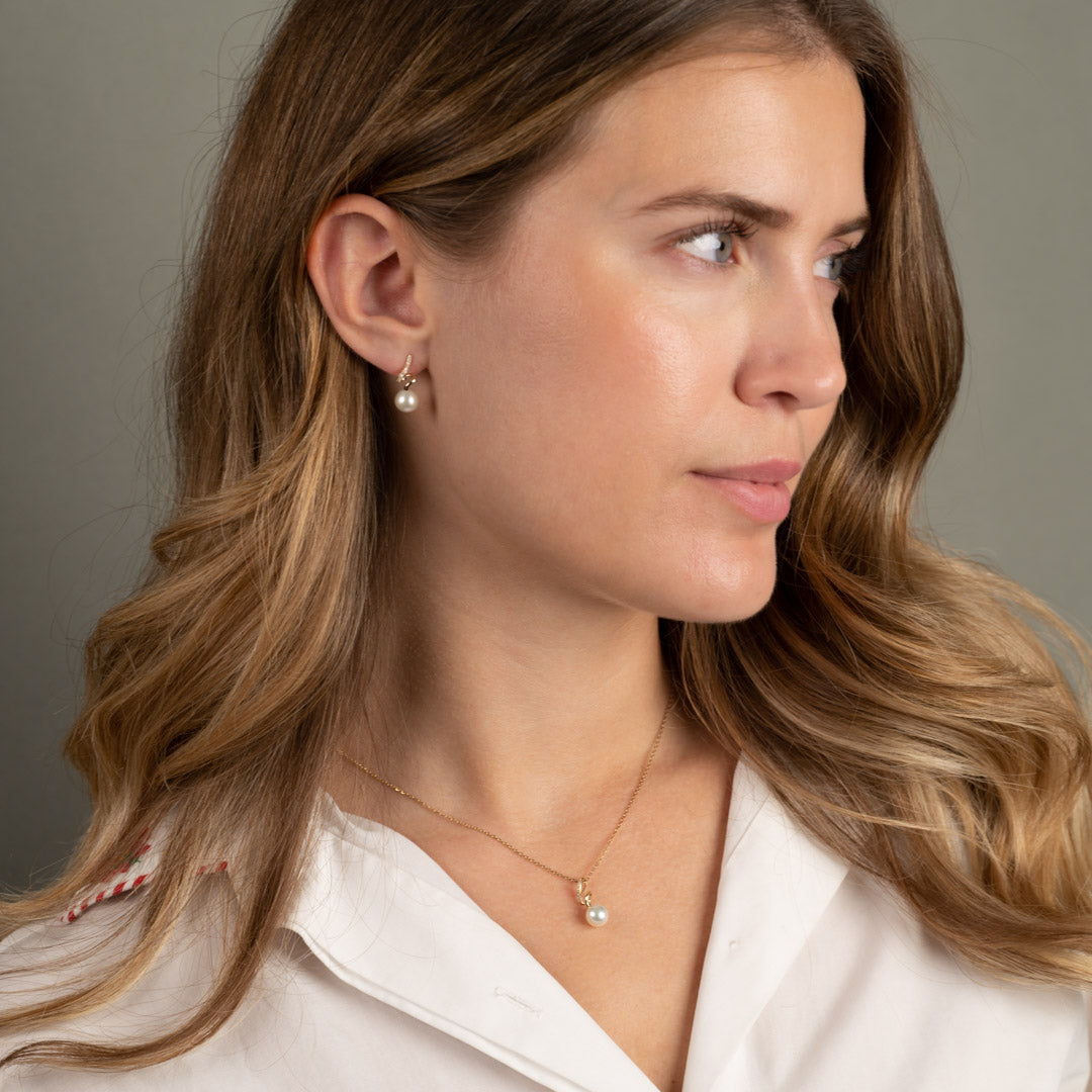 Vårt Lora anheng er laget i 100% resirkulert 9 karat massivt gull, med hvite ferskvannsperler og ekte diamanter.