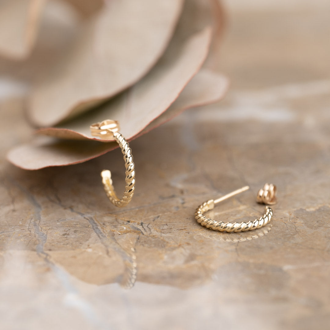 Våre øreringer Lucca er laget i 100% resirkulert 9 karat massivt gull. Øreringene er designet som en åpen creol. De har en rillete overflatetekstur som minner om et klassisk maritimt tau.