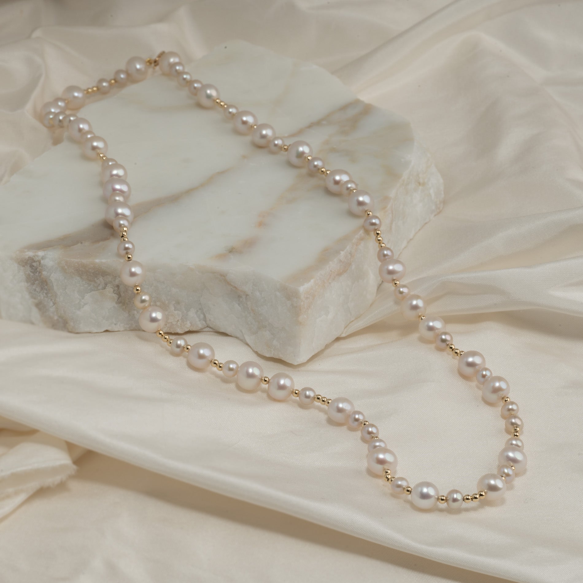 Halskjedet er laget i 100% resirkulert 9 karat massivt gull. Halskjedet er et nydelig og tidløst perlesmykke som er designet med små ferskvannsperler i varierende størrelser og små gullkuler.