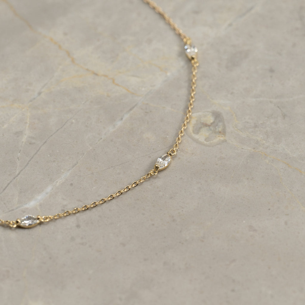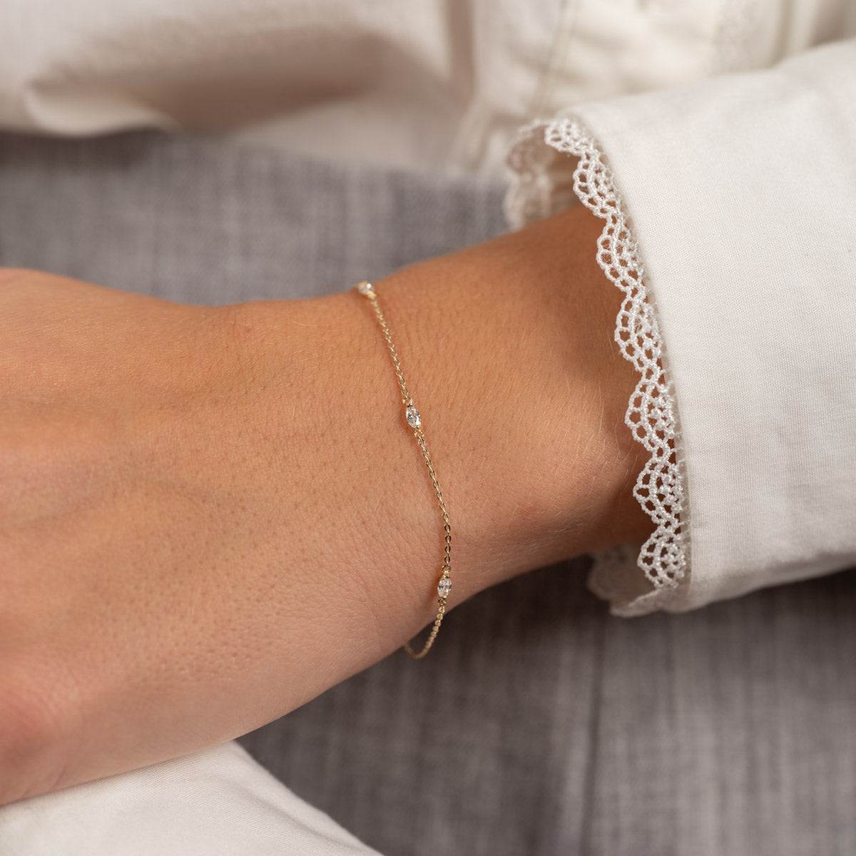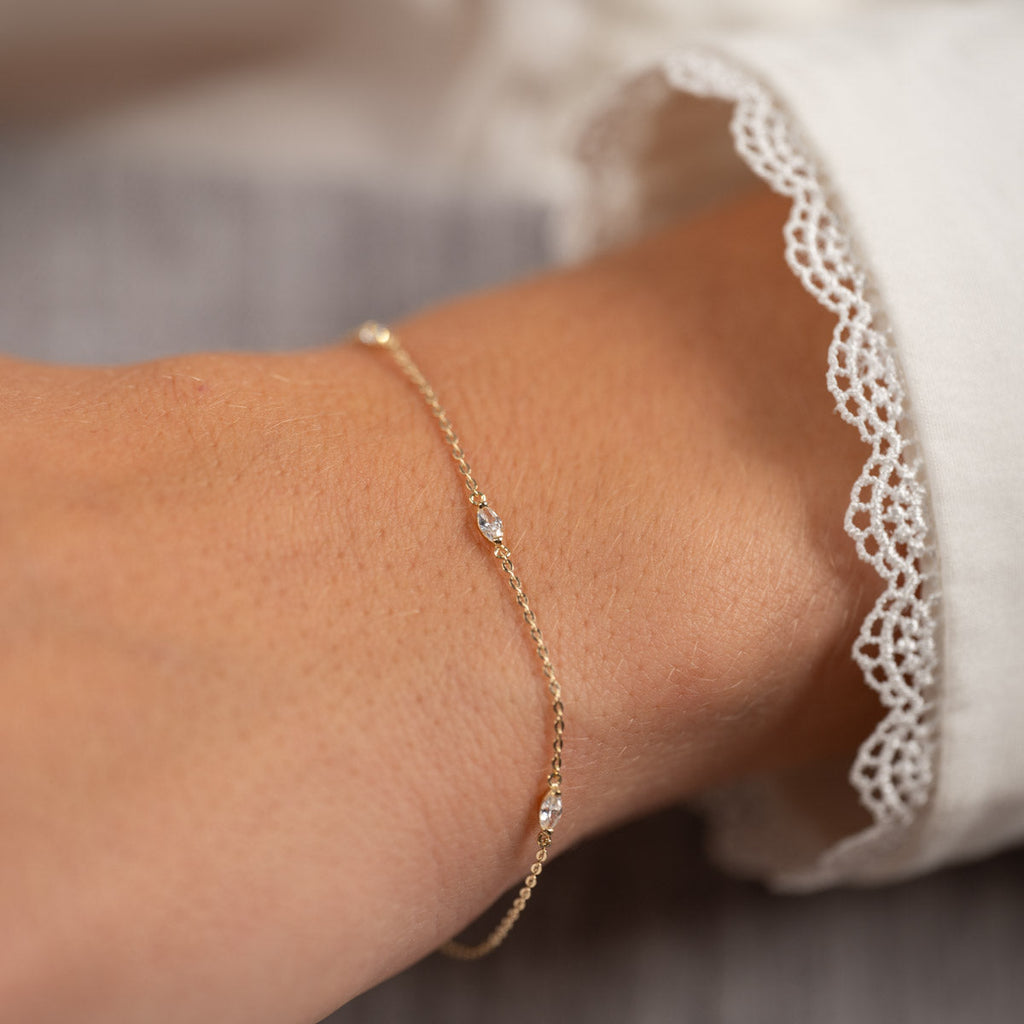 Madeline armbåndet er laget i 100% resirkulert 9 karat massivt gull med fire marquise-slipte hvite, kubiske zirkoniastener.