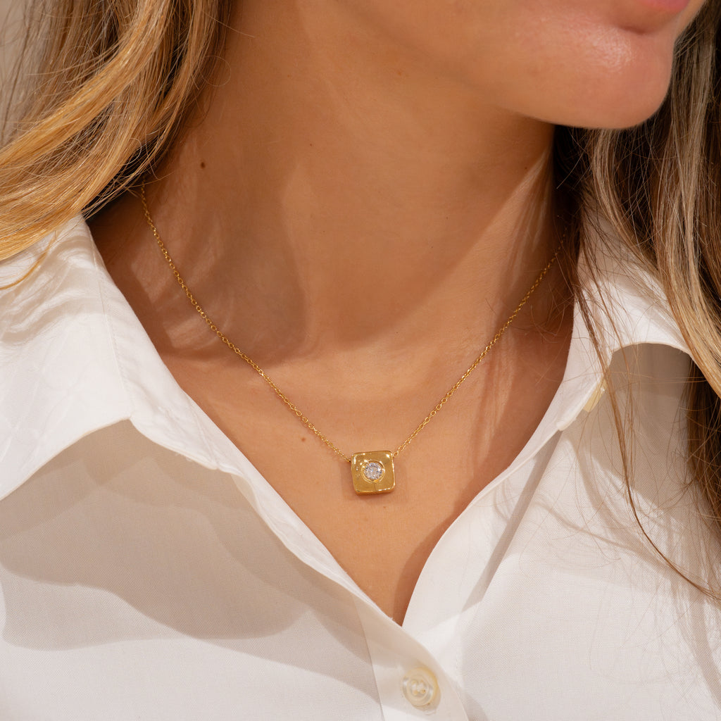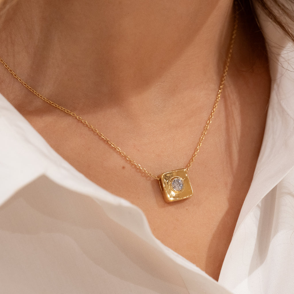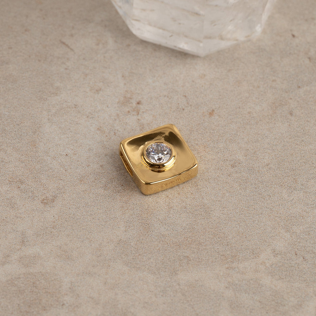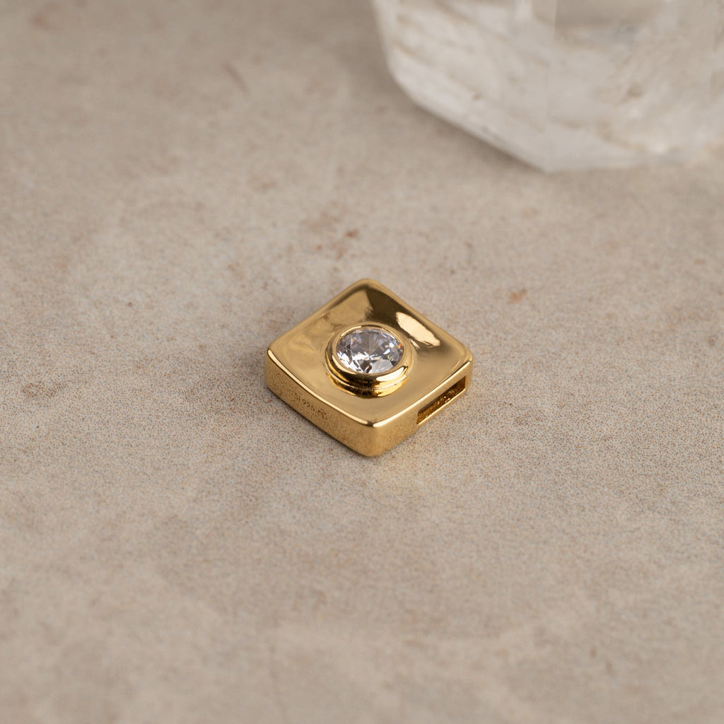 Det firkantede designet med avrundede hjørner gir et mykt og retroinspirert uttrykk. Anhenget har målene 12 x 12 mm og har en slide-in-åpning på ca. 4,3 mm, som gjør det enkelt å feste på et kjede.