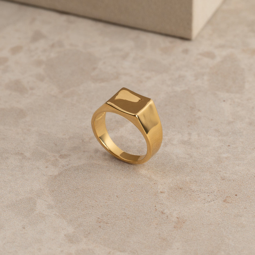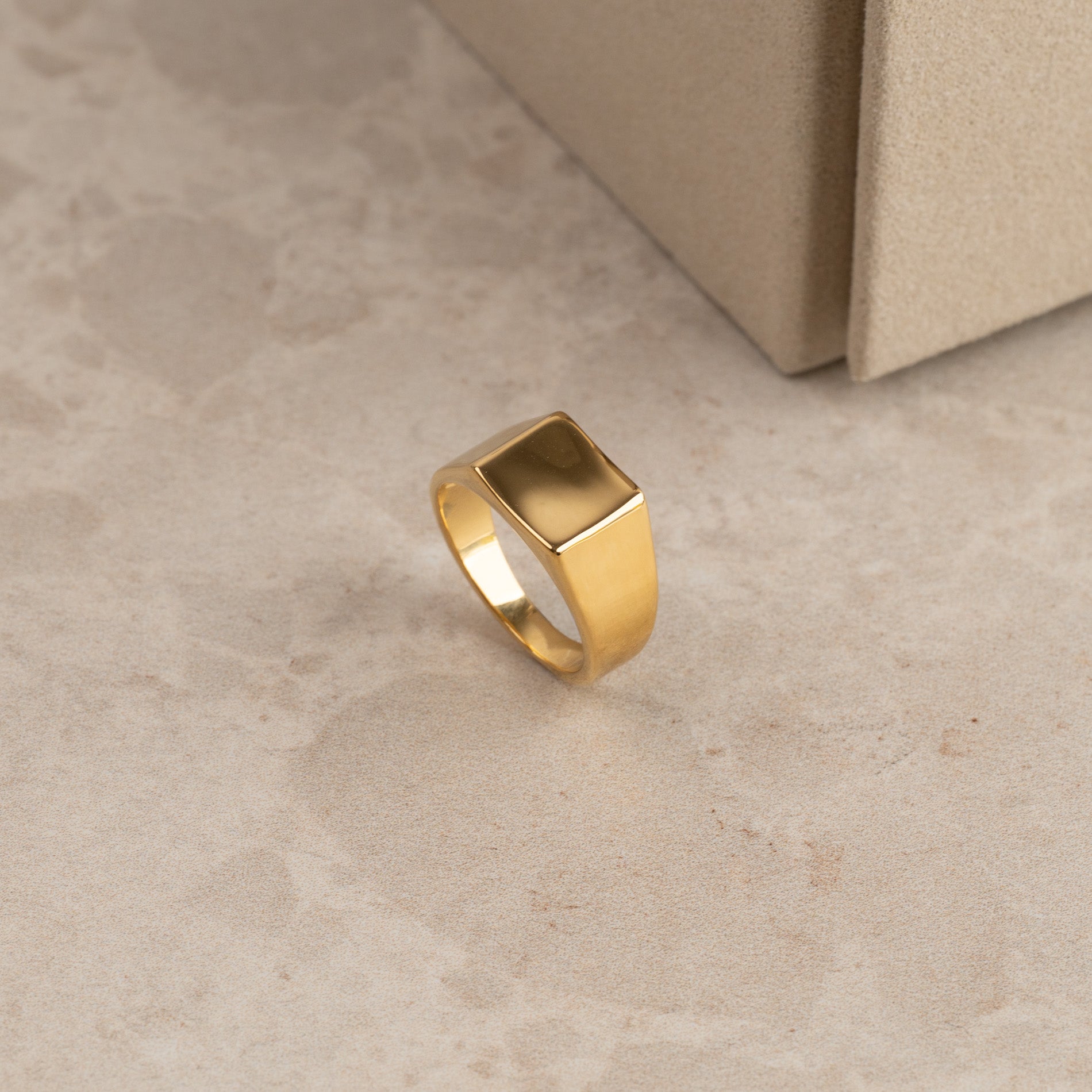 En klassisk, firkantet signetring i 100 % resirkulert 18 karat gullbelagt sterlingsølv.