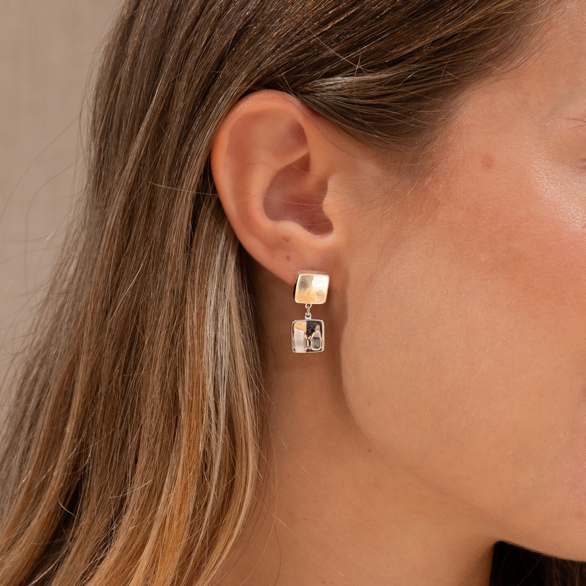Øredobber i 100% resirkulert 925 sterlingsølv med et retroinspirert design. De to firkantene med avrundede hjørner er koblet sammen og skaper et lett og levende uttrykk.
