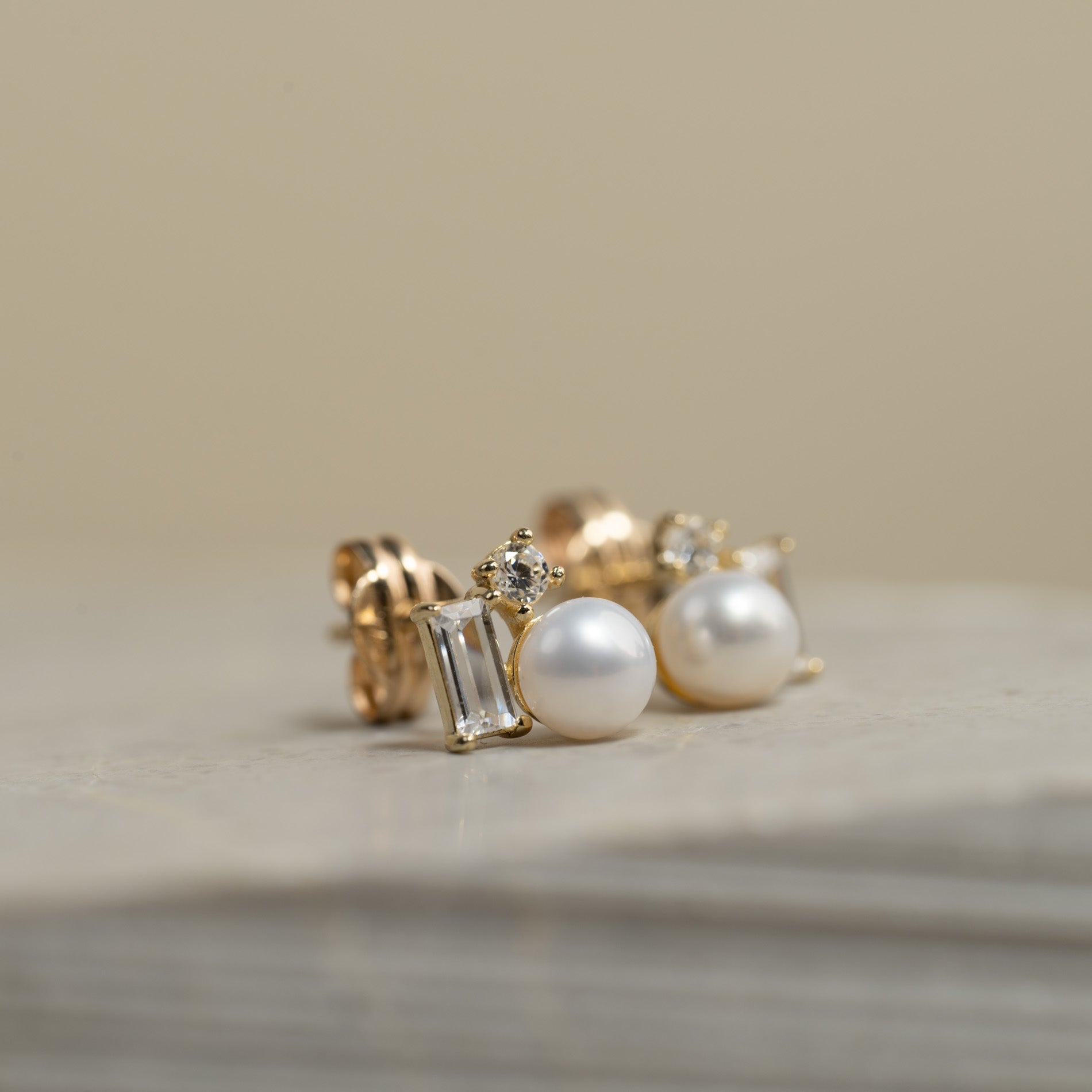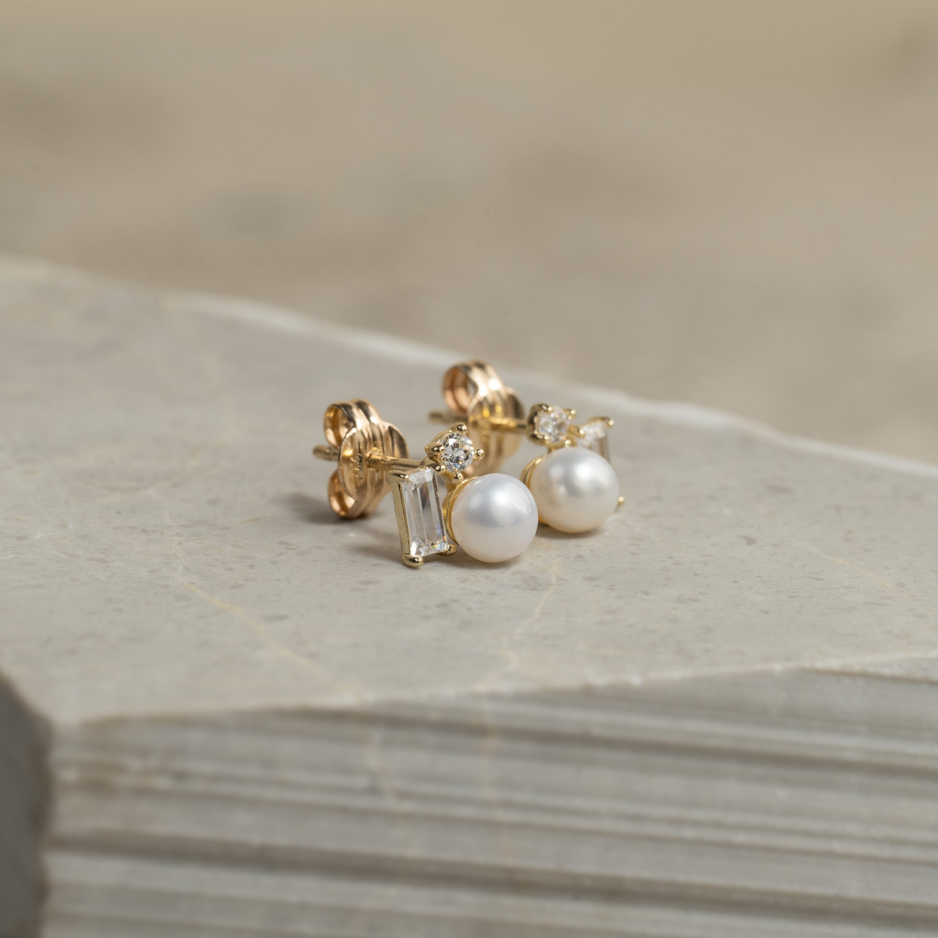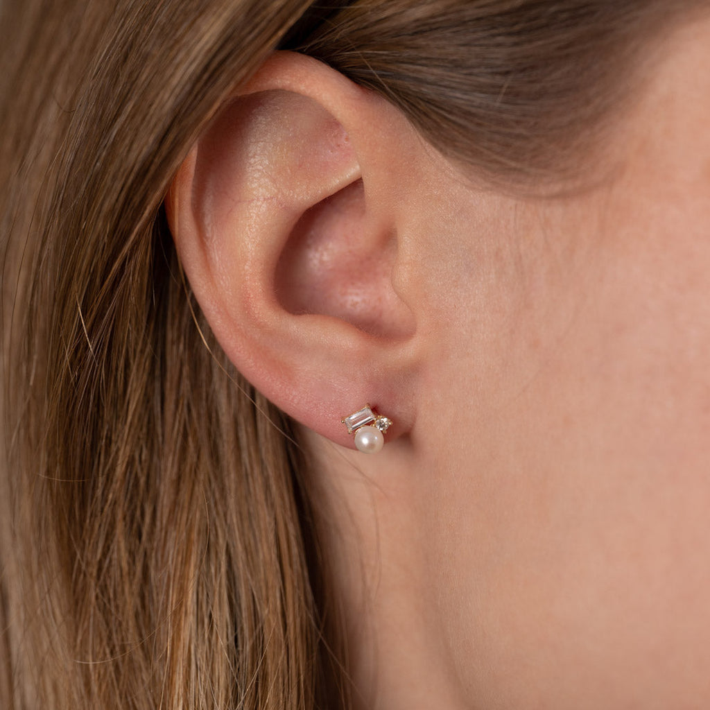 Maeve øredobber har et feminint design med en hvit ferskvannsperle, en liten klar, rund zirkoniasten og en baguettslipt zirkoniasten. Dette gir øredobben en fin detalj i et ellers klassisk design.