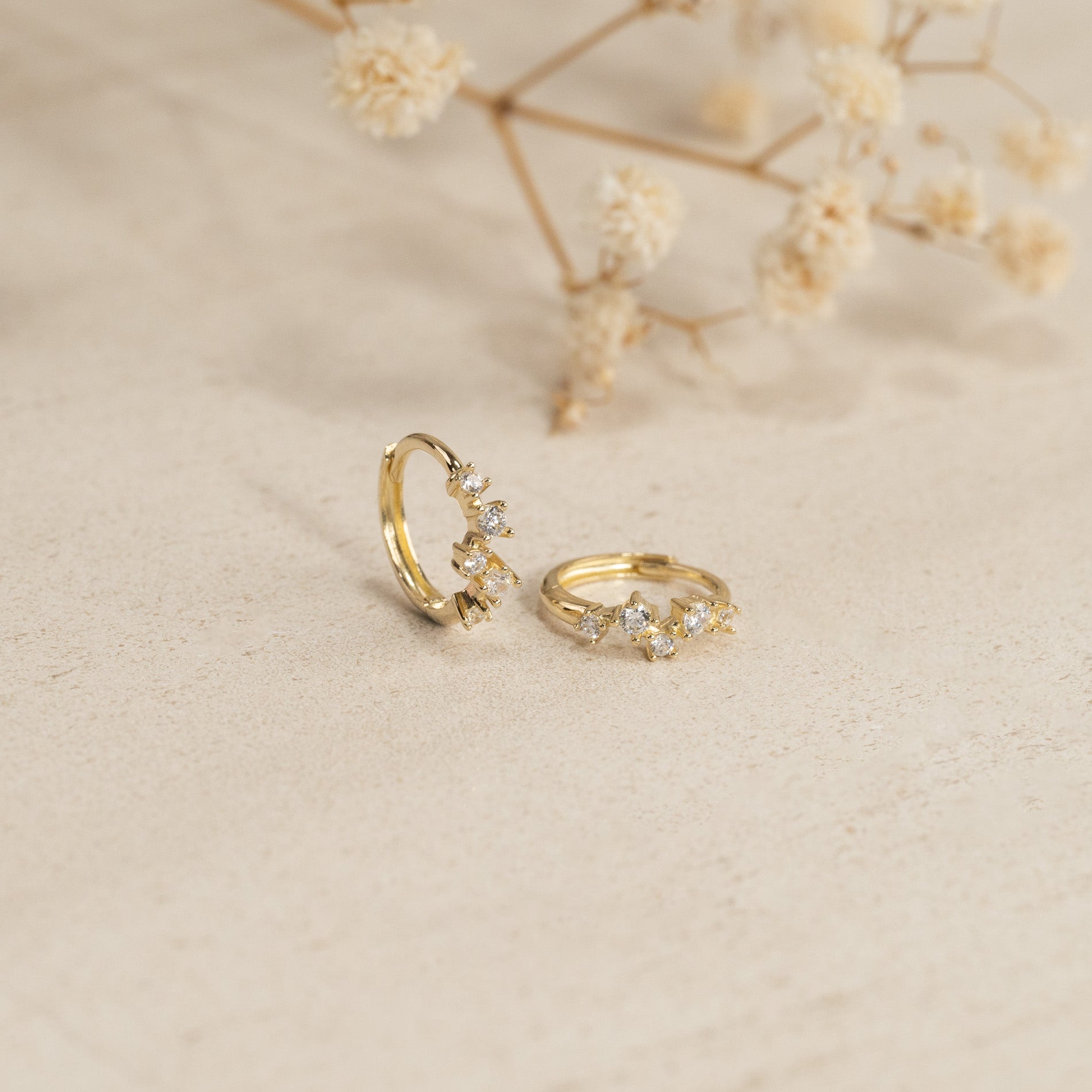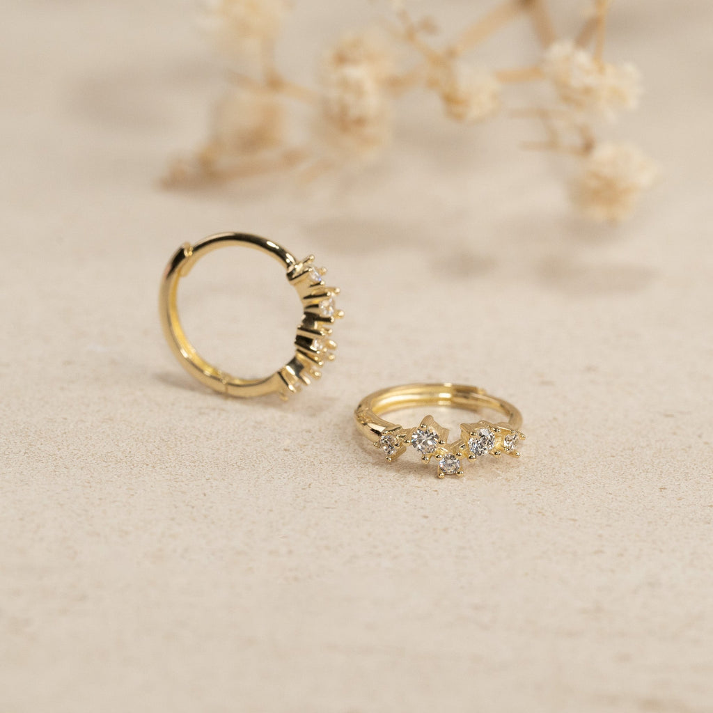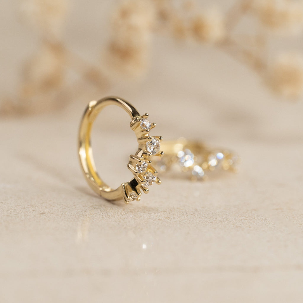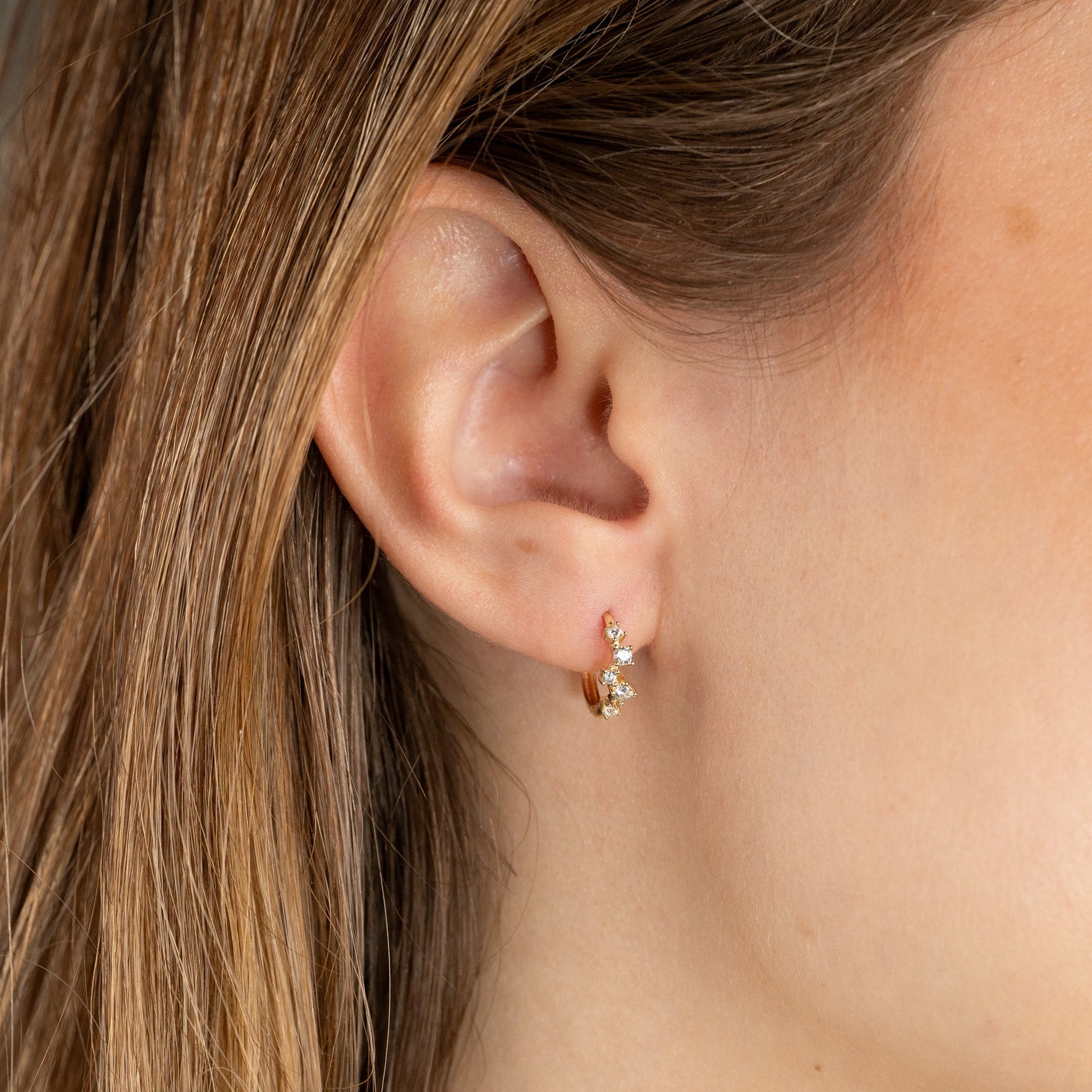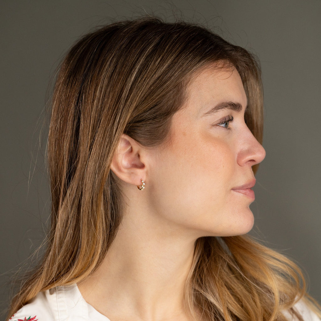 Øreringene er laget i 100% resirkulert 9 kt. Massiv gull med en rekke av fem små klare zirkoner.