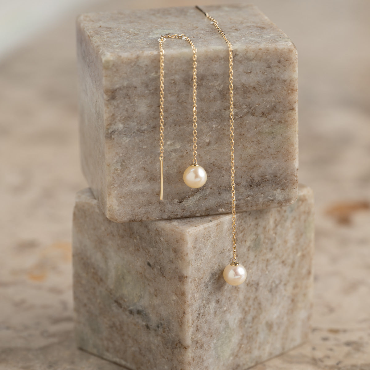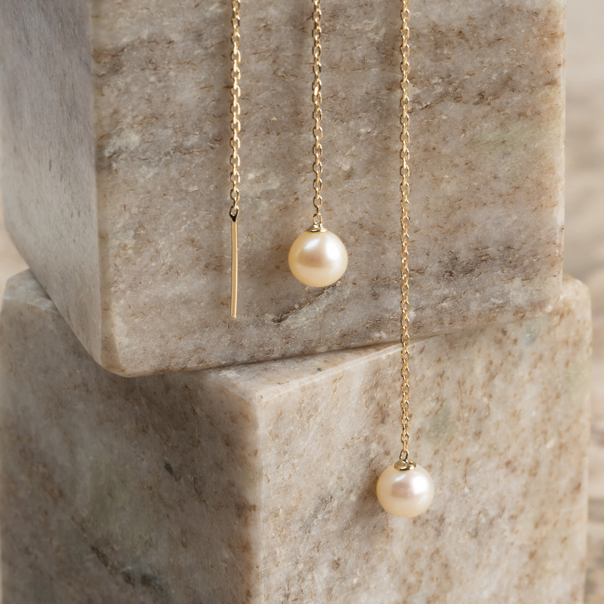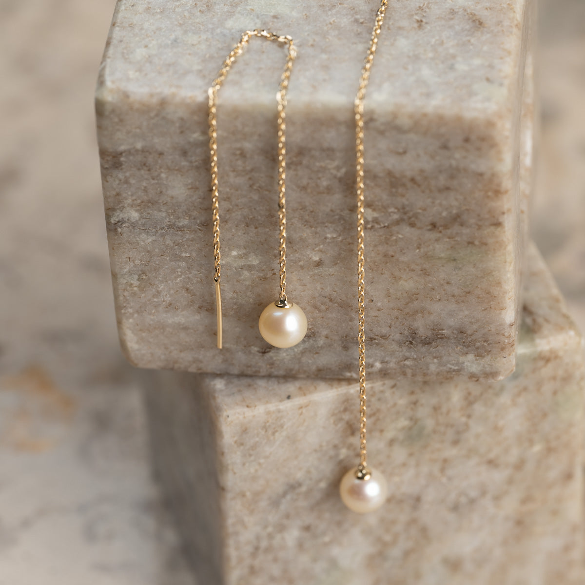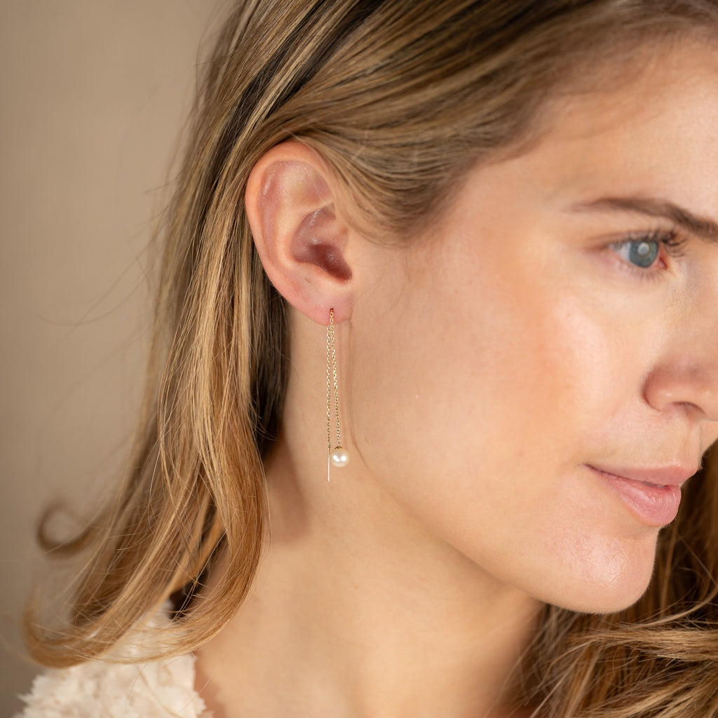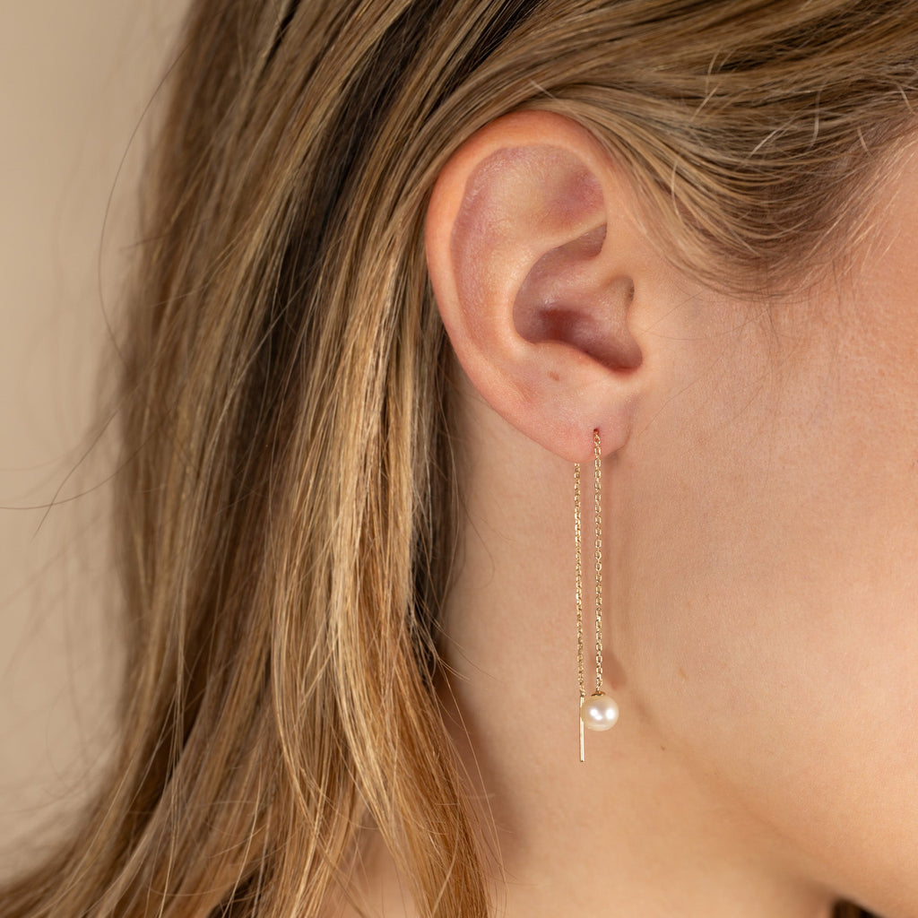 Våre Margery øreringer er laget i 100% resirkulert 9 karat massivt gull med hvite ferskvannsperler. De flotte hengeøreringene har et klassisk og tidløst uttrykk. Selve perlen måler 4-5mm. Hele kjedet er 10cm langt, og kjedet trekkes gjennom øret uten lås.