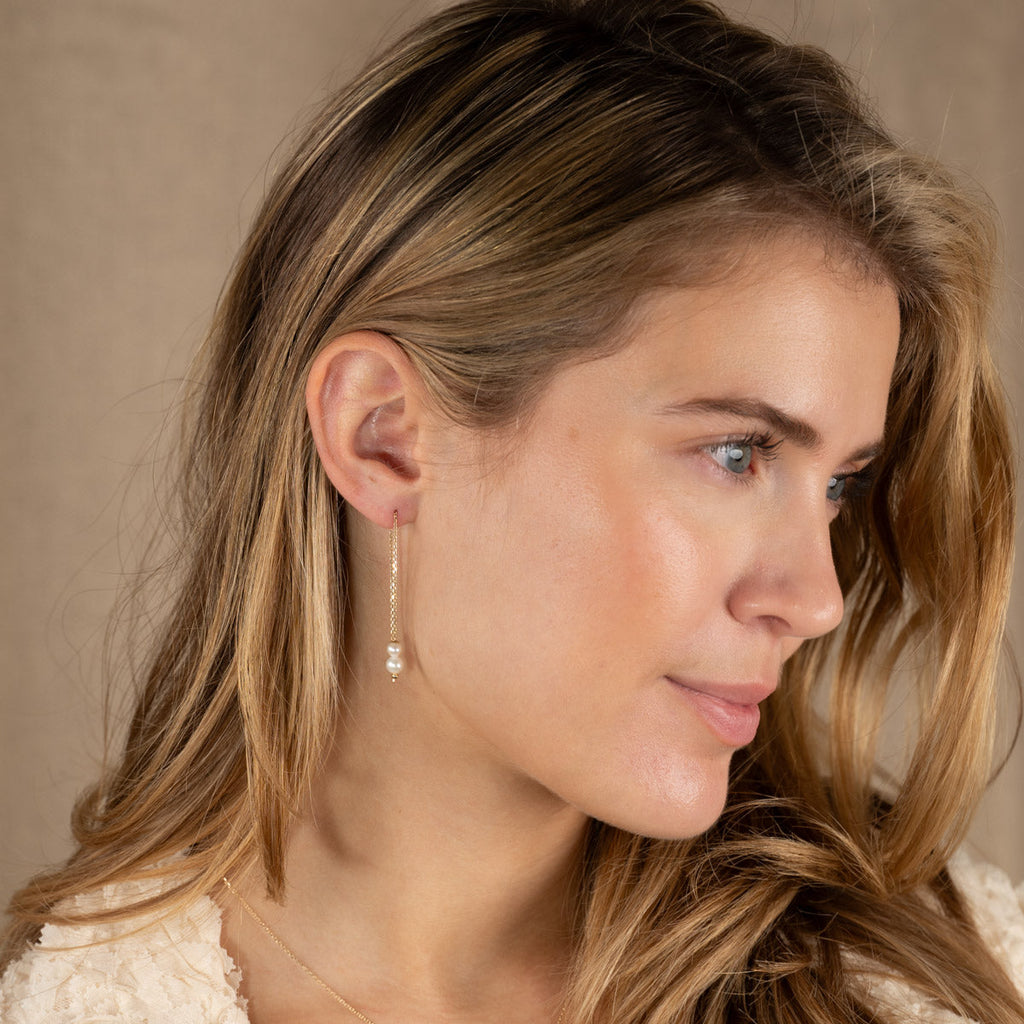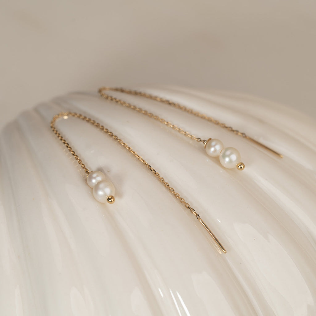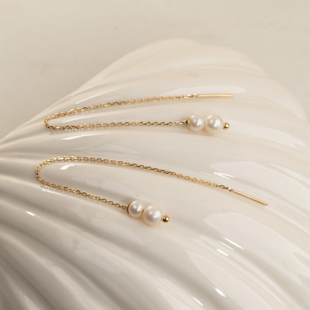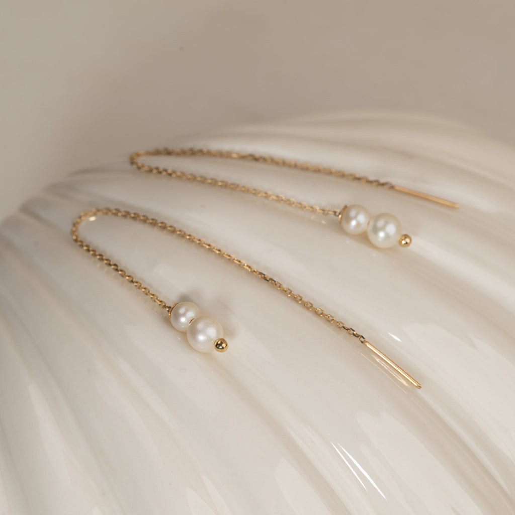 Selve øredobben består av en gullkjede som trekkes gjennom øret, med to vakre, hvite perler i enden. Smykkene er elegante, livlige og feminine.