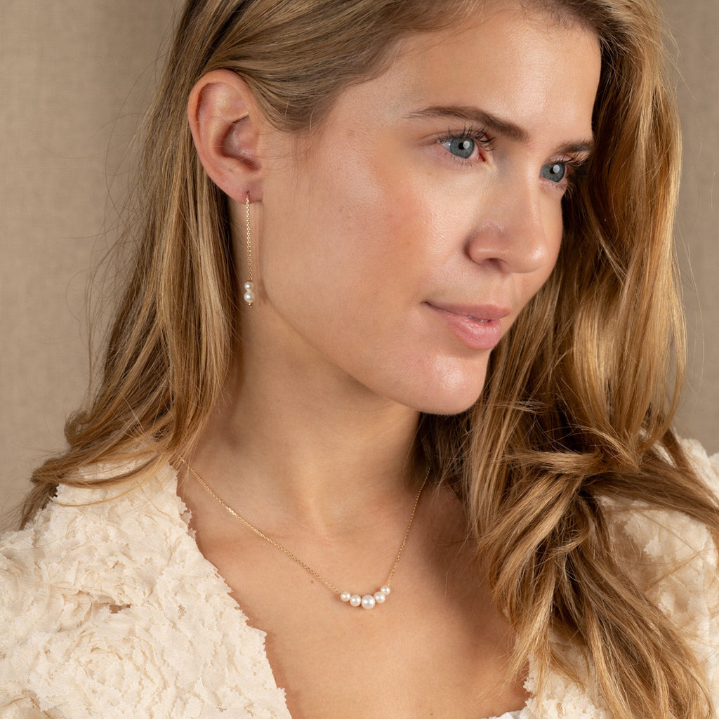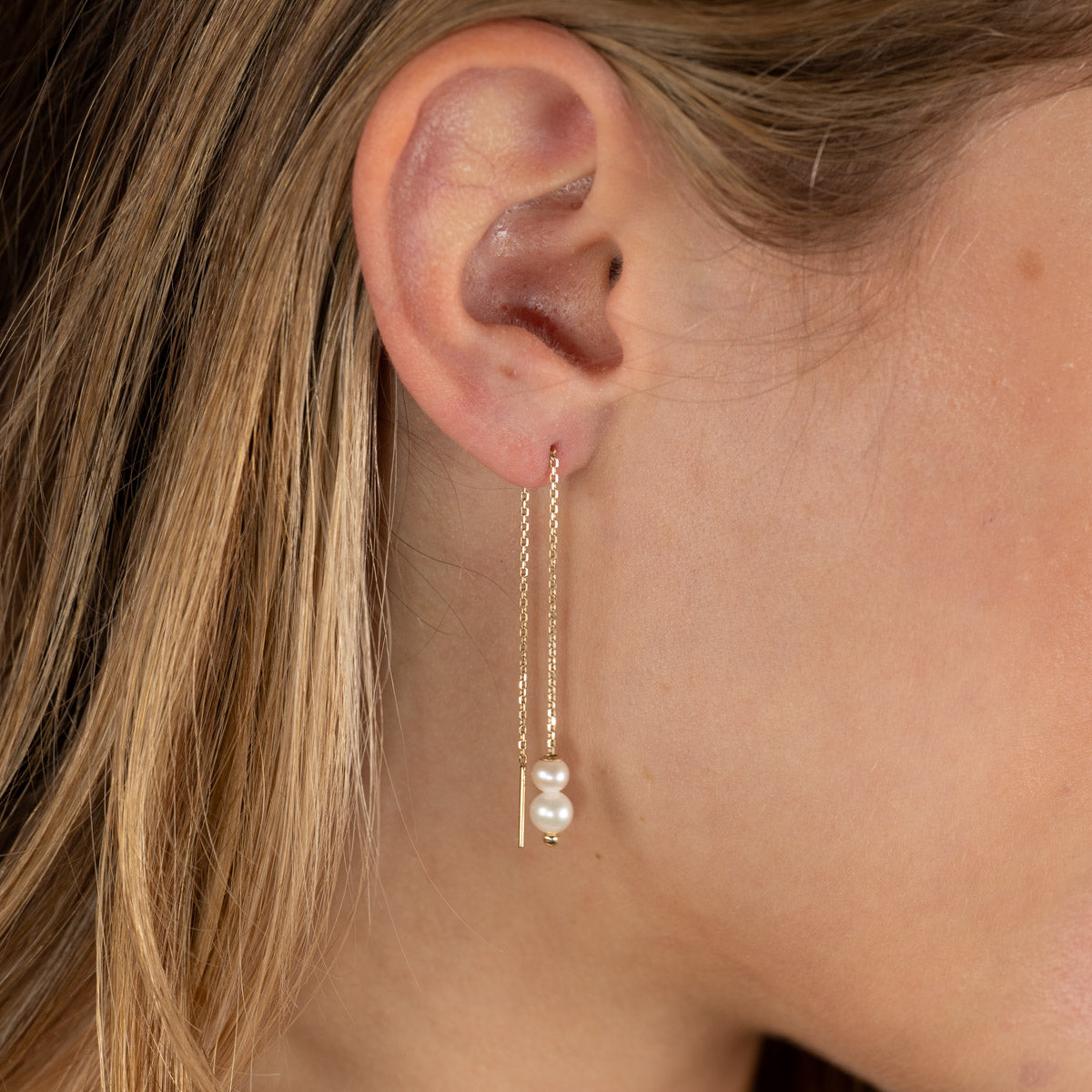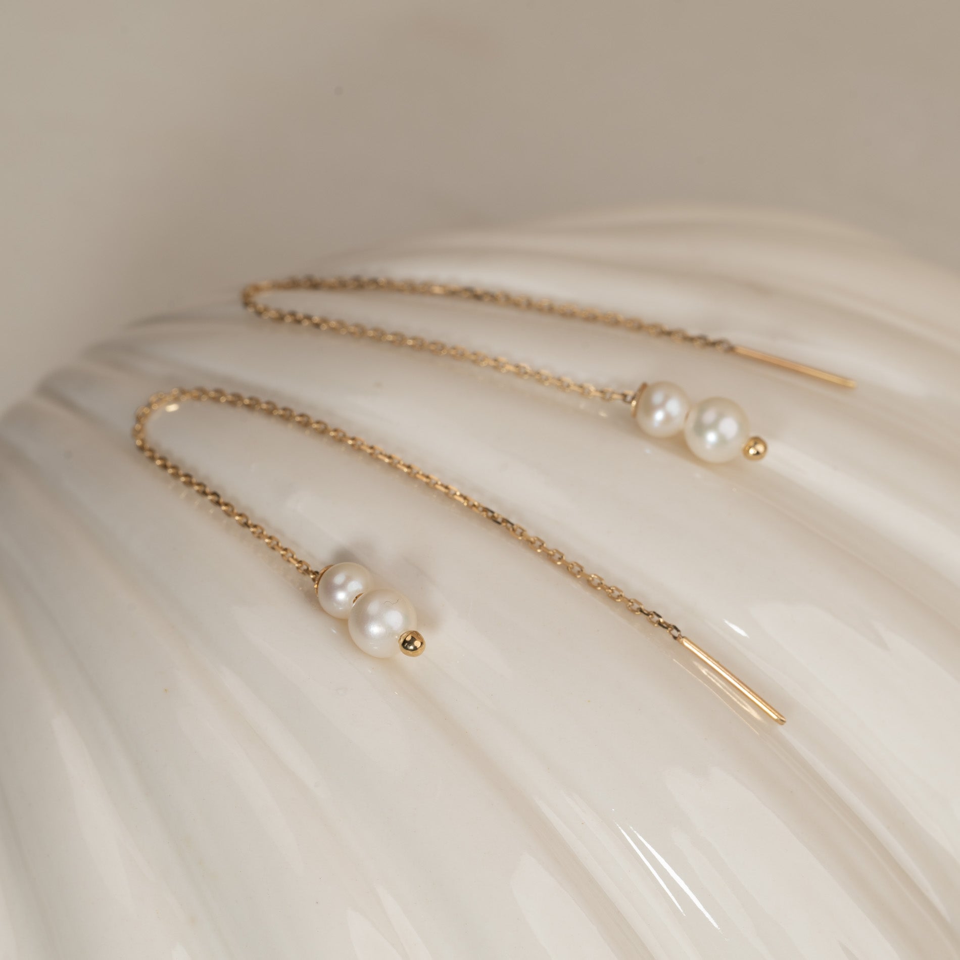 Selve øredobben består av en gullkjede som trekkes gjennom øret, med to vakre, hvite perler i enden. Smykkene er elegante, livlige og feminine.