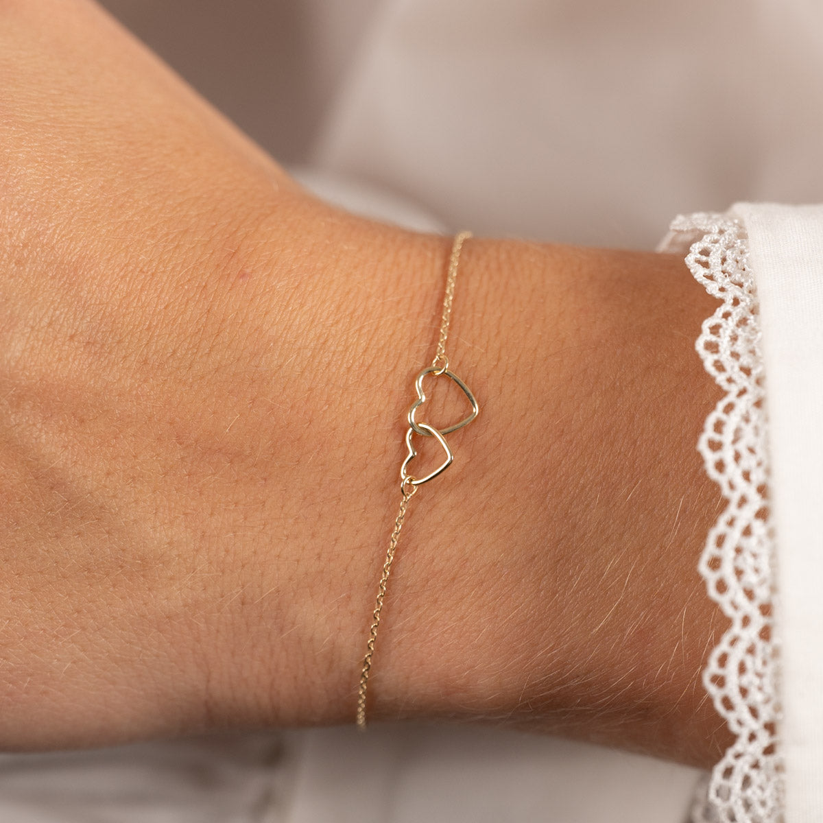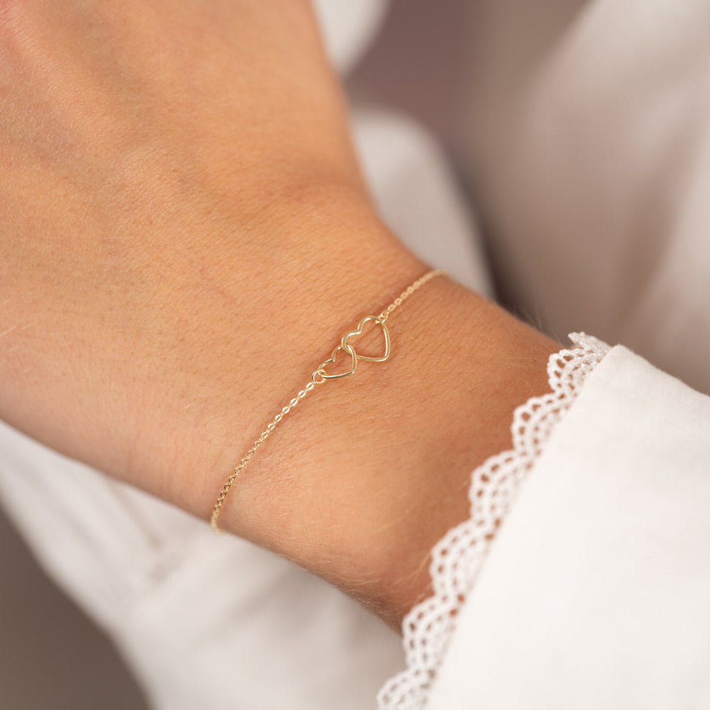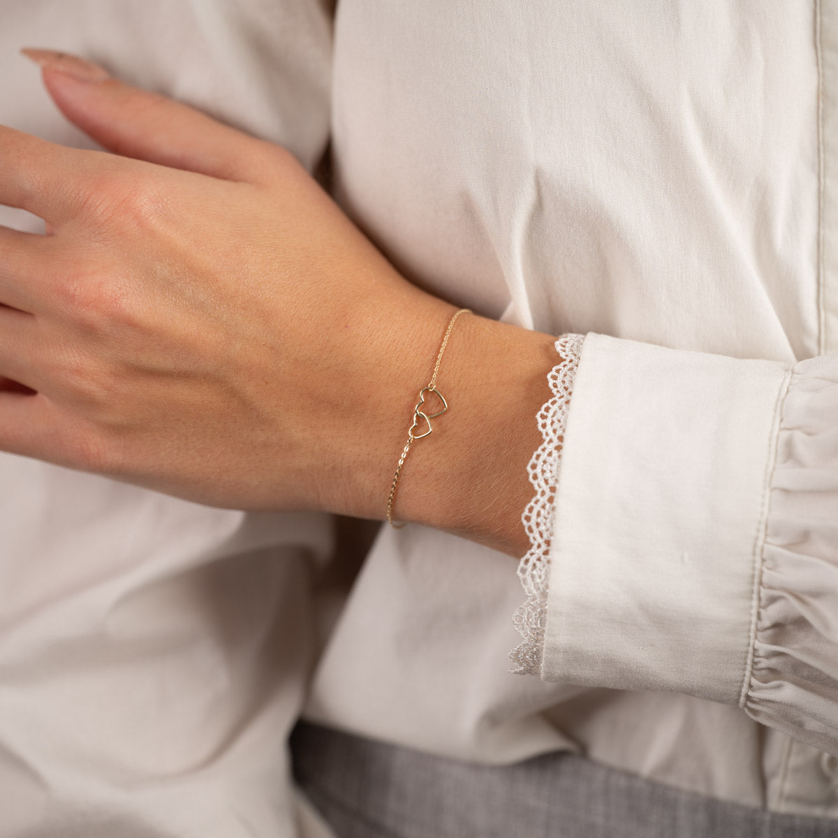 Vårt Mila armbånd er laget i 100% resirkulert 9 karat massivt gull. Armbåndet har et klassisk og tidløst design. Armbåndet har et lite hjerte og et større hjerte som sitter koblet sammen i det vakre ankerkjedet.