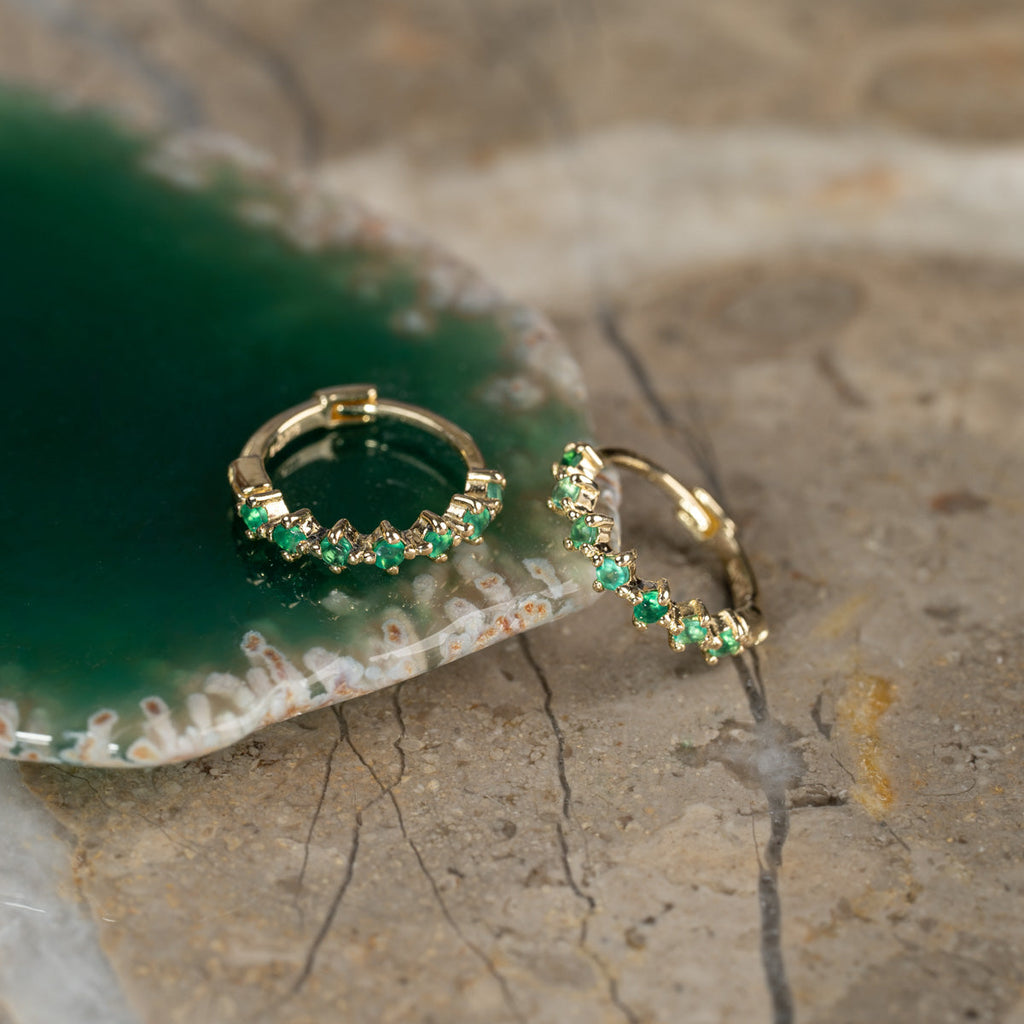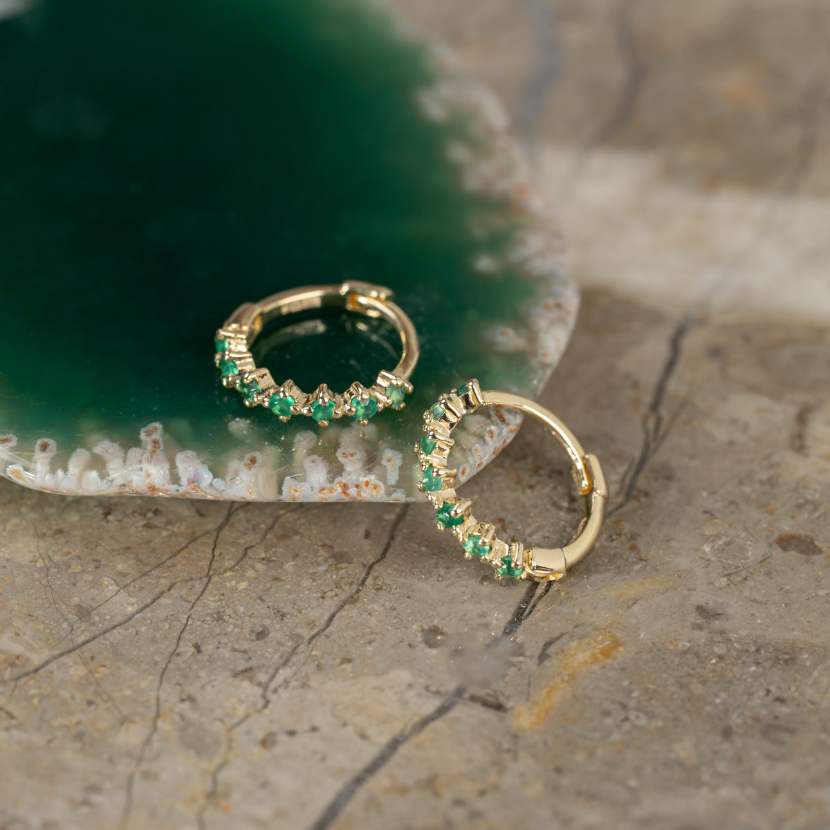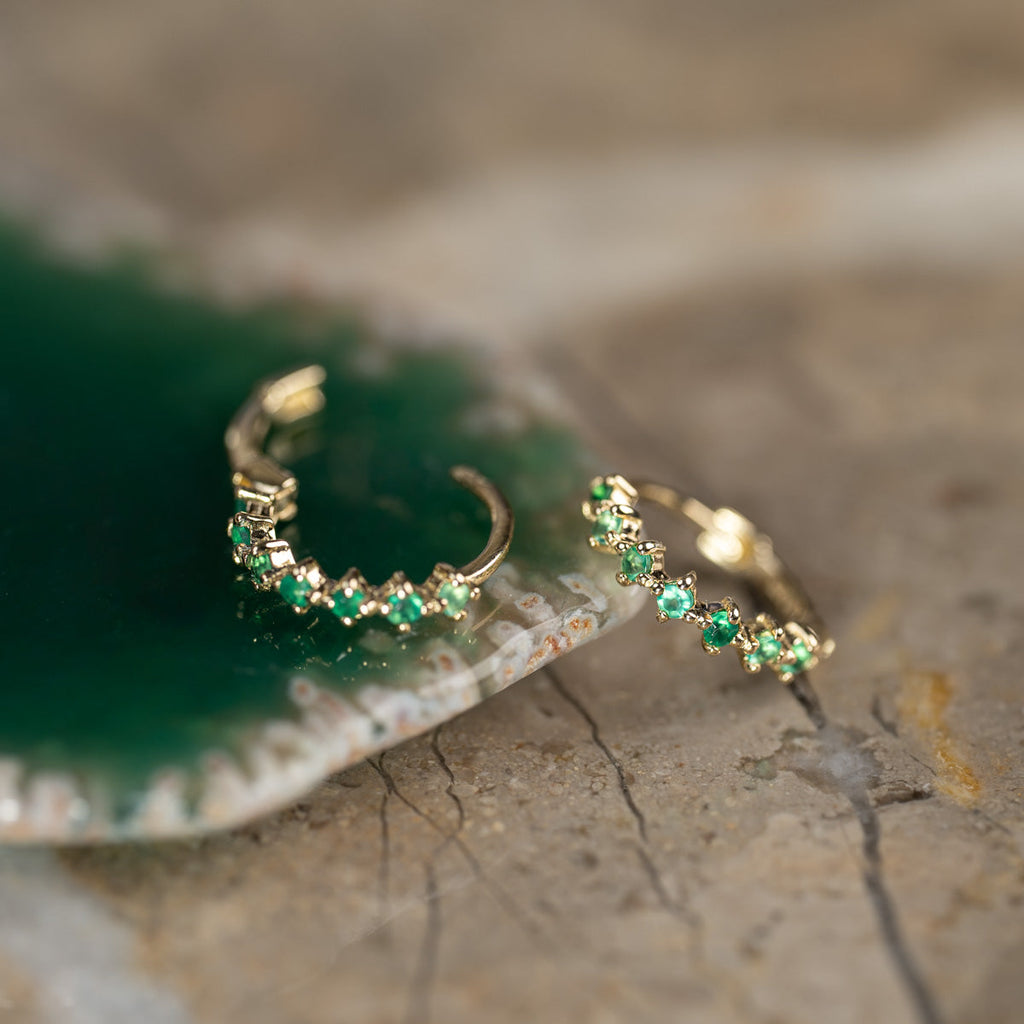 Øreringene er laget i 100% resirkulert 9 karat massivt gull med flotte, grønne agater. De fine creolene har et unikt design som gjør øreringene feminine og delikate, og de passer til enhver anledning.