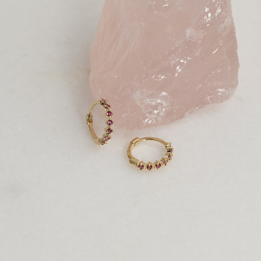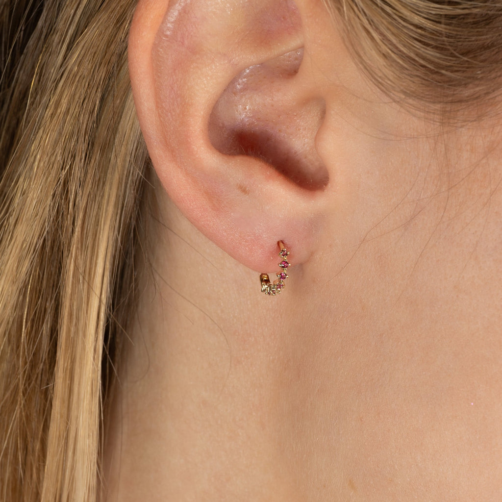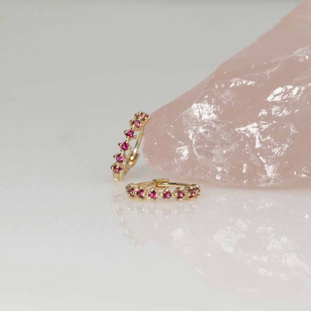Øreringene er laget i 100% resirkulert 9 karat massivt gull med flotte, rosa topaser. De fine creolene har et unikt design som gjør øreringene feminine og delikate, og de passer til enhver anledning.