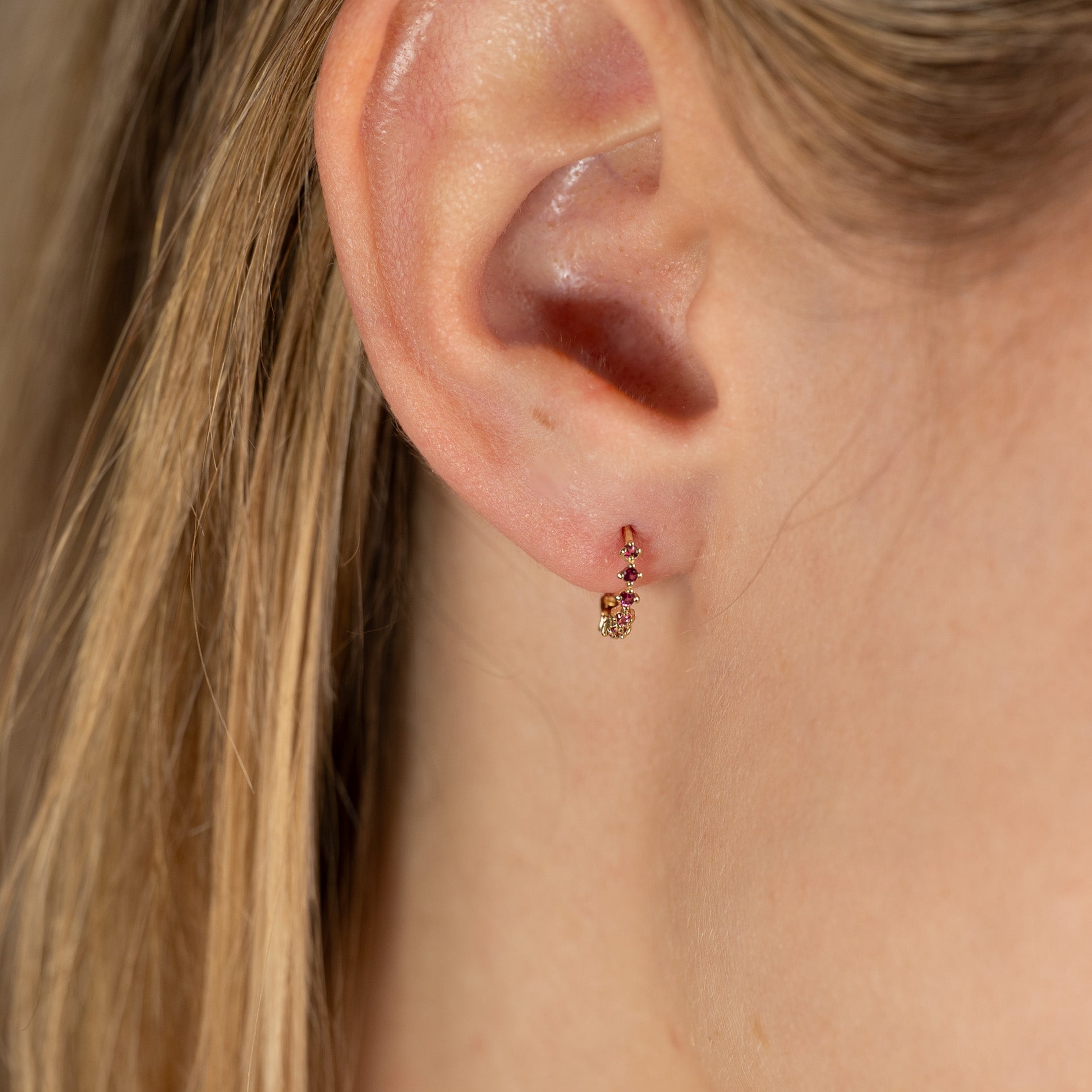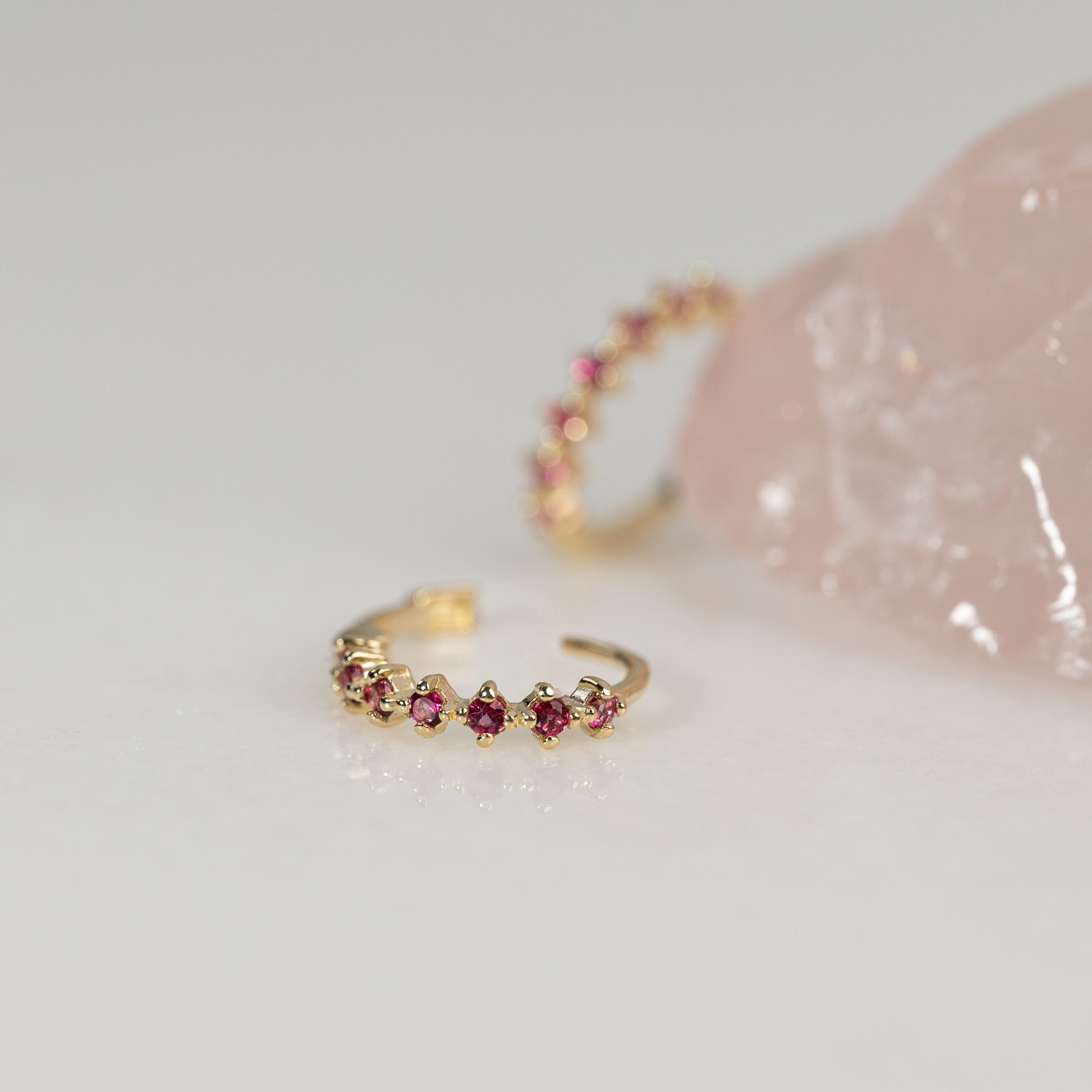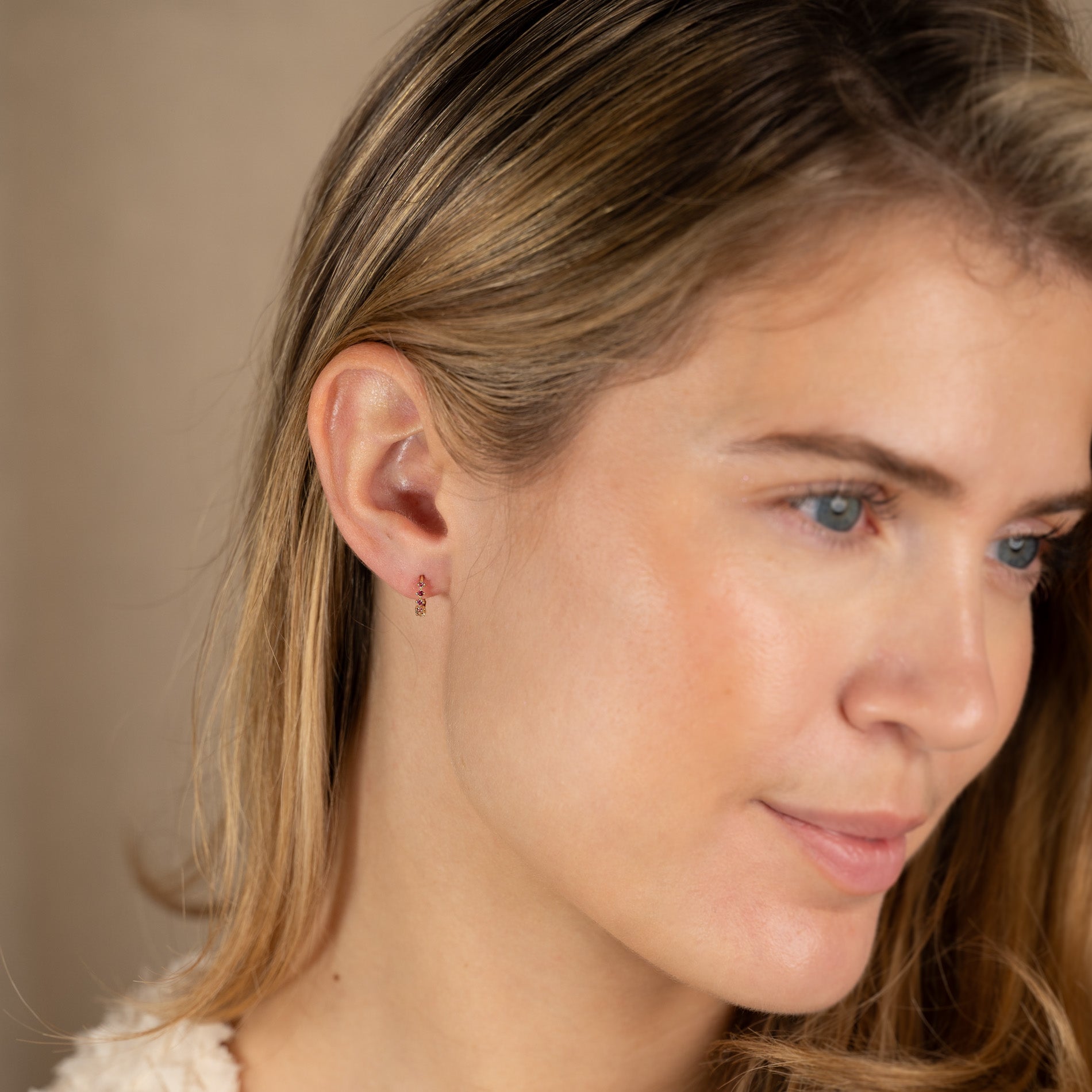 Øreringene er laget i 100% resirkulert 9 karat massivt gull med flotte, rosa topaser. De fine creolene har et unikt design som gjør øreringene feminine og delikate, og de passer til enhver anledning.
