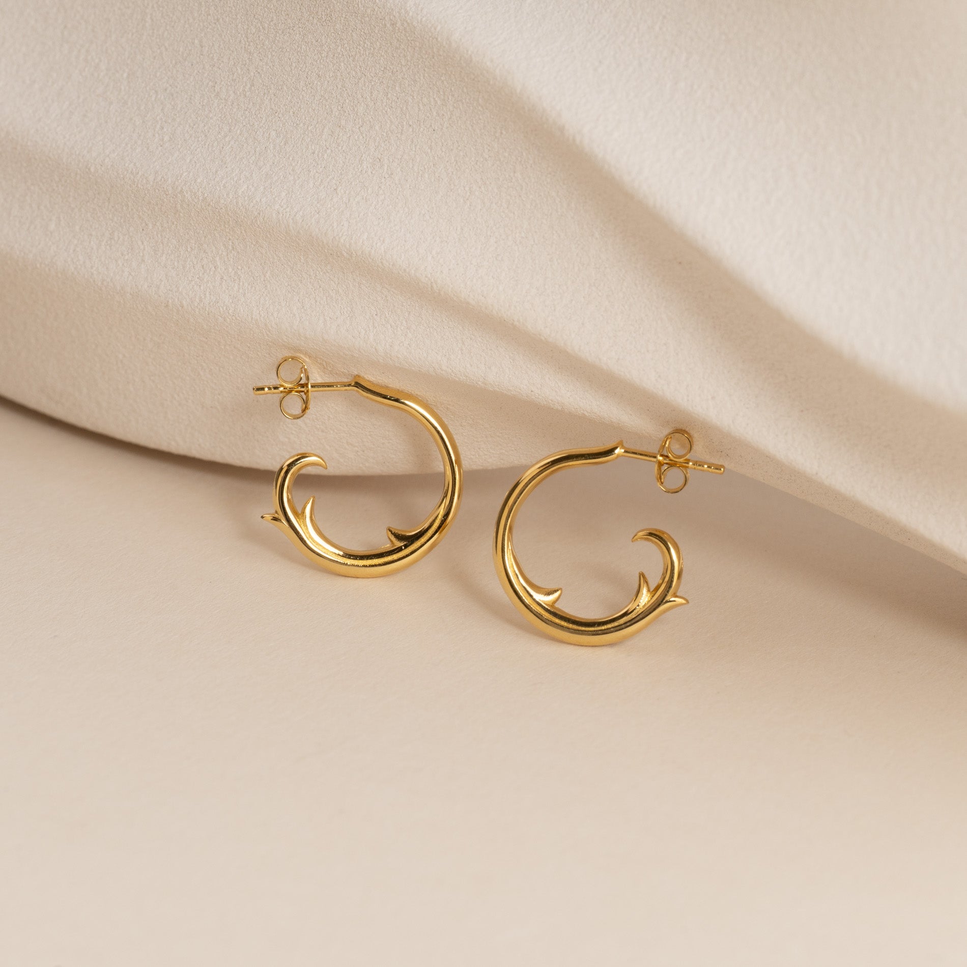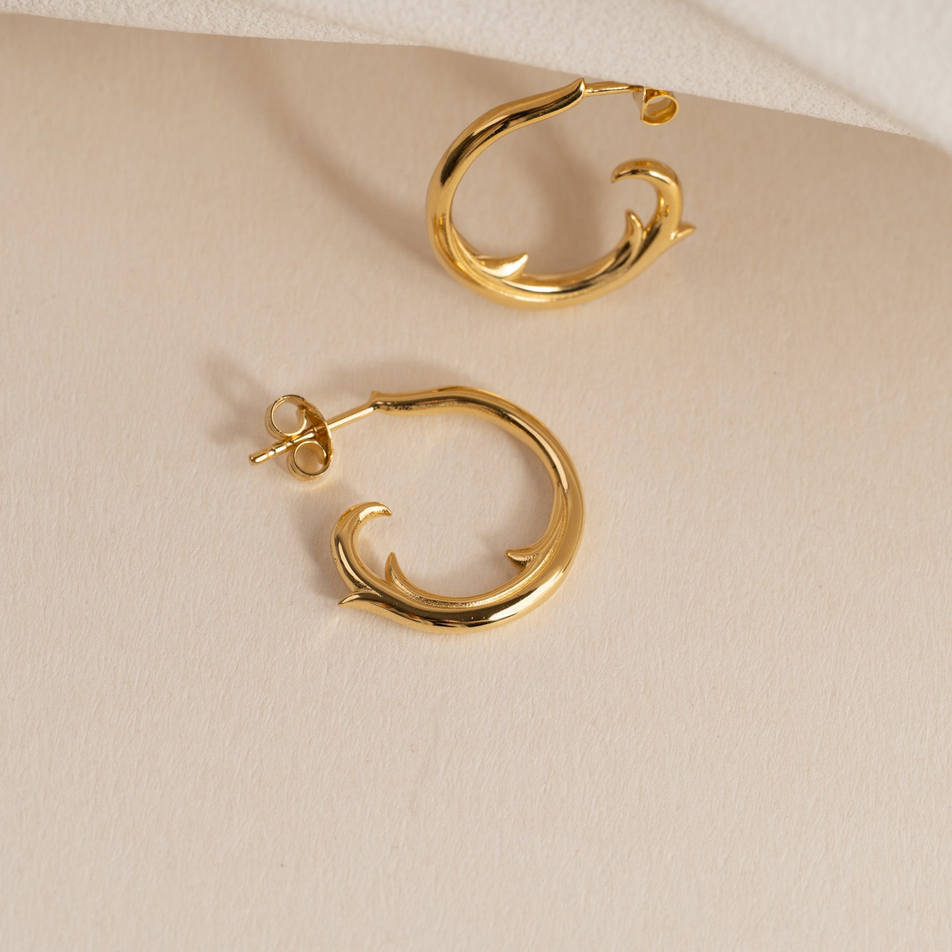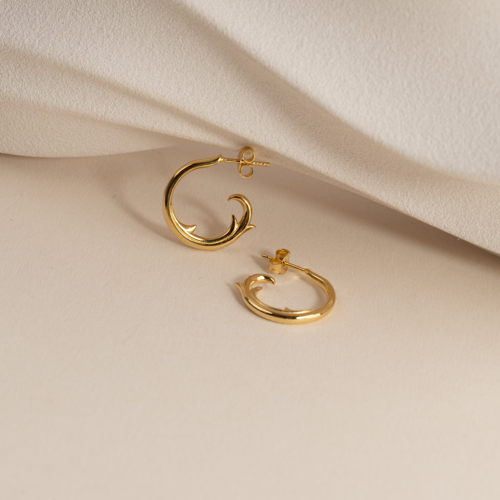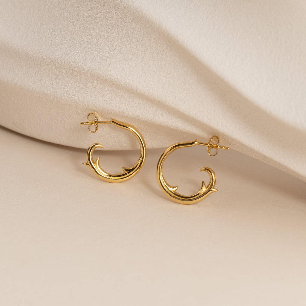 Øreringene er laget i 100% resirkulert 18 karat forgylt sterlingsølv med bølgeinspirerte detaljer som gir et dynamisk og levende uttrykk. Et unikt og øyefangende valg til både hverdag og spesielle anledninger.