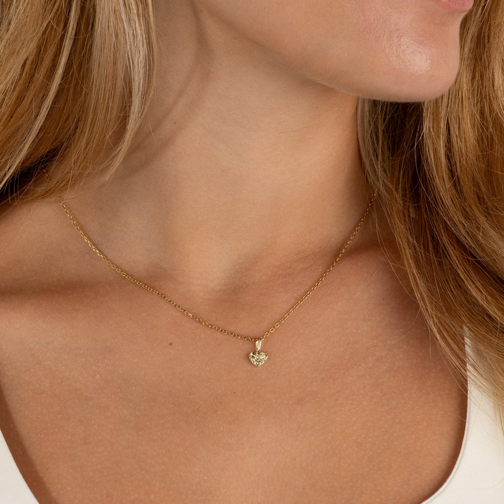 Vårt Molten Heart halskjede-anheng er laget av 100% resirkulert 9 karat massivt gull. Anhenget er formet som et hjerte med en støptoverflate - inspirert av smeltet metall.