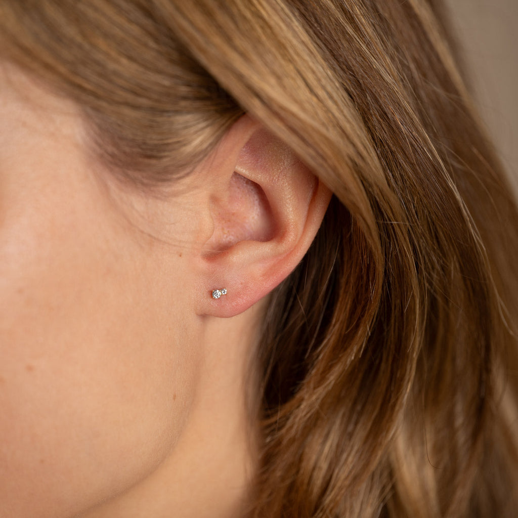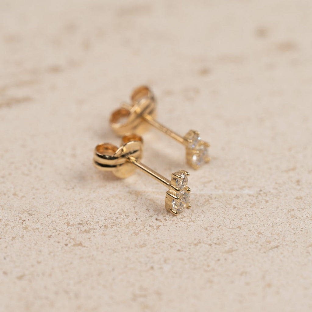 Våre Nadia øredobber er laget i 100% resirkulert massivt 9 karat gull. Øredobbene er klassiske og elegante, med en liten og en litt større hvit, rund kubisk zirkoniasten i hver ørering.