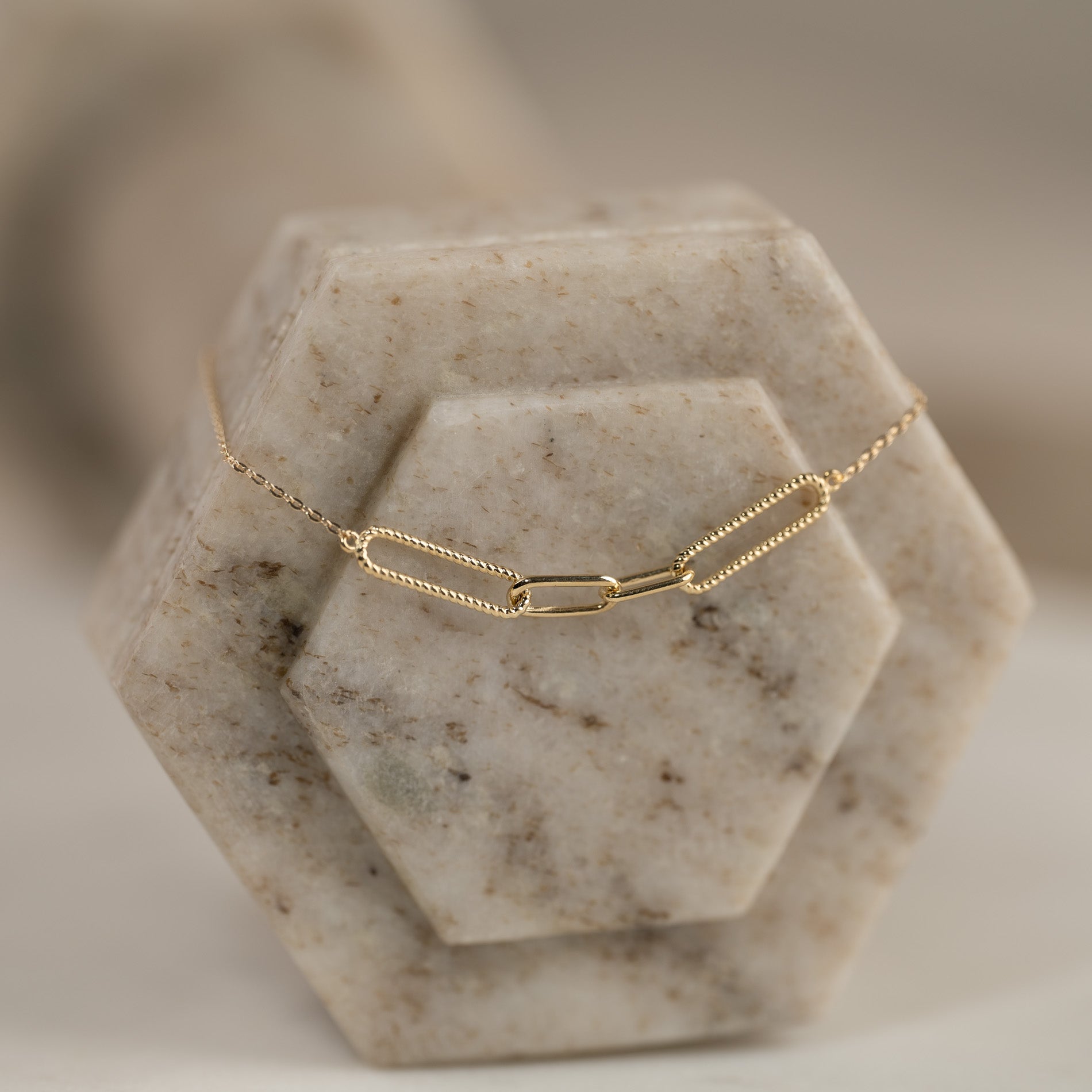 Vårt armbånd Natalie er laget av 100% resirkulert 9 karat massivt gull, med 4 forskjellige paperclip ledd. Armbåndet måler totalt 20 cm, og kan justeres ned til 16 cm lengde.