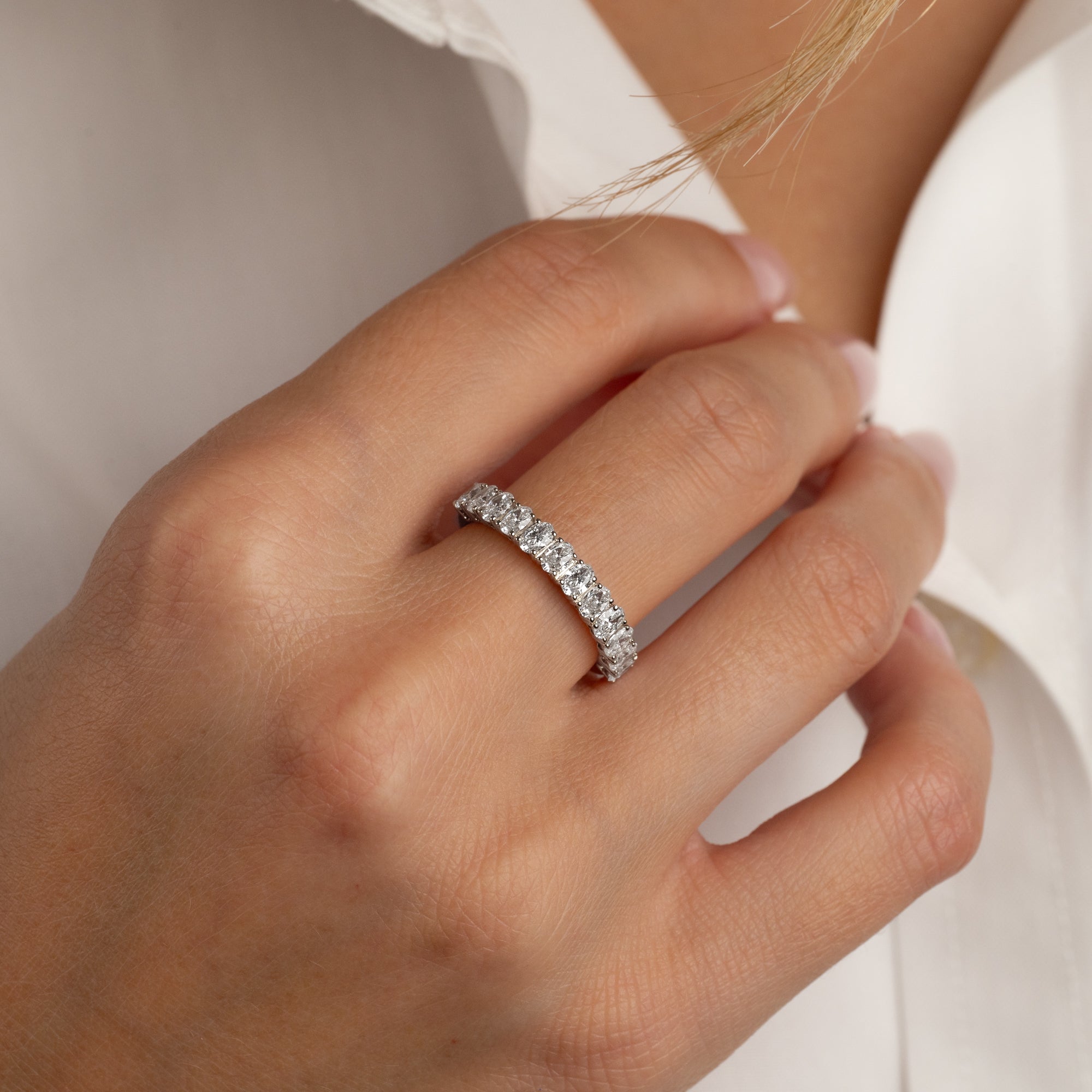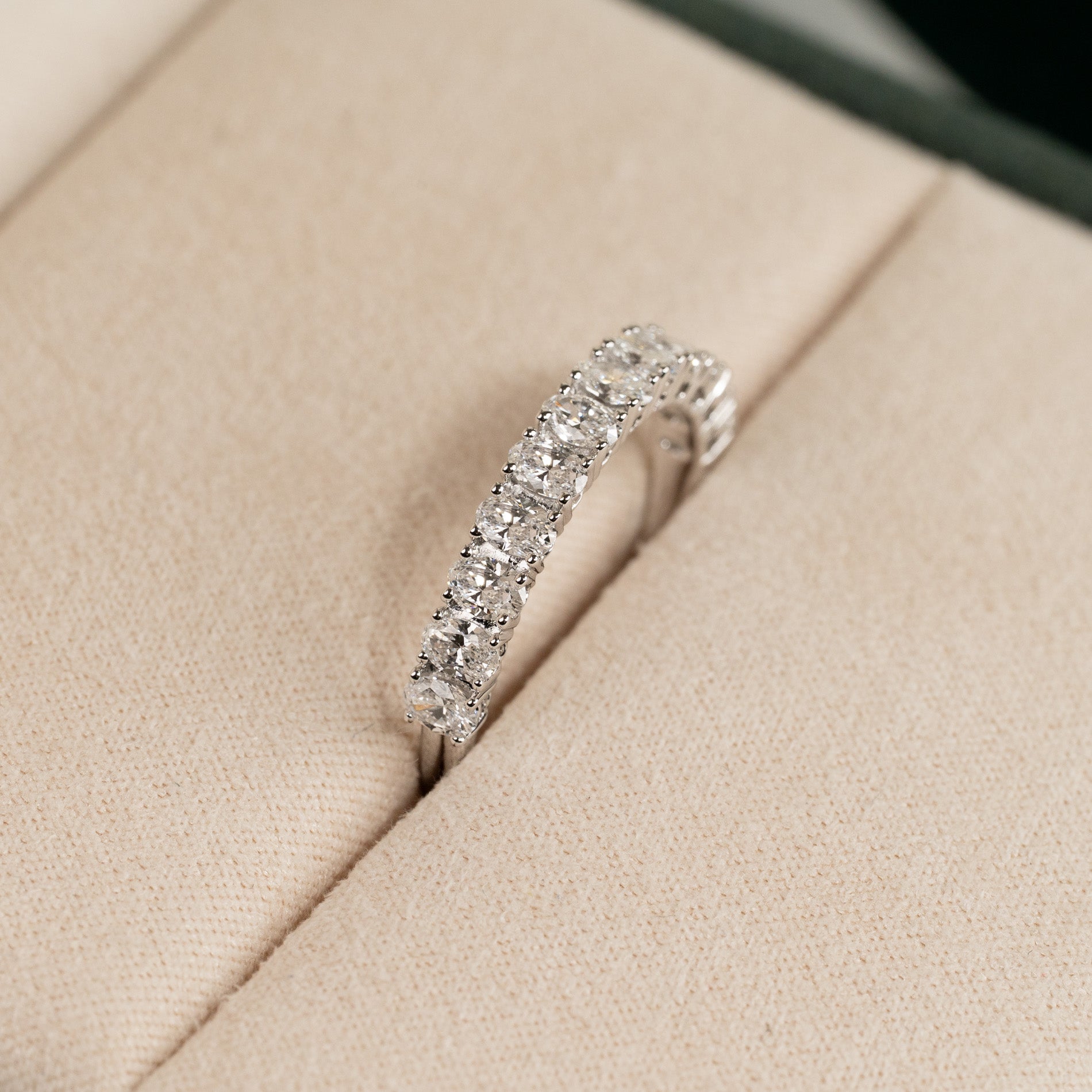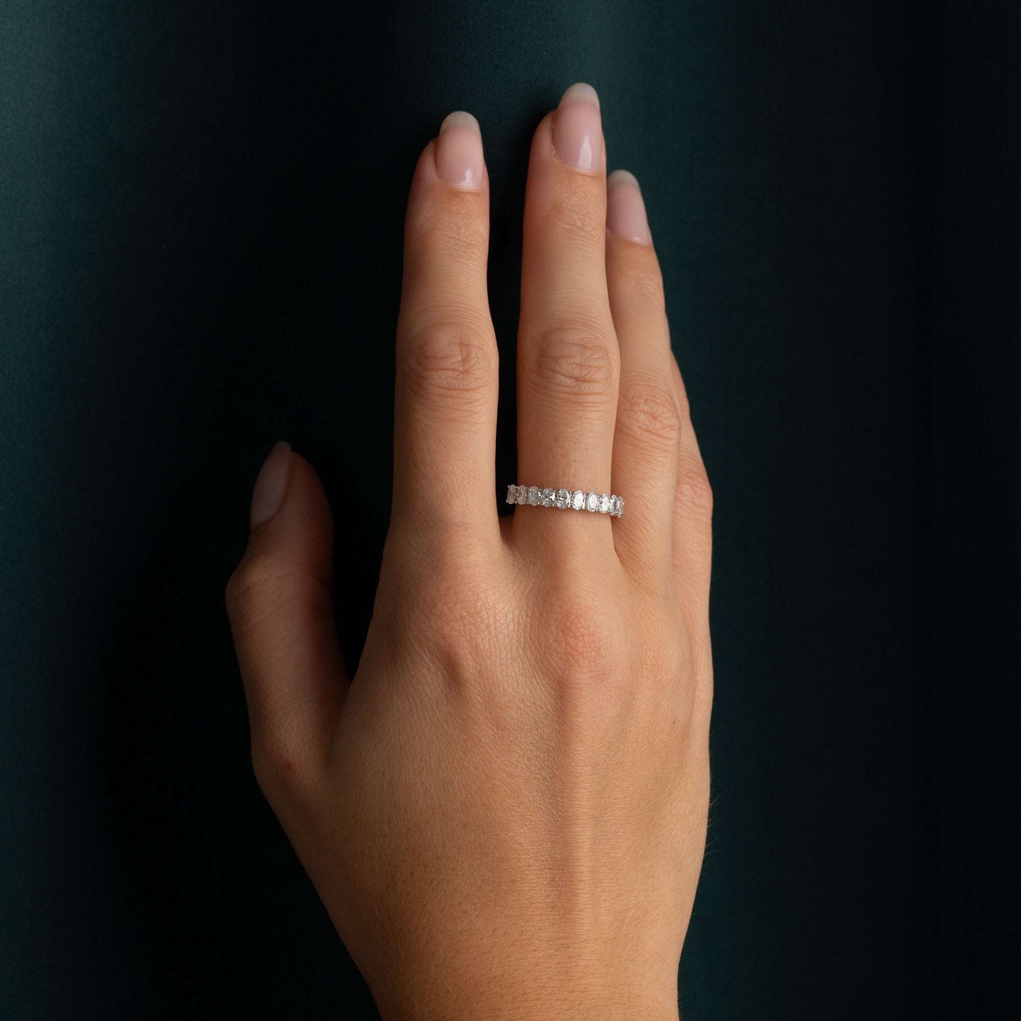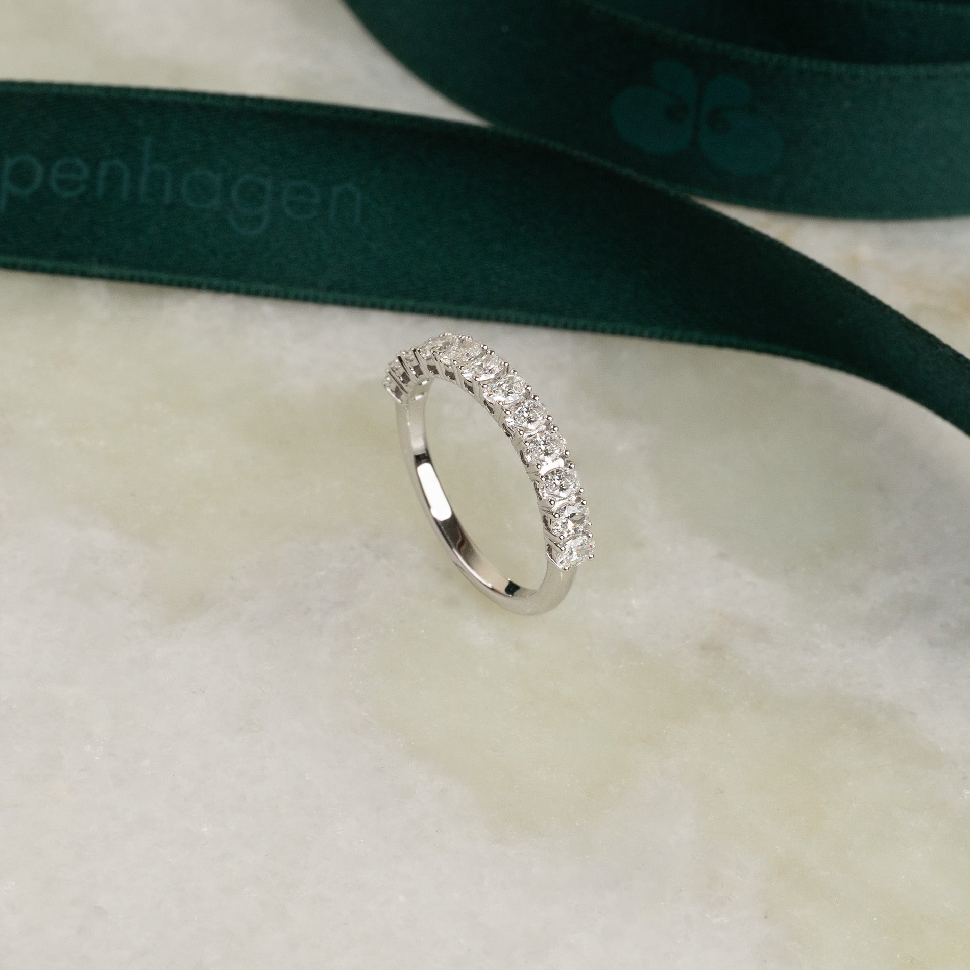 Alliansringen er laget i 14 karat massivt gull og 12 ovale lab-dyrkede diamanter på totalt 1,0 karat langs den øvre halvdelen av ringbåndet.