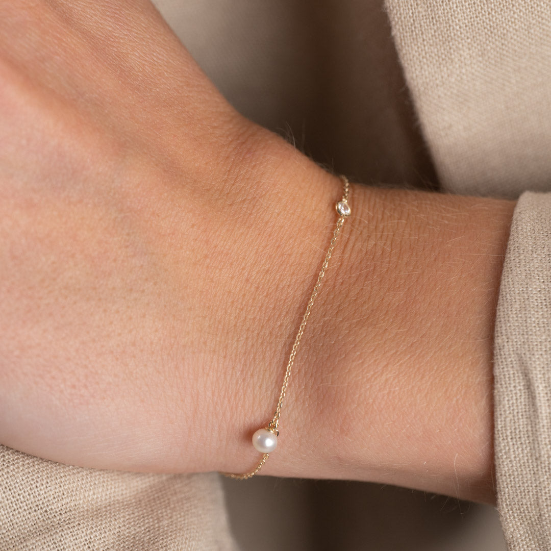 Et klassisk og feminint armbånd med en hvit ferskvannsperle og en liten zirkoniasten som gir designet en yndig eleganse.