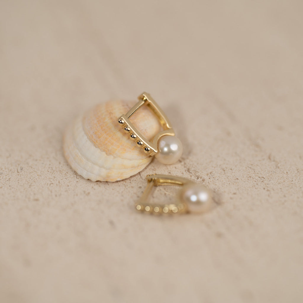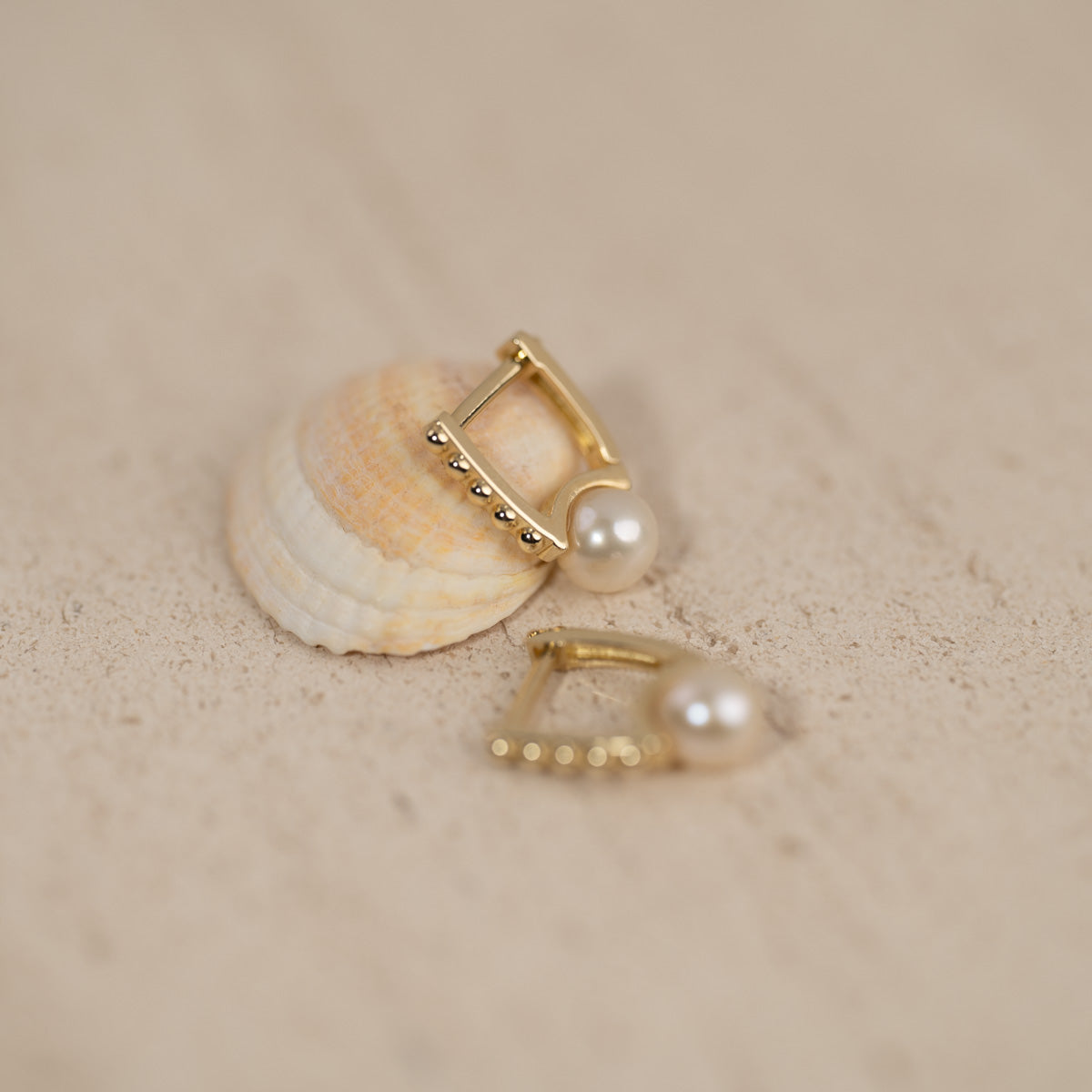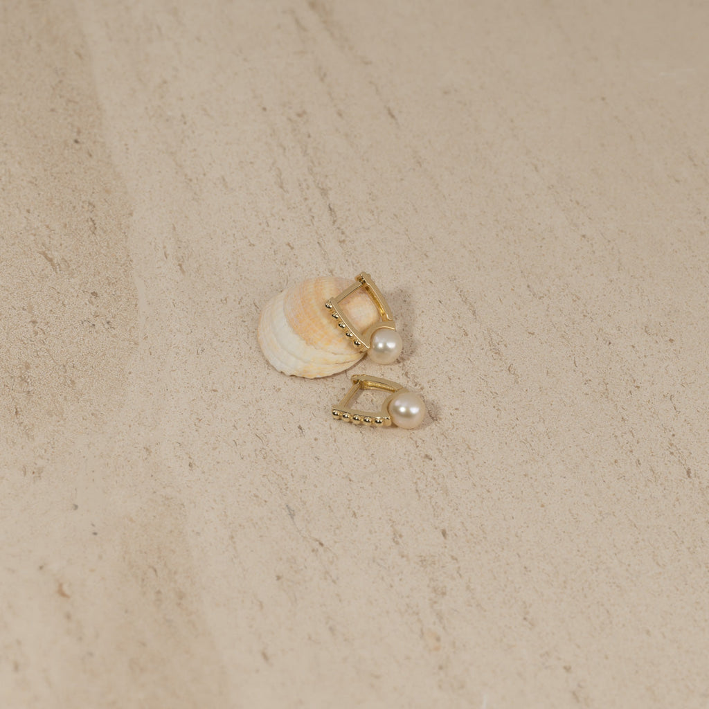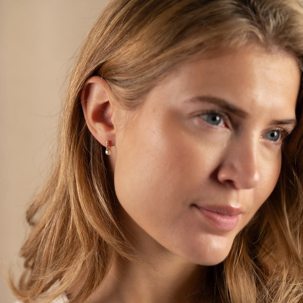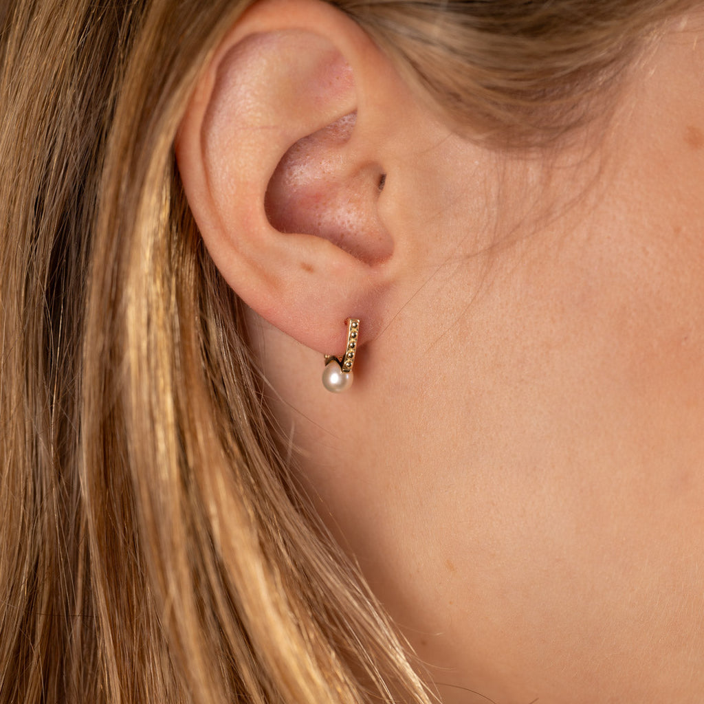 Disse øreringene er laget i 100% resirkulert 9 karat massivt gull. Øreringene er utformet som en huggie med et hengsel som låses rundt øeflippen. Forsiden av øreringen er dekorert med små gullkuler med en vakker ferskvannsperle i bunnen.