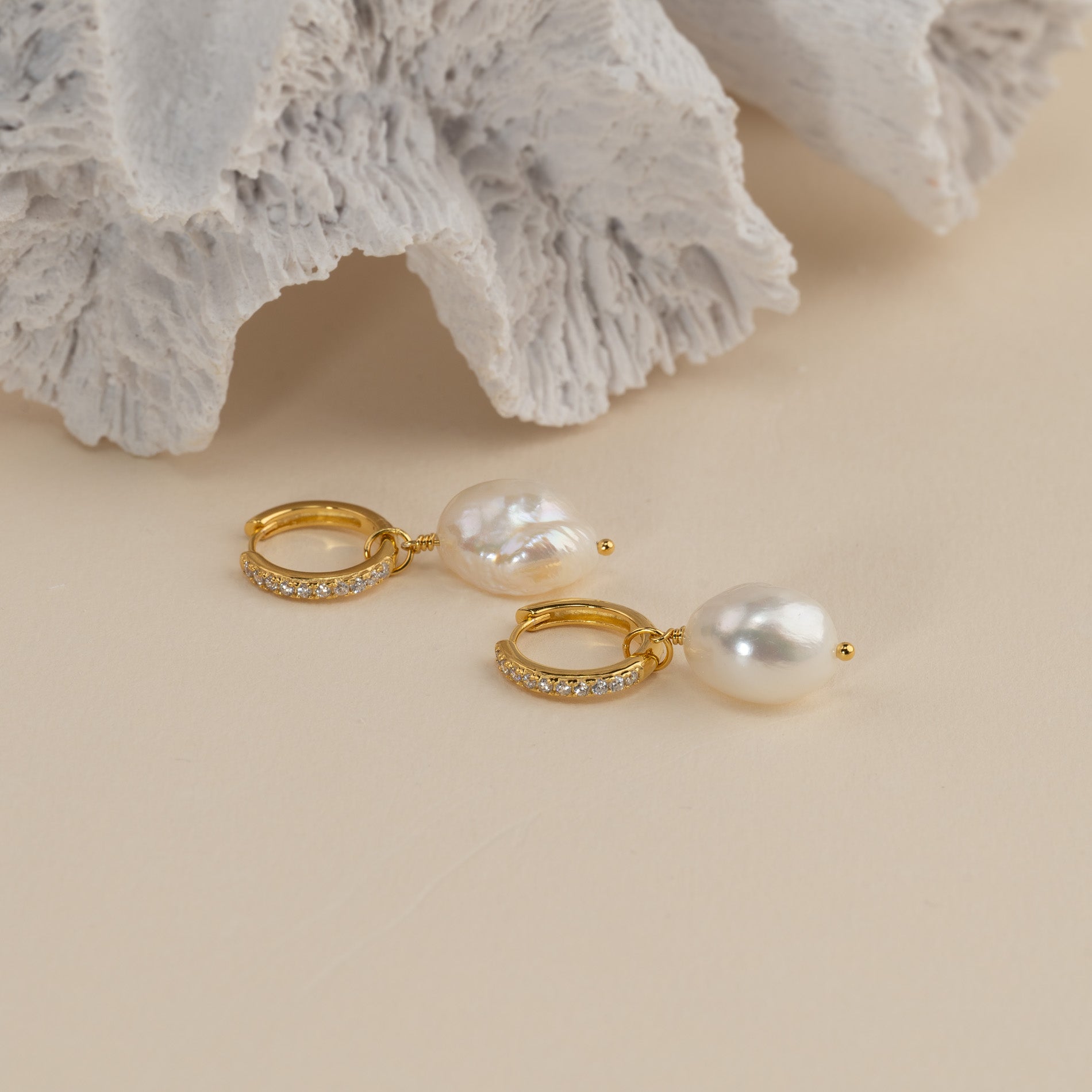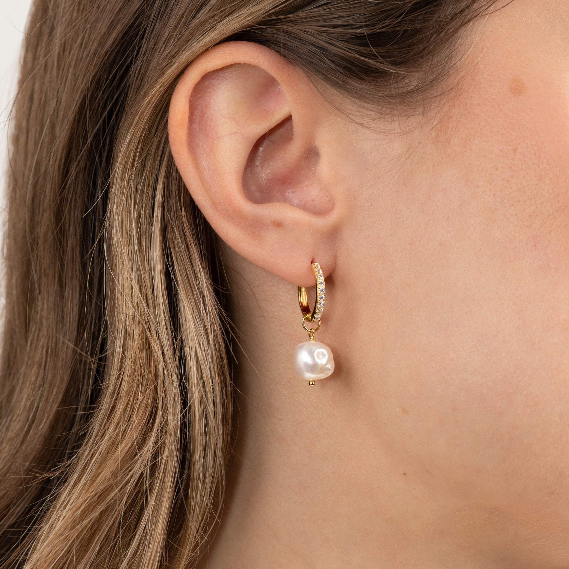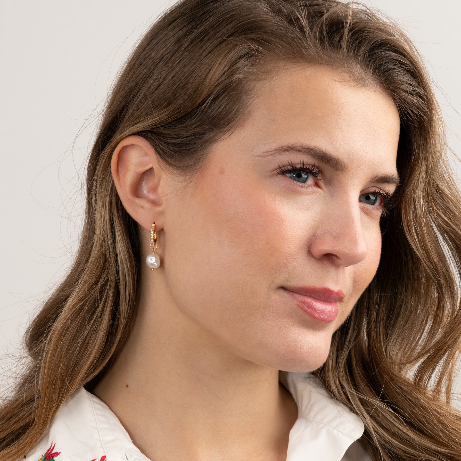 Creoler i 18 karat forgylt 925 sterlingsølv med hvite, barokek ferskvannsperler og små zirkoniasten.