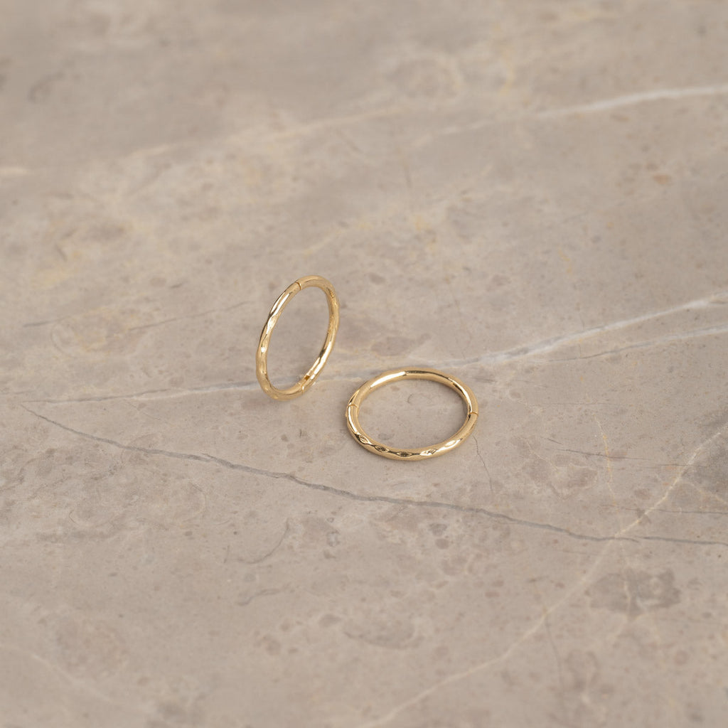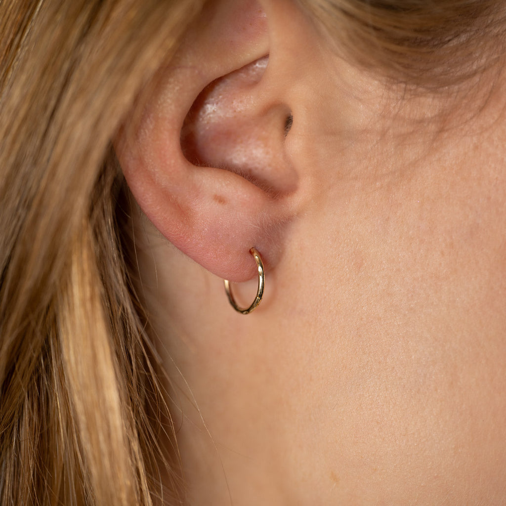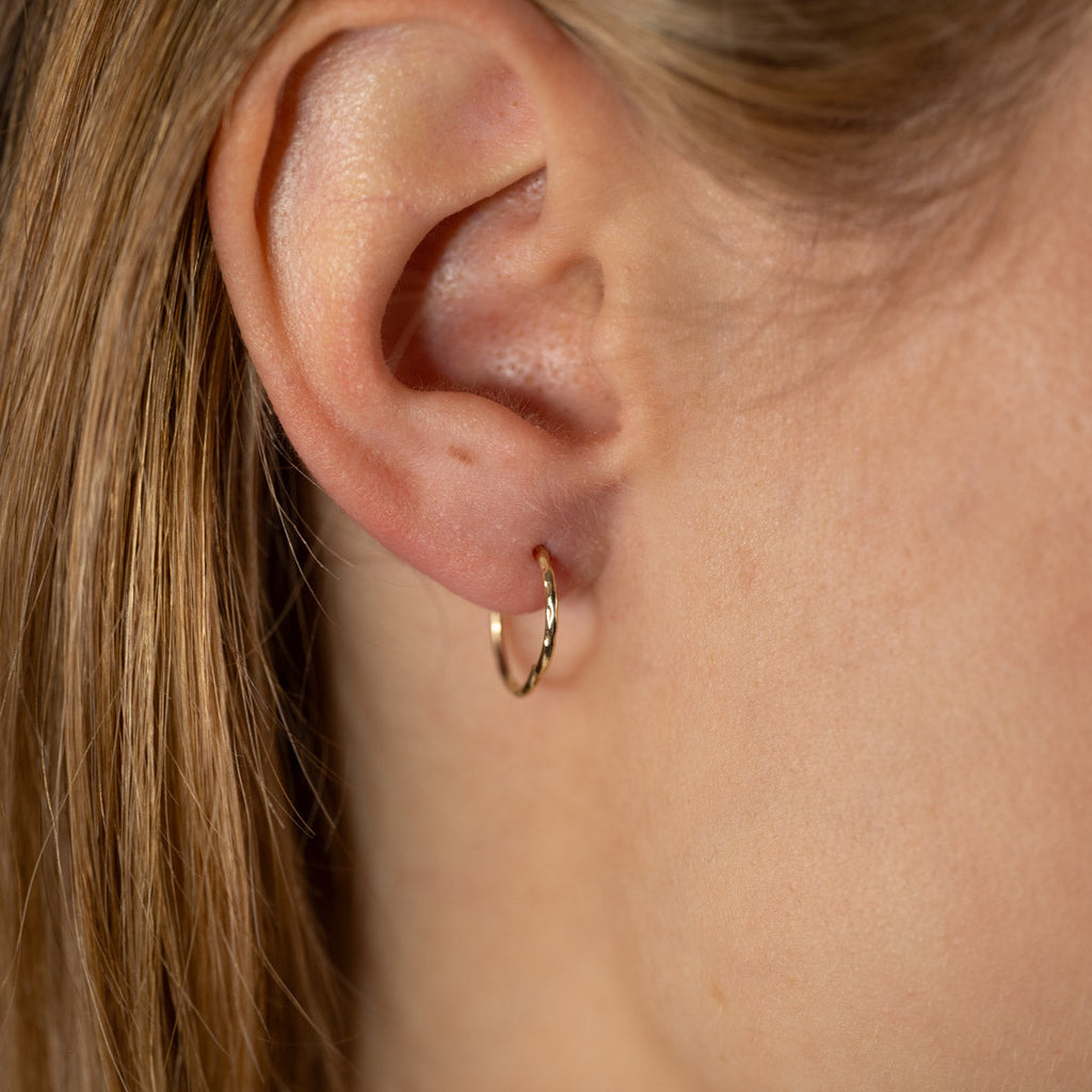 Øreringene er laget i 100% resirkulert 9 karat massivt gull. Øreringene har en fin tekstur i overflaten som gir øreringene et vakkert og undervurert uttrykk. Øreringen er perfekte til hverdags og er fine både alene eller i kombinasjon med våre andre øreringer.