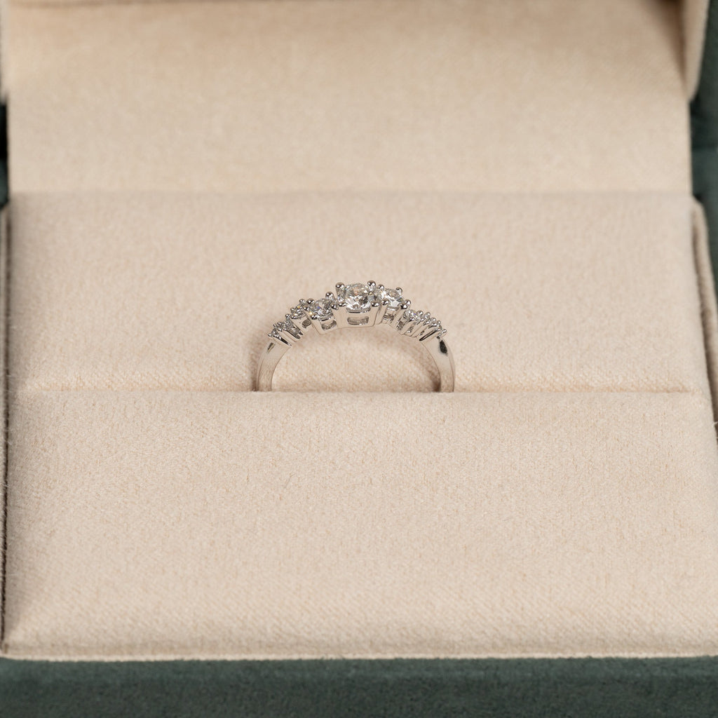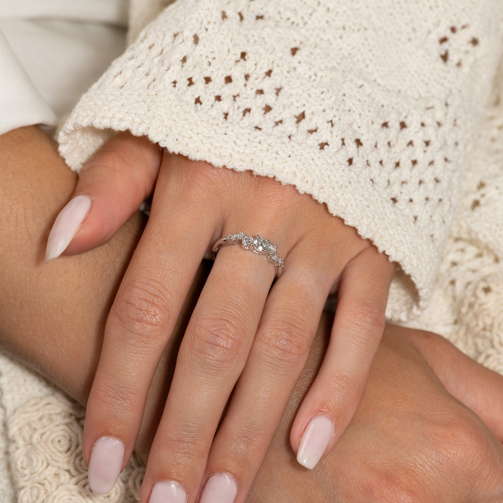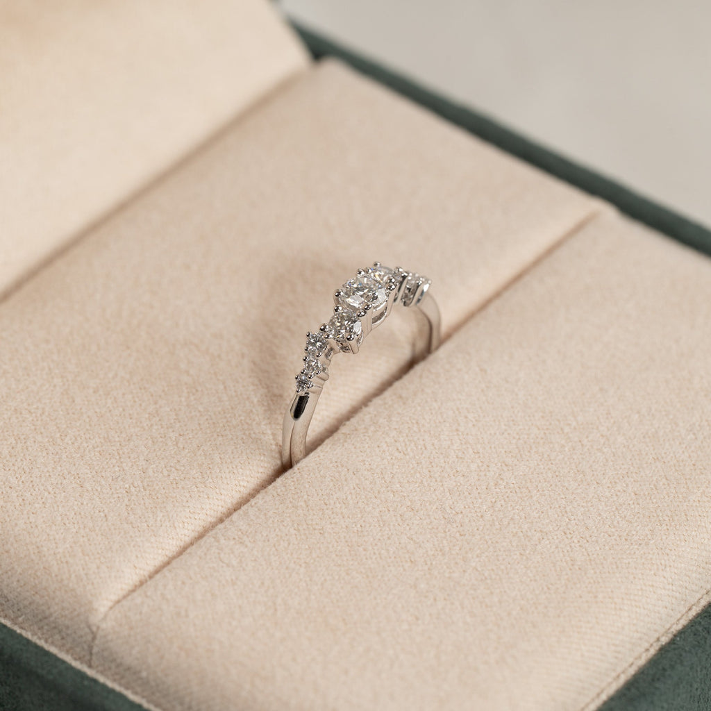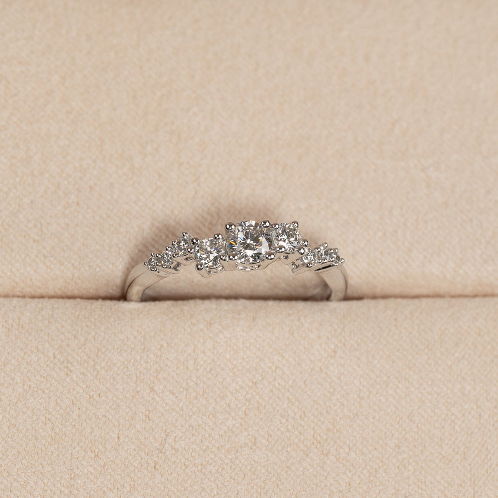 Ring i 14 karat hvitt gull med 0,5 carat laboratoriedyrkede diamanter i forskjellige størrelser; totalt 9, inkludert en midtstein på 0,22 carat. Innfatningen er vakkert og dekorativt designet, med steinene forskjøvet fra hverandre i en langstrakt klynge. Selve ringbåndet har et organisk design som gir en moderne vri.