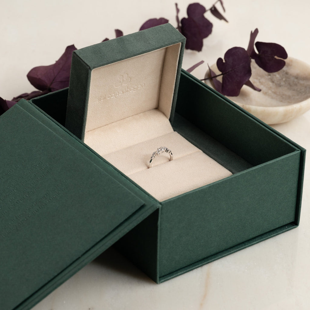 Smykket er pent og sikkert plassert i en smykkeboks som er trukket med vegansk semsket skinn.