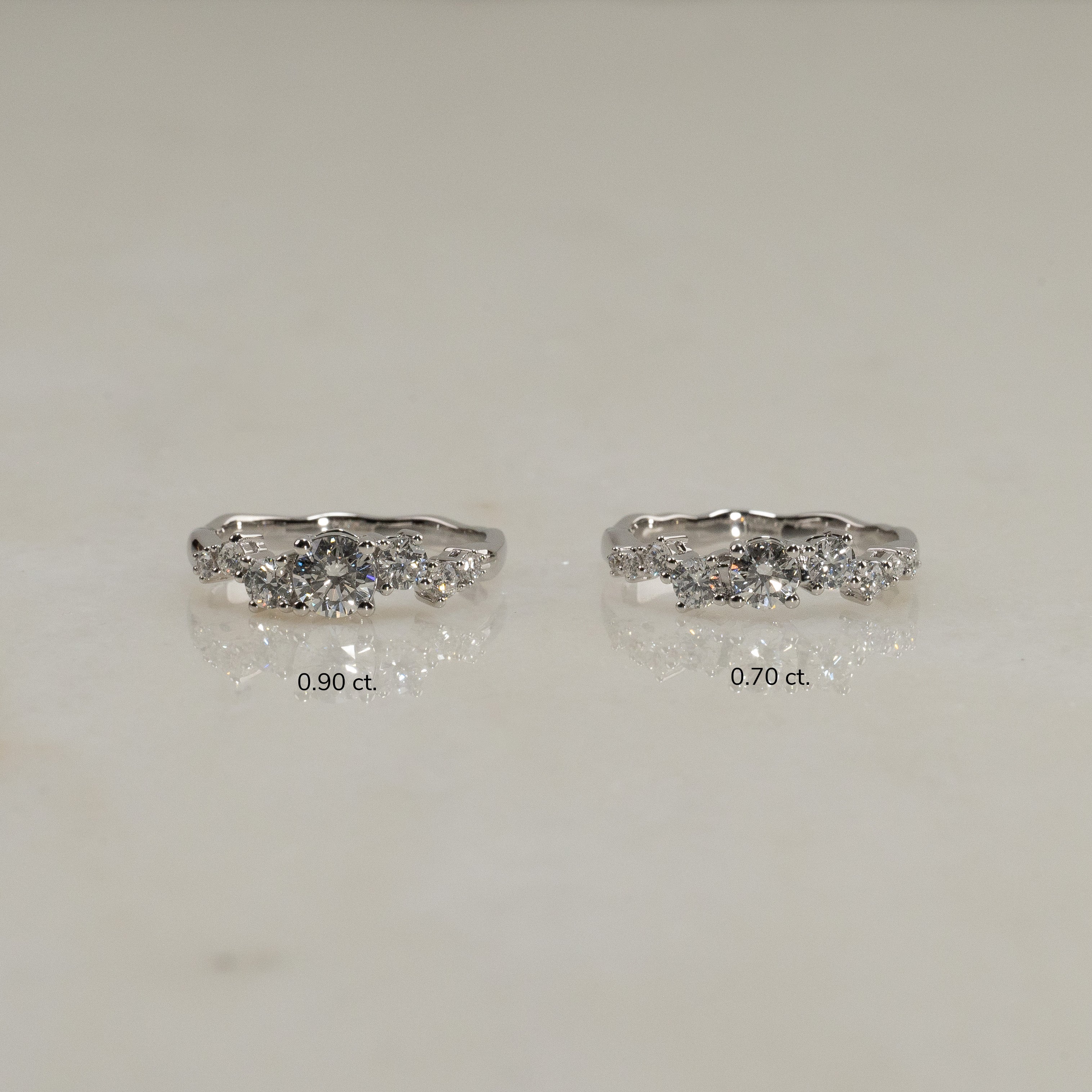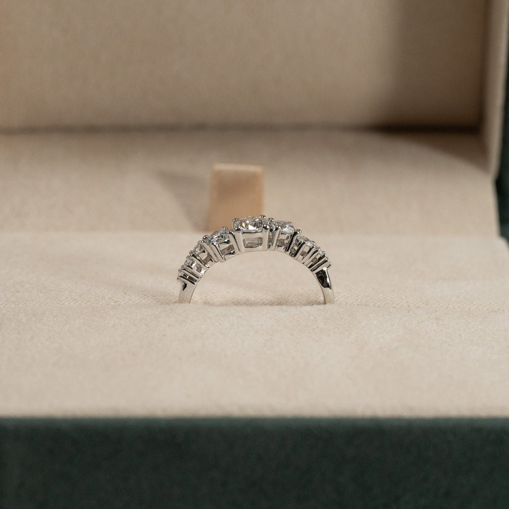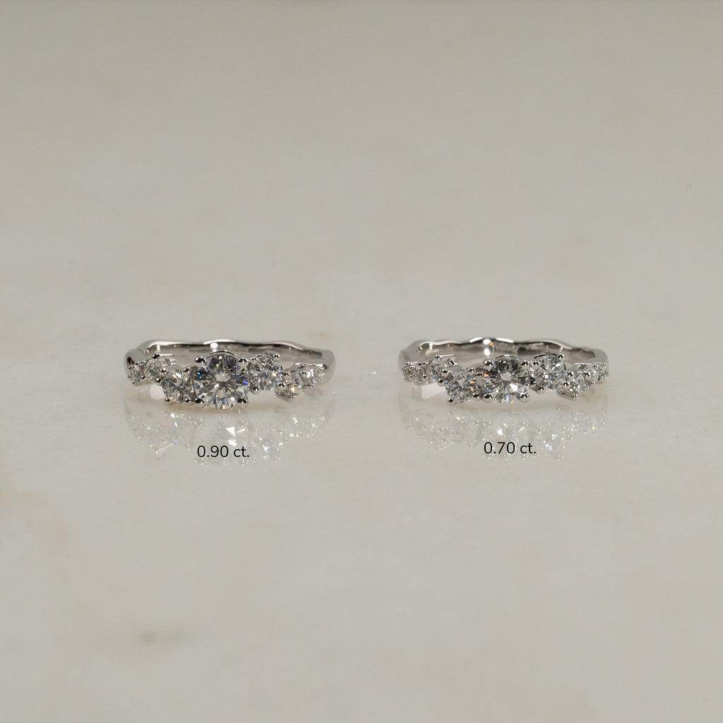 Ring i 14 karat hvitt gull med 0,7 kt. lab-dyrkede diamanter i graderte størrelser; totalt 9 stk. - inkludert en midtsten på 0,3 kt. Omfatningen er vakkert og dekorativt utformet, der stenene er forskjøvet fra hverandre i en langstrakt klynge. Selve ringskinnen har et organisk design som gir ringen en moderne vri.