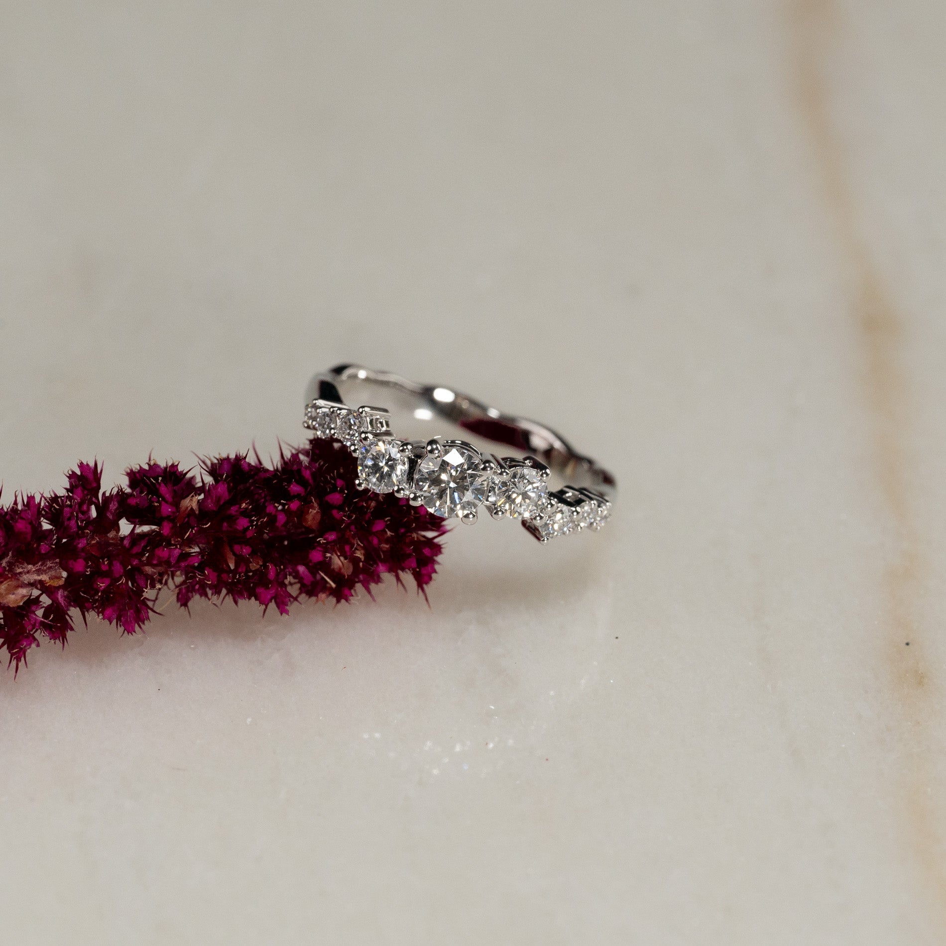 Ringen er i 14 karat massivt hvitt gull med ni etisk skapte lab-dyrkede diamanter på totalt 0,7 kt. Diamantene har fargen E/F (River) og klarheten VVS. Smykket er laget med omtanke; diamantene er blant annet produsert med solenergi, og gullet er 100% sertifisert resirkulert.