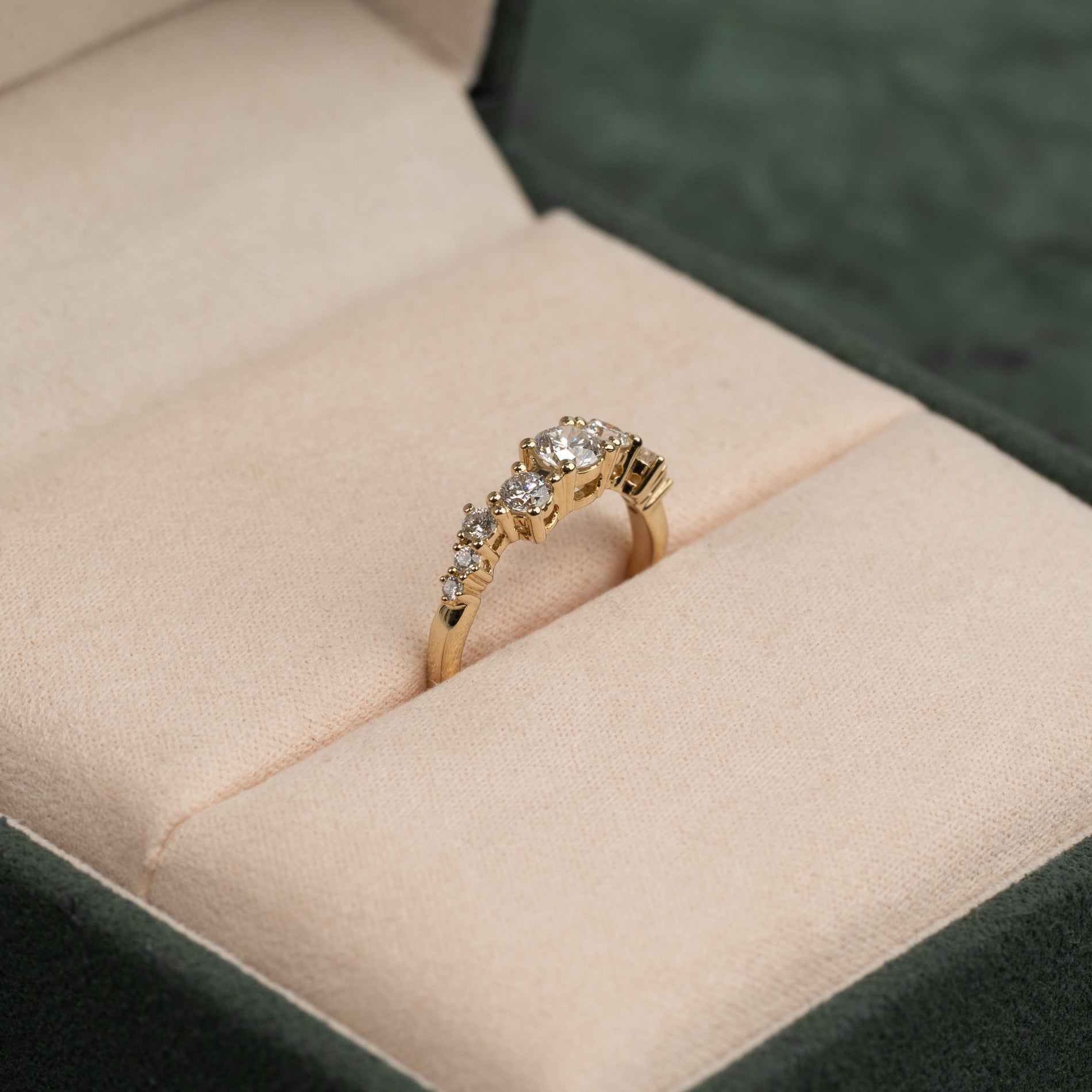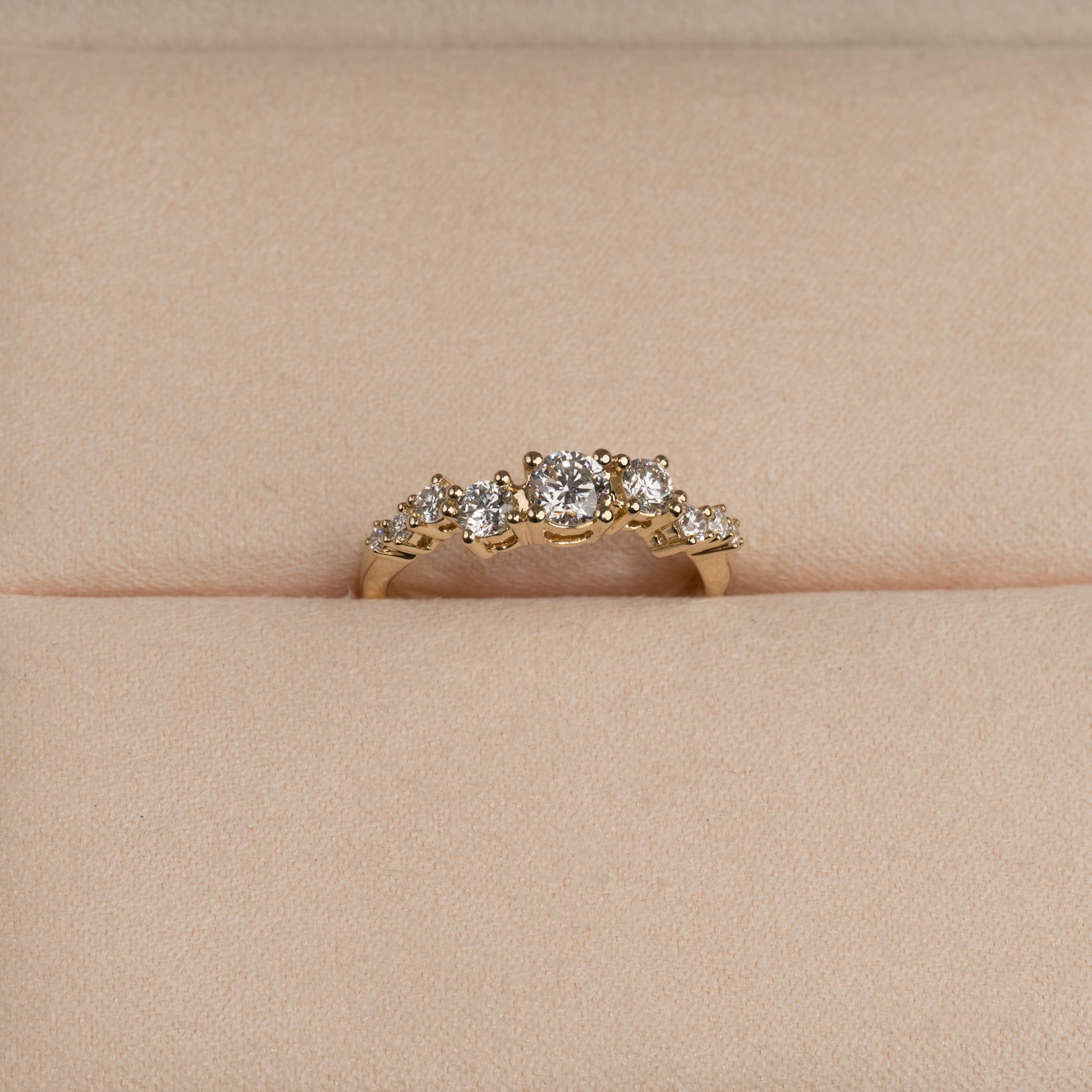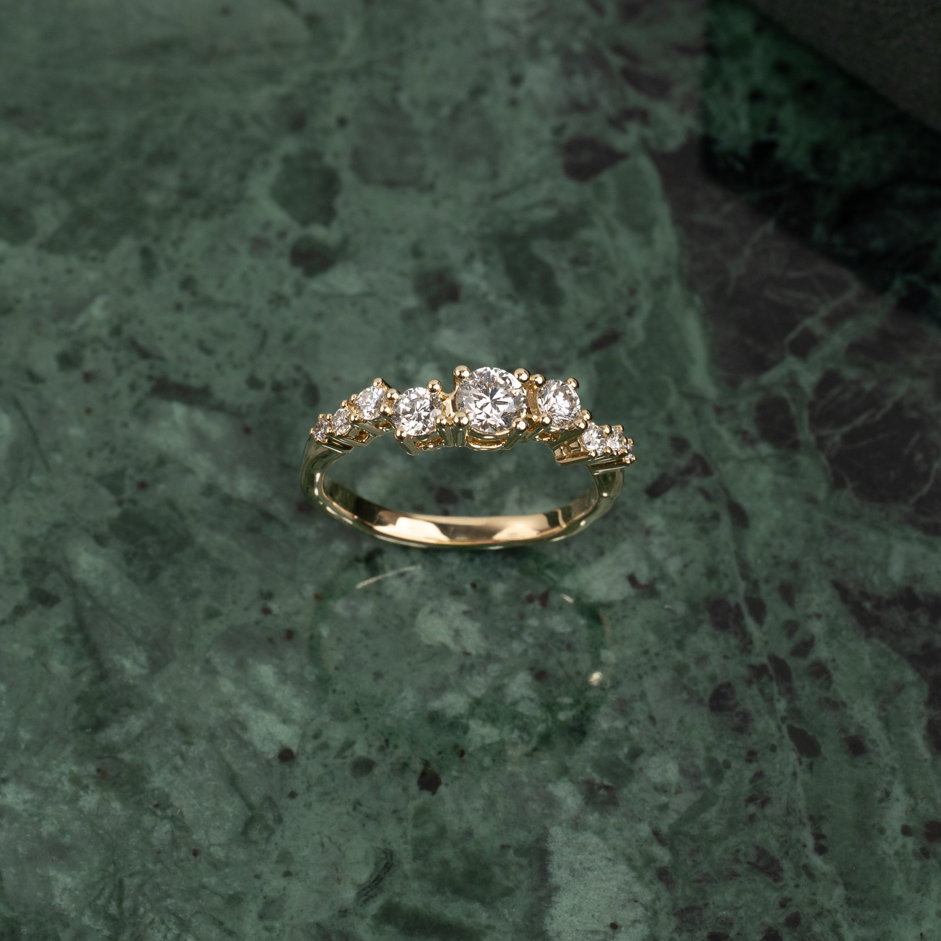 Ring i 14 karat gull med 0,7 kt. lab-dyrkede diamanter i graderte størrelser; totalt 9 stk. - inkludert en sentersten på 0,3 kt. Fatningen er vakkert og dekorativt utformet, der stenene er forskjøvet fra hverandre i en langstrakt klynge. Selve ringskinnen har et organisk design som gir den en moderne vri.