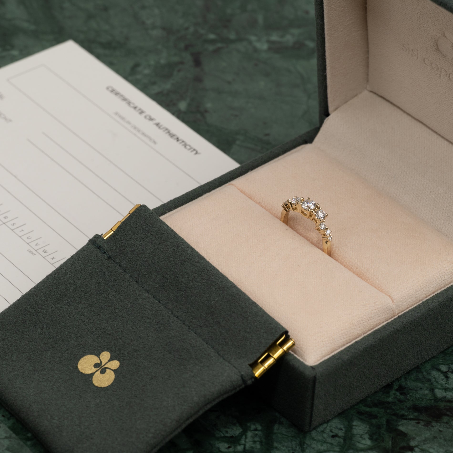Ringen er i 14 karat massivt gull med ni lab-dyrkede diamanter på totalt 0,7 kt. Diamantene har fargen E/F (River) og klarheten VVS. Smykket er laget med omhu; diamantene er blant annet produsert med solenergi, og gullet er 100% sertifisert resirkulert.