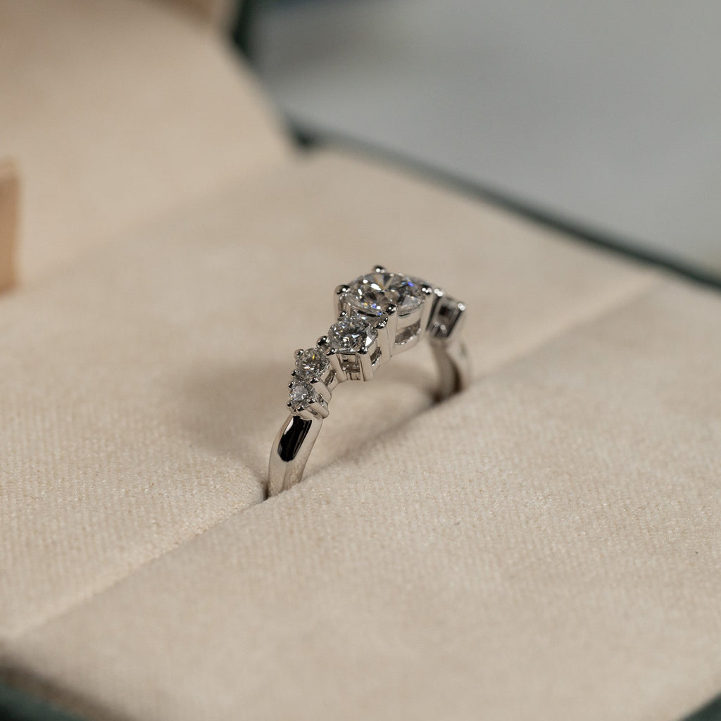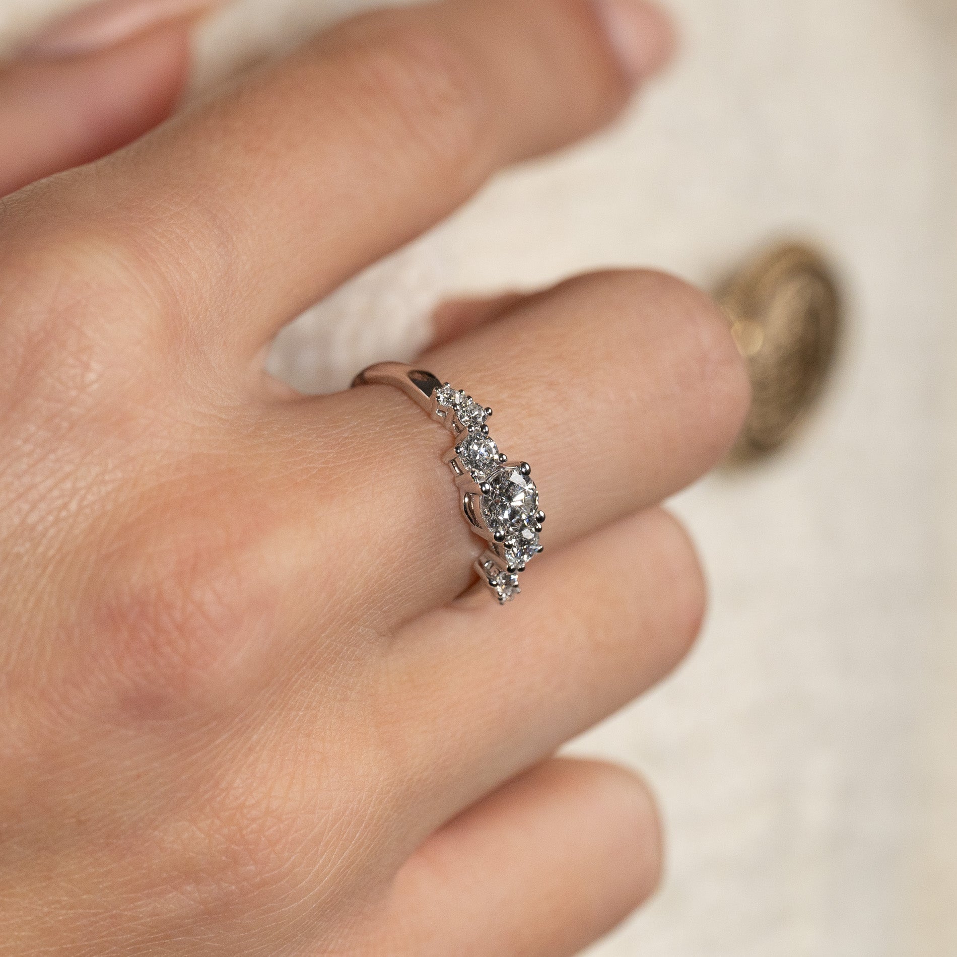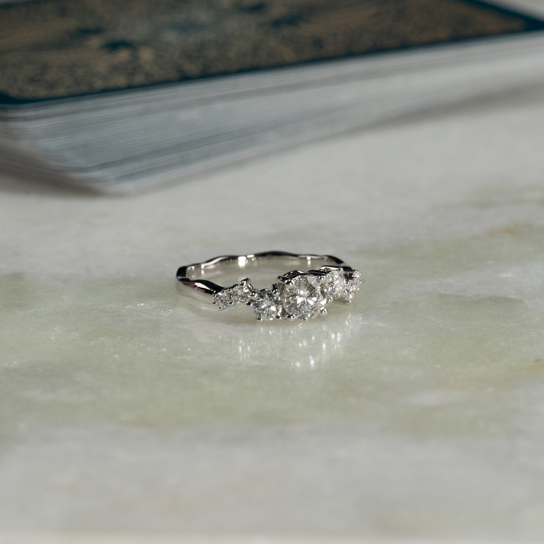 Ring i 14 karat hvitt gull med 0,9 ct. lab-dyrkede diamanter i graderte størrelser; totalt 7 stk. - inkludert en midtsten på 0,5 ct. Omfatningen er vakkert og dekorativt utformet, hvor stenene er forskjøvet fra hverandre i en langstrakt klynge. Selve ringskinnen har en organisk design som gir den en moderne vri.