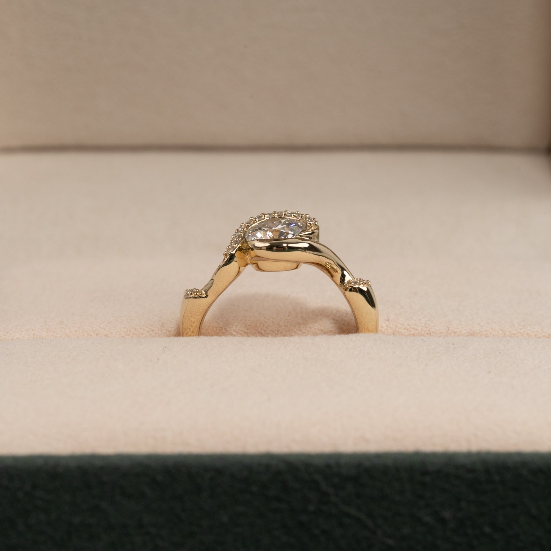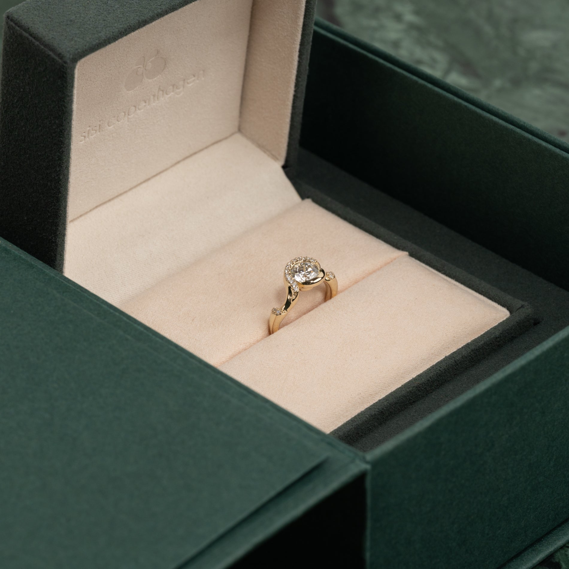 Ringen er fremstilt i 14 karat gull og har en vakker brillantslipt laboratorieskapt senterdiamant på 1,0 ct. Den har et unikt og organisk uttrykk, hvor klassiske elementer kombineres med strukturelle detaljer inspirert av naturen.