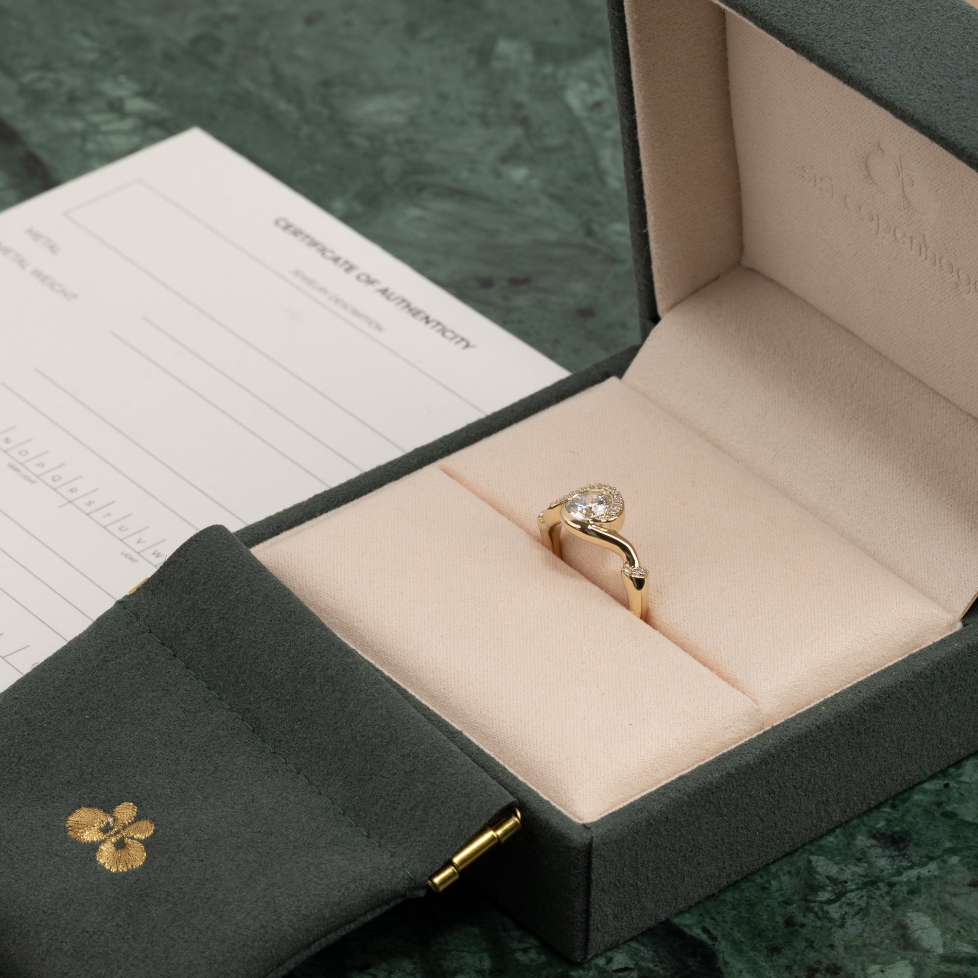 Ringen leveres i vår eksklusive Diamond Collection-boks med smykkeeske, sertifikat og pouch. Boksen er bundet med gavebånd og er perfekt dersom ringen skal gis i gave.