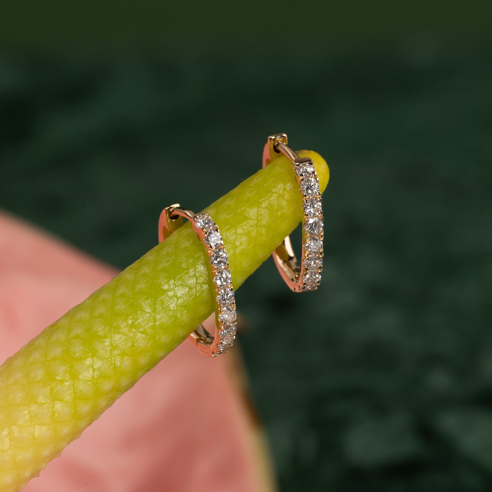 De ovale diamantcreolene er laget med lab-grown diamanter. Diamantene har fargen E/F (River) og klarhet VVS. Smykket er laget med omtanke; diamantene er produsert med blant annet solenergi, og gullet er 100 % sertifisert resirkulert.