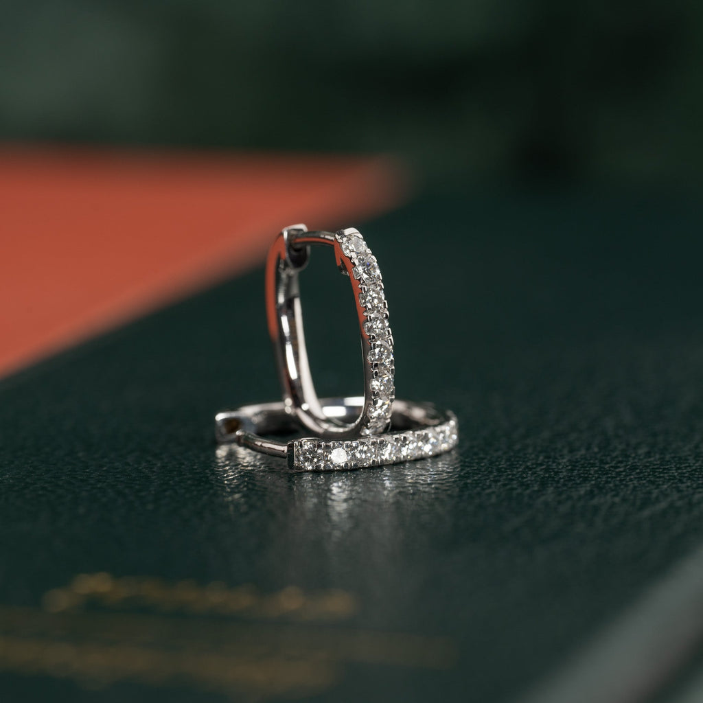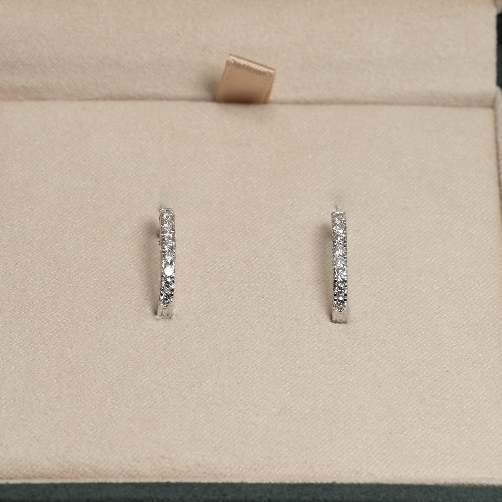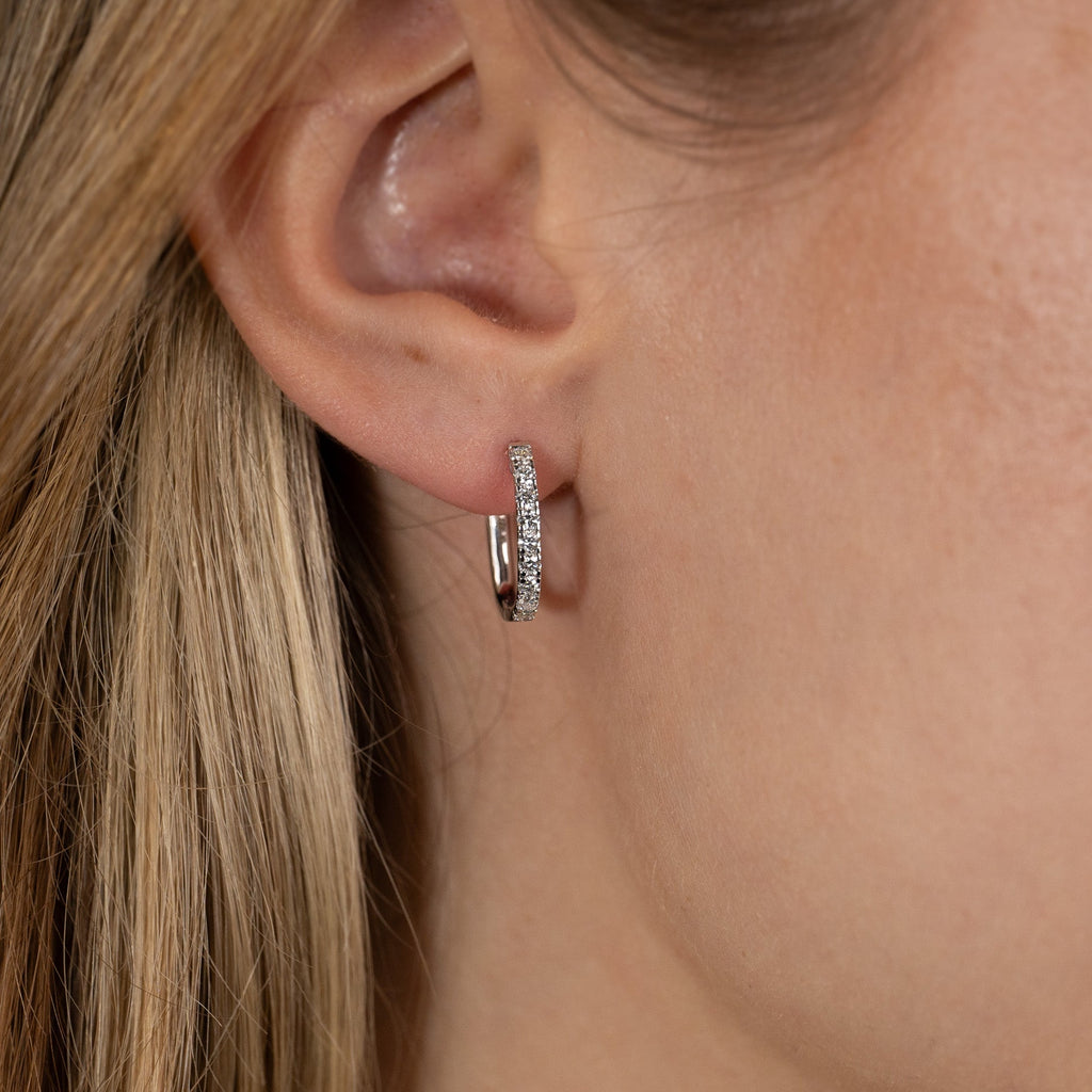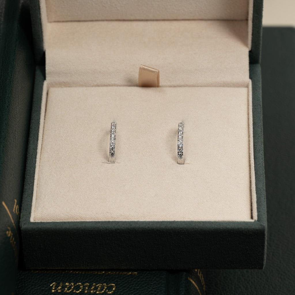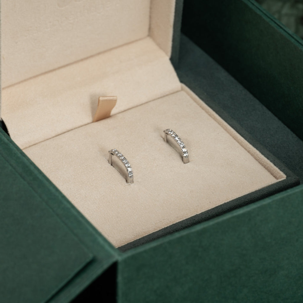 De ovale diamantcreolene er laget i 14 kt. massivt hvitt gull med 18 lab-grown diamanter med en total vekt på 0,45 ct. Diamantene har fargen E/F (River) og klarhet VVS. Smykket er laget med omtanke; diamantene er produsert med blant annet solenergi, og gullet er 100 % sertifisert resirkulert.