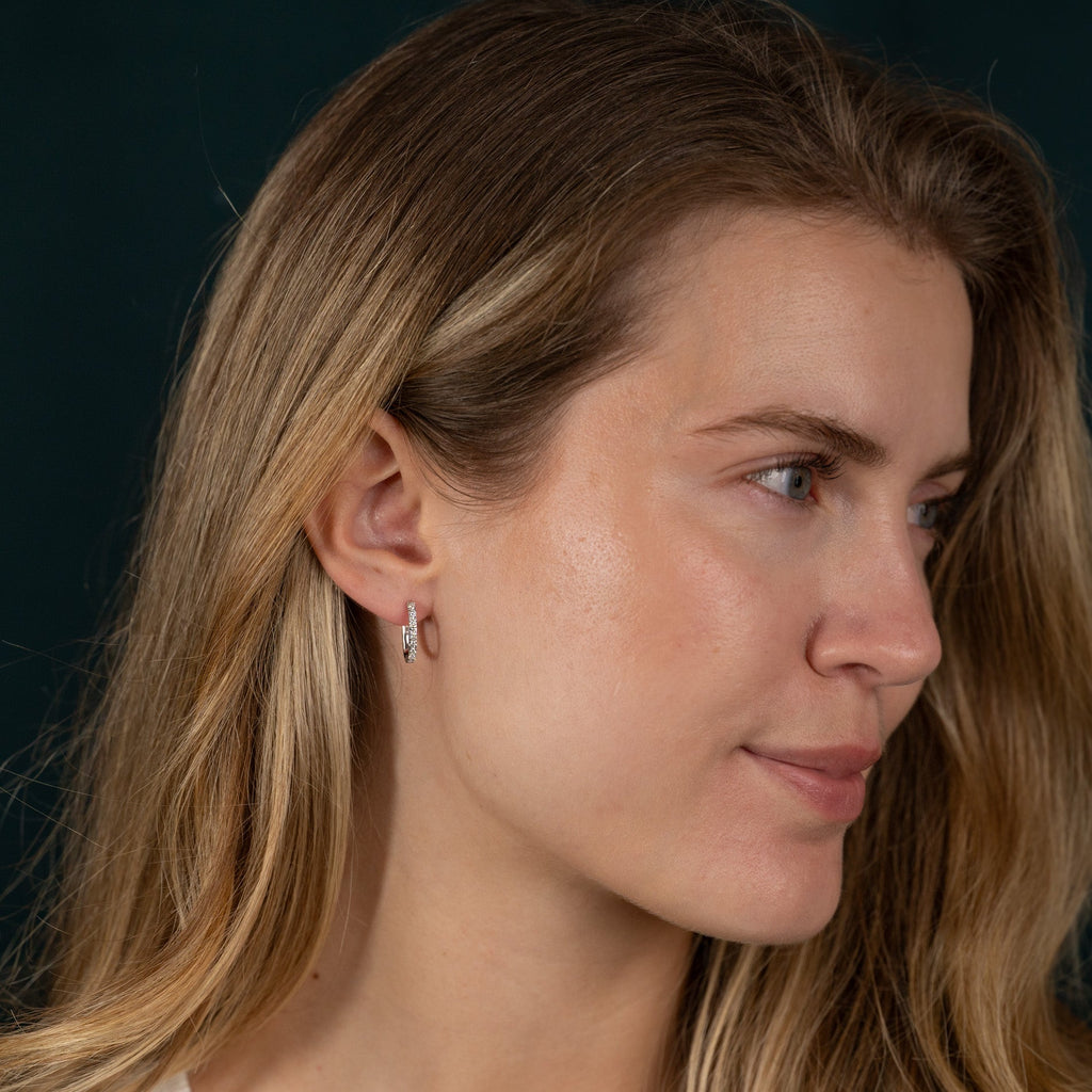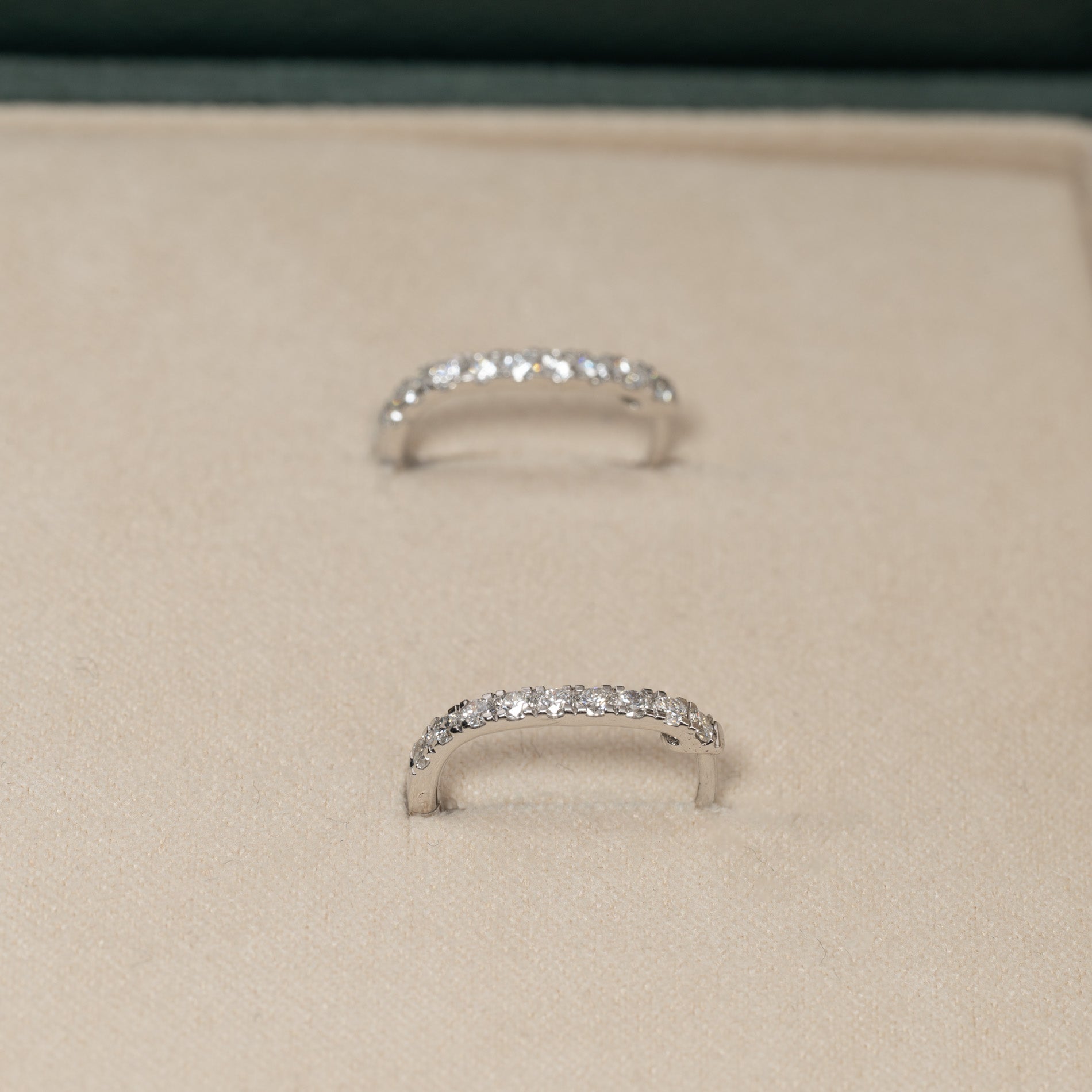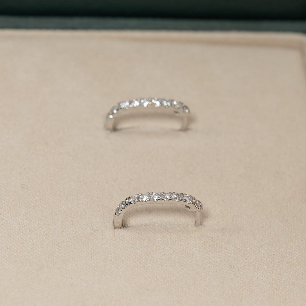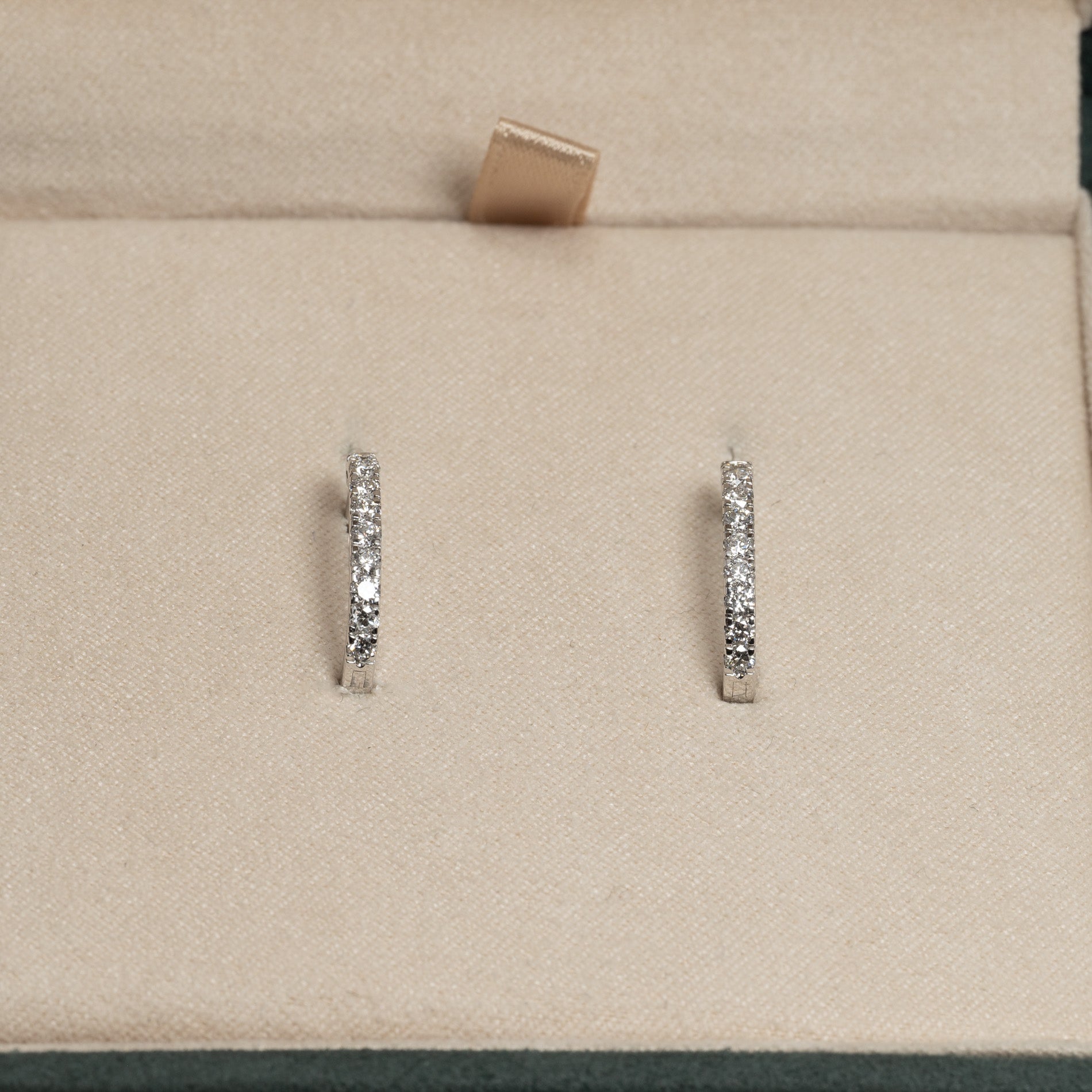 De ovale diamantcreolene er laget i 14 kt. massivt hvitt gull med 18 lab-grown diamanter med en total vekt på 0,45 ct. Diamantene har fargen E/F (River) og klarhet VVS. Smykket er laget med omtanke; diamantene er produsert med blant annet solenergi, og gullet er 100 % sertifisert resirkulert.