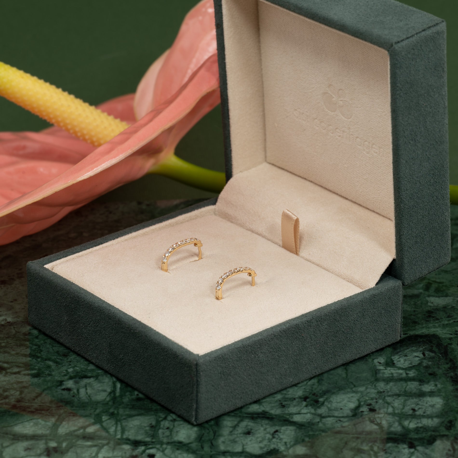 Smykket er pent og sikkert plassert i en smykkeboks som er trukket med vegansk semsket skinn.